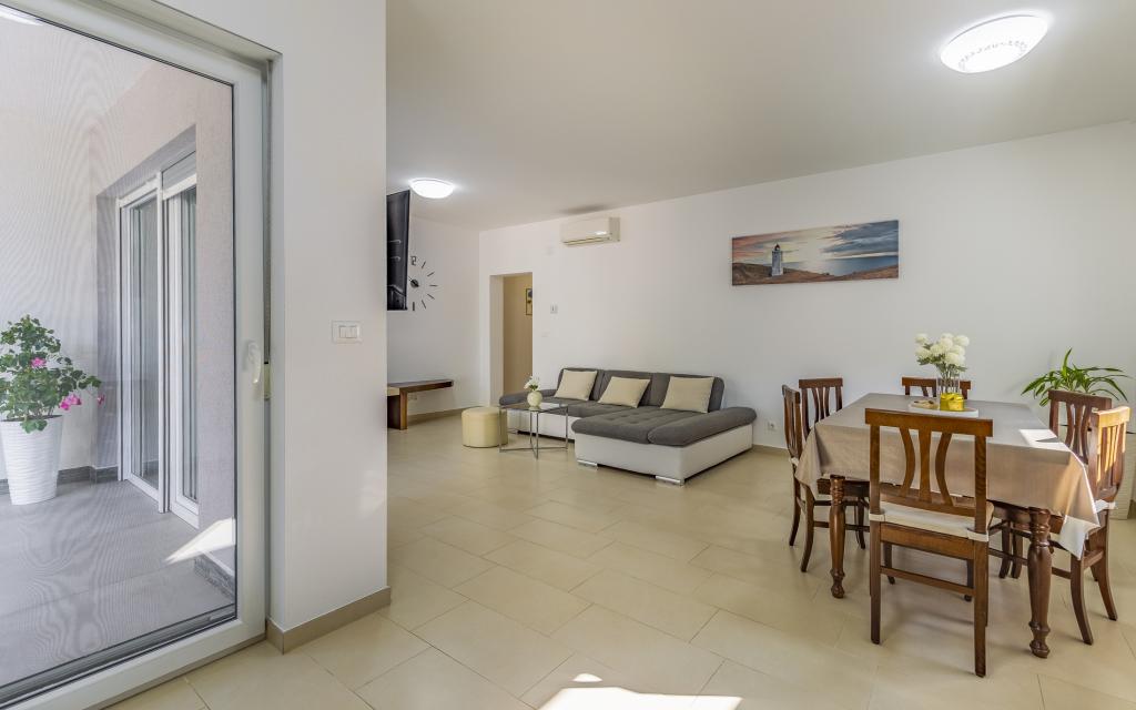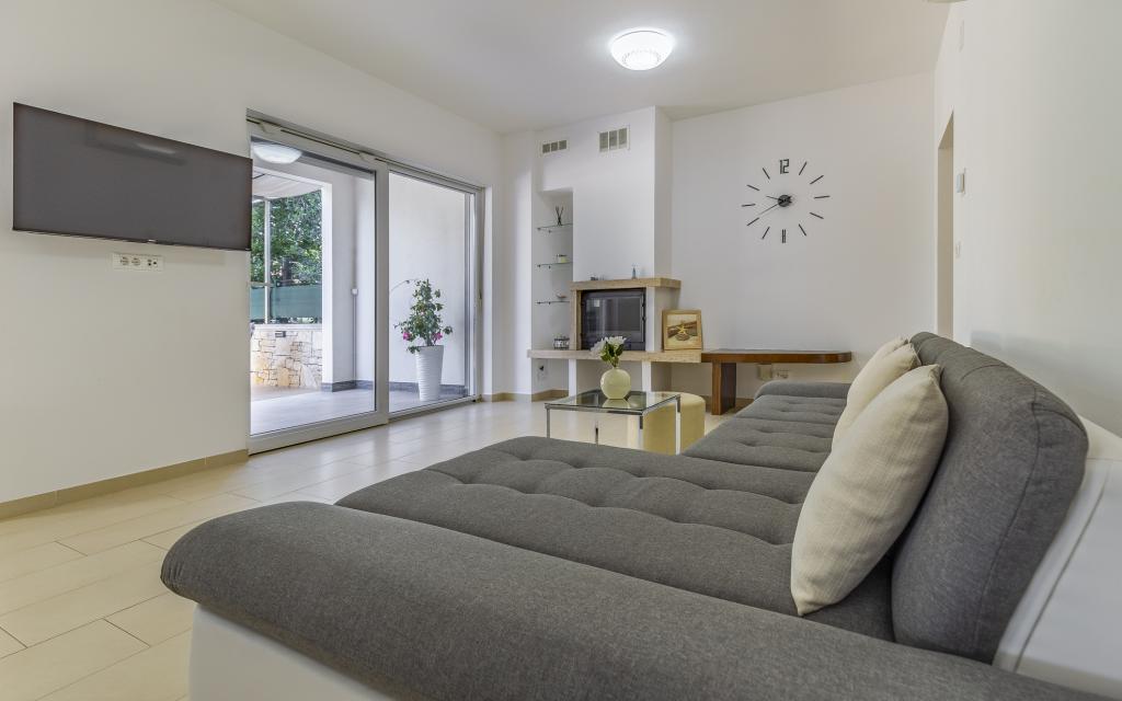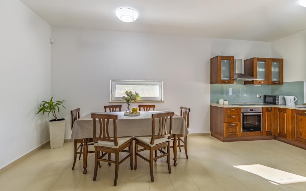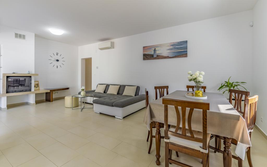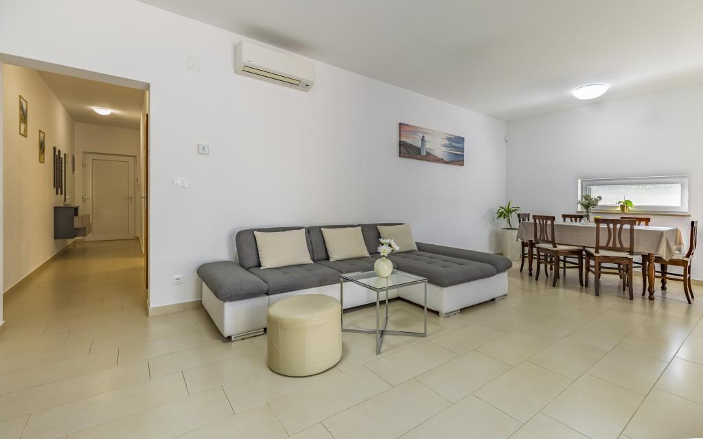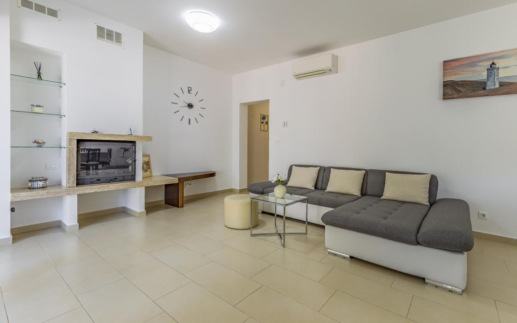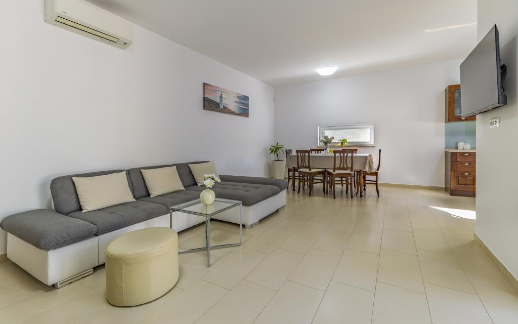 Apartament complet utilat (80 m²) într-o locație excelentă, într-o zonă liniștită din Banjol. Proprietatea este situată la 200 m de mare și la 300 m de cele mai frumoase plaje din zonă. Apartamentul este situat la parterul unei clădiri rezidențiale cu un total de trei apartamente și dispune de o grădină privată mare, împrejmuită (100 m²), cu intrare separată și loc de parcare propriu situat chiar lângă apartament și grădină. Grădina are o terasă mare acoperită, cu o masă și șase scaune, patru șezlonguri, un duș exterior și un grătar, care este spațiul principal pentru socializare și relaxare plăcută, cu multă intimitate, soare, dar și umbră. Întreaga clădire este înconjurată de un zid de piatră, iar la intrare există uși glisante. Apartamentul este format din 2 dormitoare cu paturi duble, 2 băi cu toaletă și duș, un living spațios cu o canapea extensibilă, o sufragerie și o bucătărie. Apartamentul este climatizat, iar iarna este încălzit cu încălzire prin pardoseală și are un șemineu interior, așa că este potrivit și pentru ședere în lunile mai reci de toamnă și iarnă.