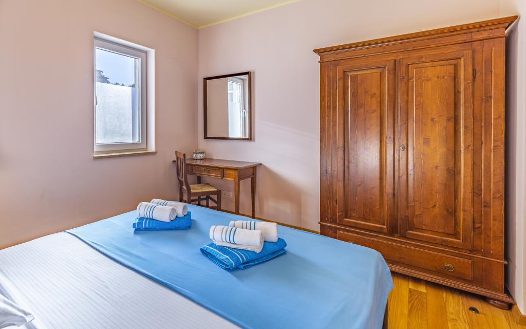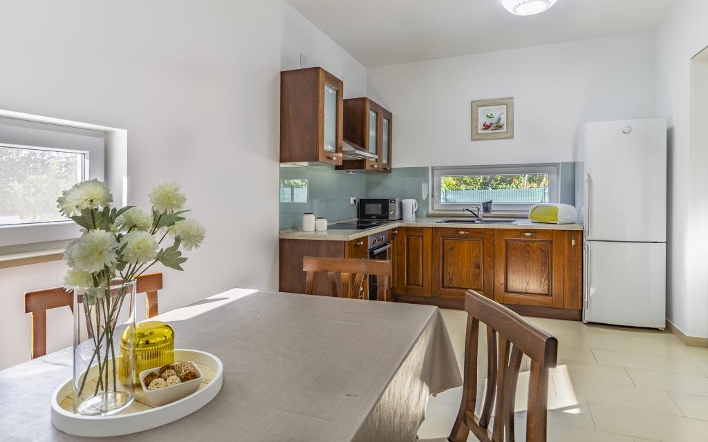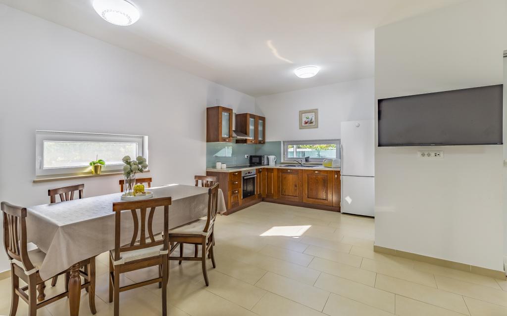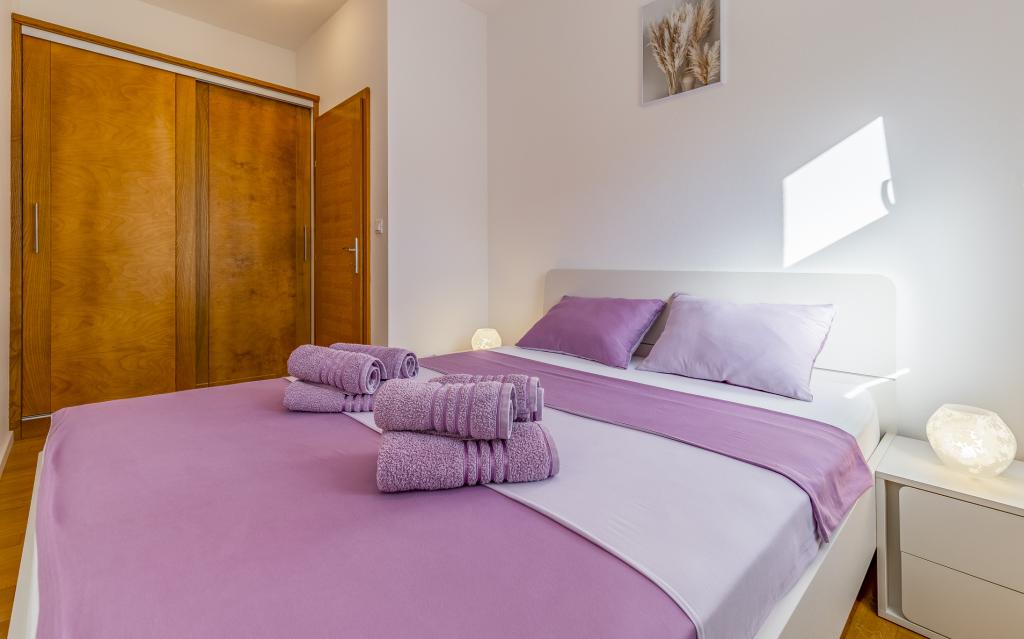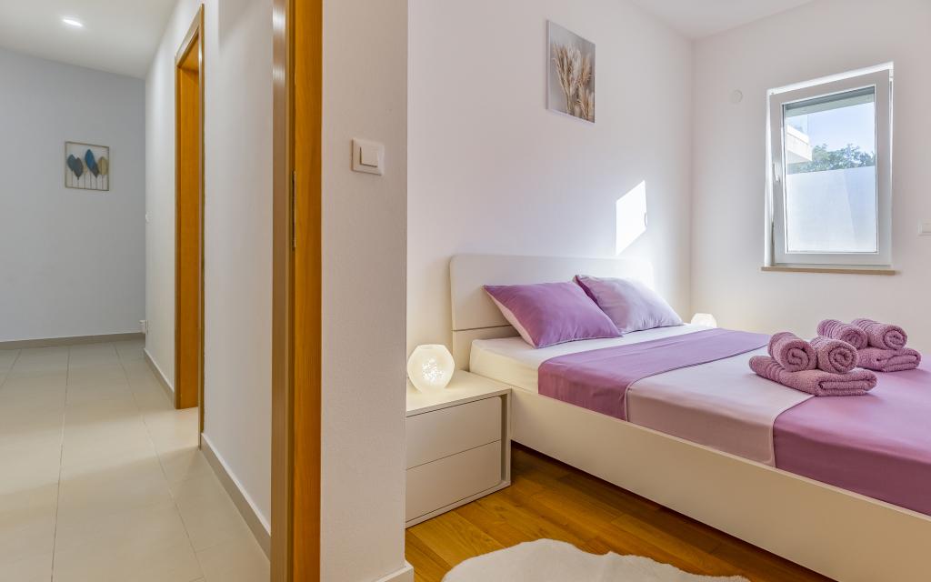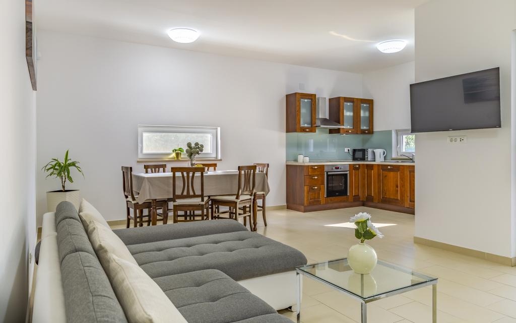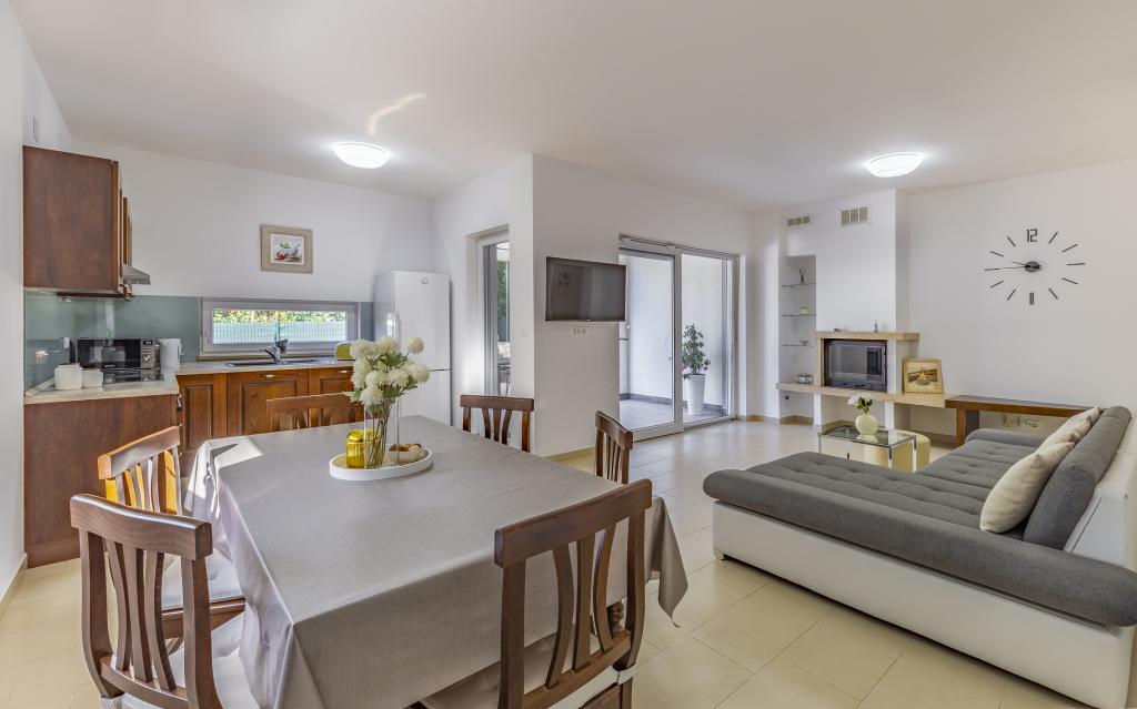 Apartament complet utilat (80 m²) într-o locație excelentă, într-o zonă liniștită din Banjol. Proprietatea este situată la 200 m de mare și la 300 m de cele mai frumoase plaje din zonă. Apartamentul este situat la parterul unei clădiri rezidențiale cu un total de trei apartamente și dispune de o grădină privată mare, împrejmuită (100 m²), cu intrare separată și loc de parcare propriu situat chiar lângă apartament și grădină. Grădina are o terasă mare acoperită, cu o masă și șase scaune, patru șezlonguri, un duș exterior și un grătar, care este spațiul principal pentru socializare și relaxare plăcută, cu multă intimitate, soare, dar și umbră. Întreaga clădire este înconjurată de un zid de piatră, iar la intrare există uși glisante. Apartamentul este format din 2 dormitoare cu paturi duble, 2 băi cu toaletă și duș, un living spațios cu o canapea extensibilă, o sufragerie și o bucătărie. Apartamentul este climatizat, iar iarna este încălzit cu încălzire prin pardoseală și are un șemineu interior, așa că este potrivit și pentru ședere în lunile mai reci de toamnă și iarnă.