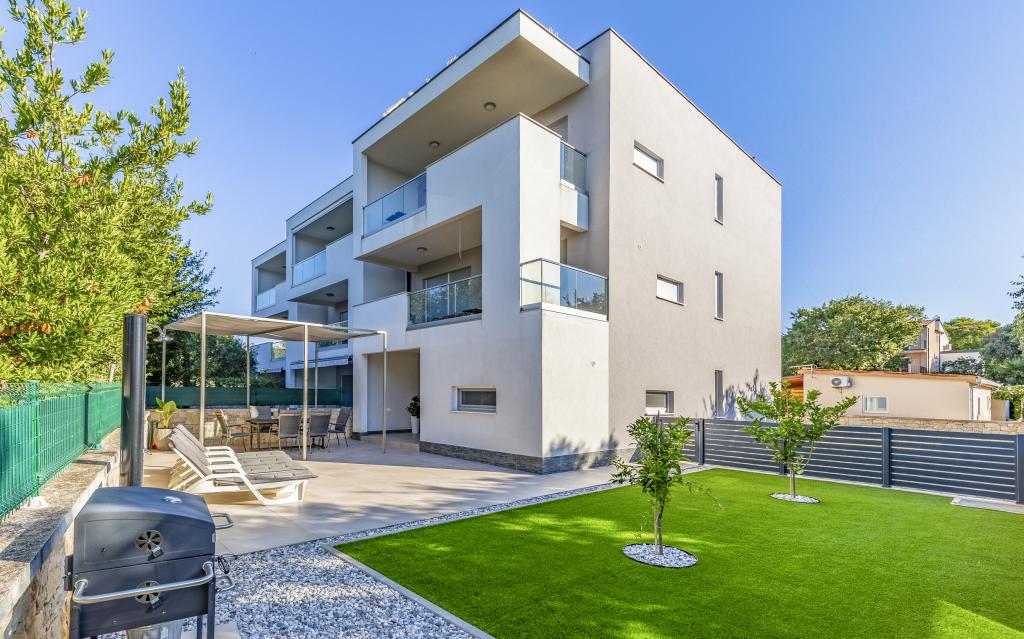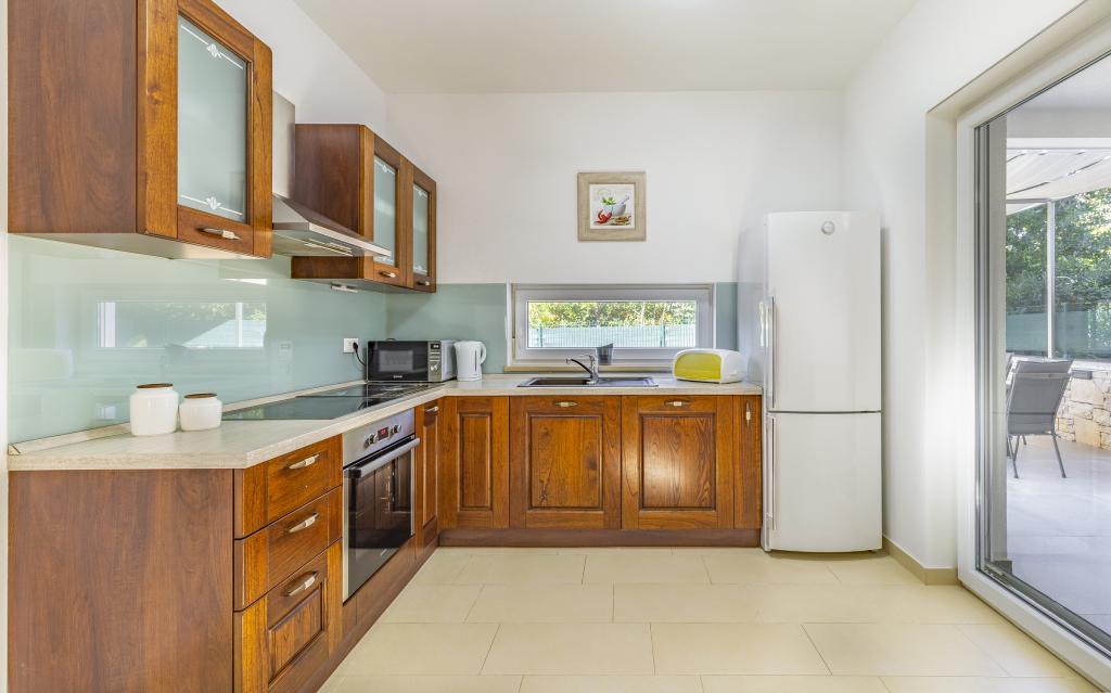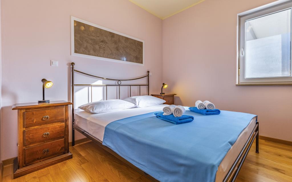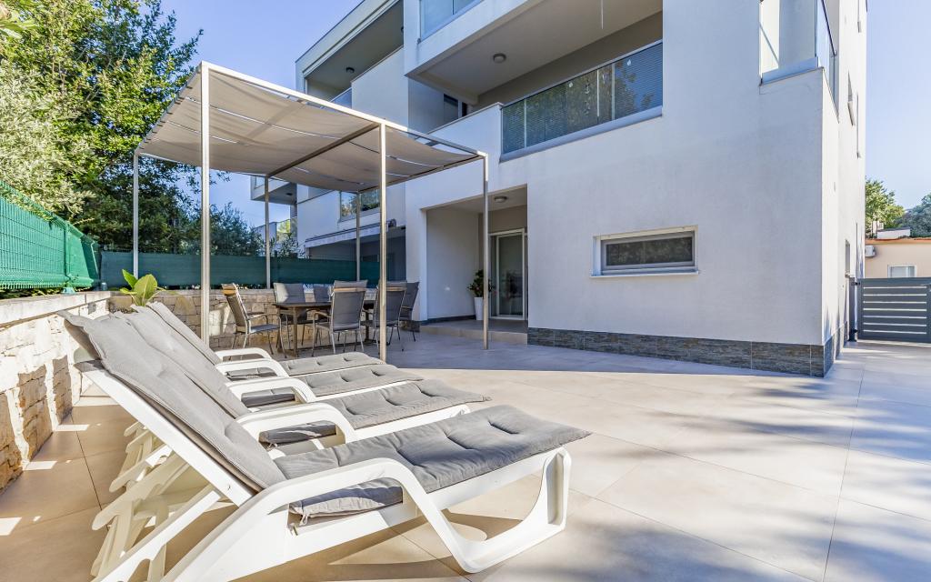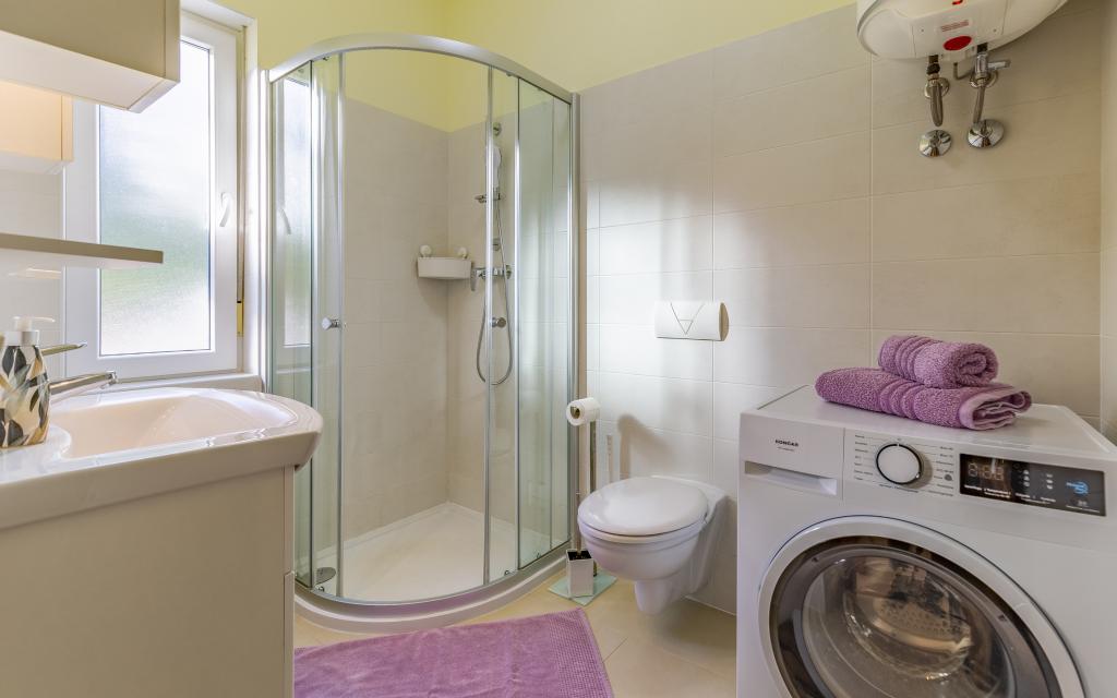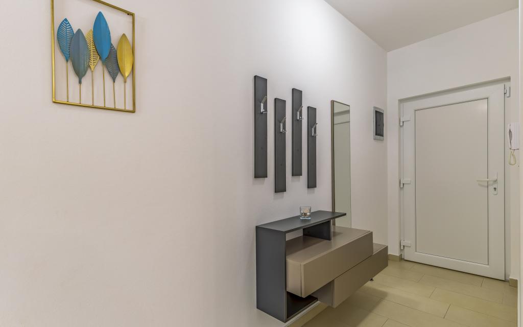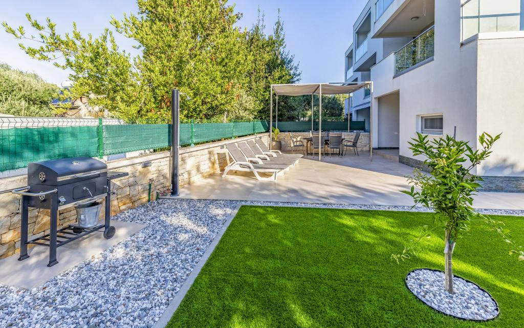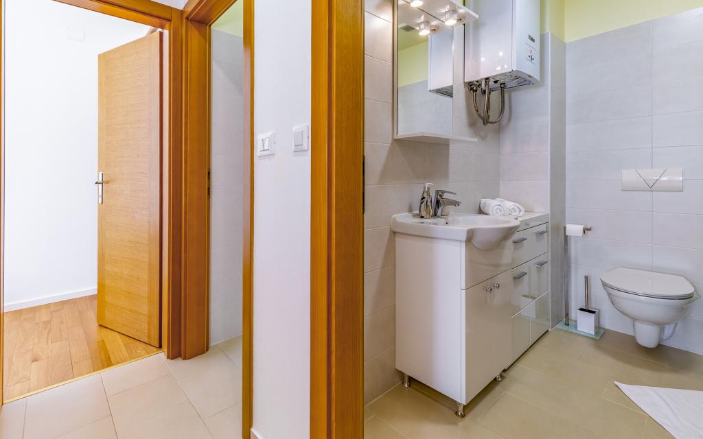 Apartament complet utilat (80 m²) într-o locație excelentă, într-o zonă liniștită din Banjol. Proprietatea este situată la 200 m de mare și la 300 m de cele mai frumoase plaje din zonă. Apartamentul este situat la parterul unei clădiri rezidențiale cu un total de trei apartamente și dispune de o grădină privată mare, împrejmuită (100 m²), cu intrare separată și loc de parcare propriu situat chiar lângă apartament și grădină. Grădina are o terasă mare acoperită, cu o masă și șase scaune, patru șezlonguri, un duș exterior și un grătar, care este spațiul principal pentru socializare și relaxare plăcută, cu multă intimitate, soare, dar și umbră. Întreaga clădire este înconjurată de un zid de piatră, iar la intrare există uși glisante. Apartamentul este format din 2 dormitoare cu paturi duble, 2 băi cu toaletă și duș, un living spațios cu o canapea extensibilă, o sufragerie și o bucătărie. Apartamentul este climatizat, iar iarna este încălzit cu încălzire prin pardoseală și are un șemineu interior, așa că este potrivit și pentru ședere în lunile mai reci de toamnă și iarnă.