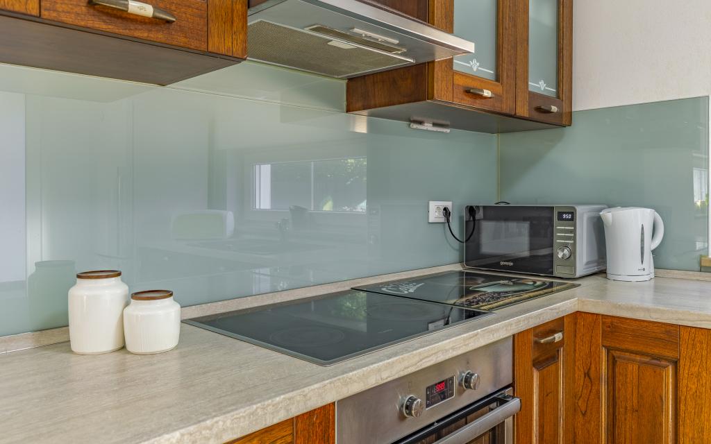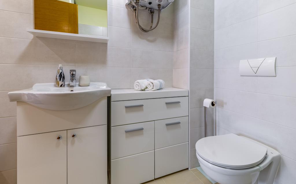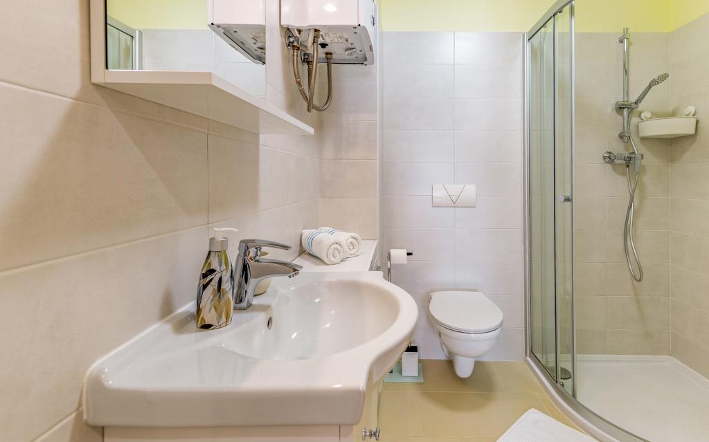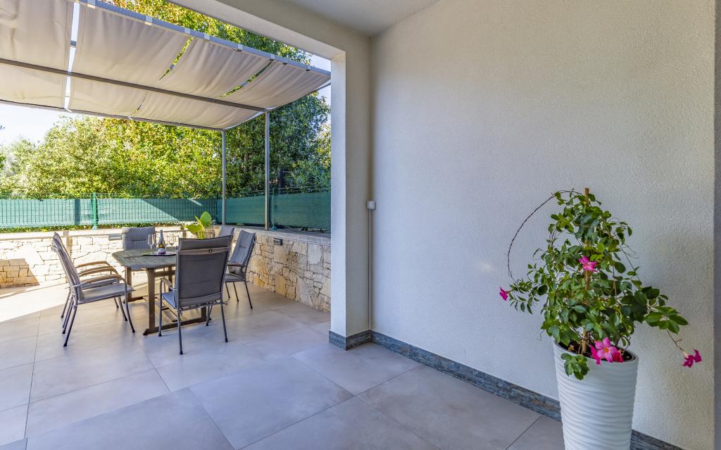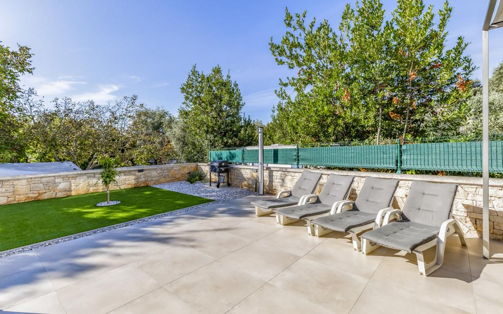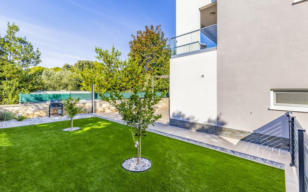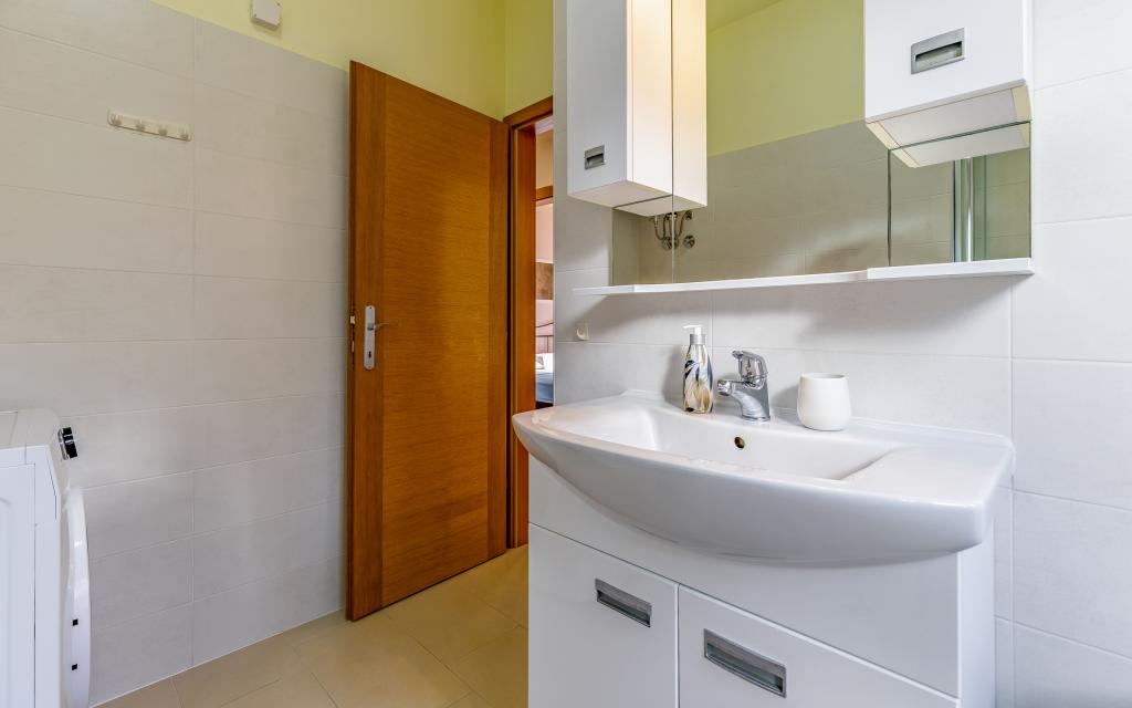 Apartament complet utilat (80 m²) într-o locație excelentă, într-o zonă liniștită din Banjol. Proprietatea este situată la 200 m de mare și la 300 m de cele mai frumoase plaje din zonă. Apartamentul este situat la parterul unei clădiri rezidențiale cu un total de trei apartamente și dispune de o grădină privată mare, împrejmuită (100 m²), cu intrare separată și loc de parcare propriu situat chiar lângă apartament și grădină. Grădina are o terasă mare acoperită, cu o masă și șase scaune, patru șezlonguri, un duș exterior și un grătar, care este spațiul principal pentru socializare și relaxare plăcută, cu multă intimitate, soare, dar și umbră. Întreaga clădire este înconjurată de un zid de piatră, iar la intrare există uși glisante. Apartamentul este format din 2 dormitoare cu paturi duble, 2 băi cu toaletă și duș, un living spațios cu o canapea extensibilă, o sufragerie și o bucătărie. Apartamentul este climatizat, iar iarna este încălzit cu încălzire prin pardoseală și are un șemineu interior, așa că este potrivit și pentru ședere în lunile mai reci de toamnă și iarnă.
