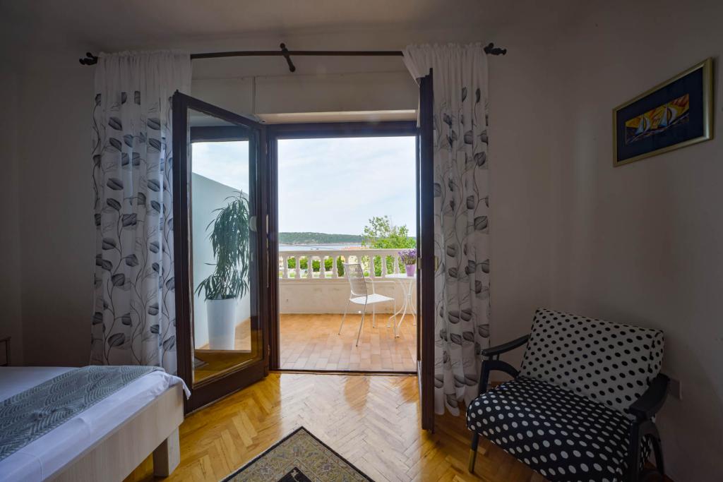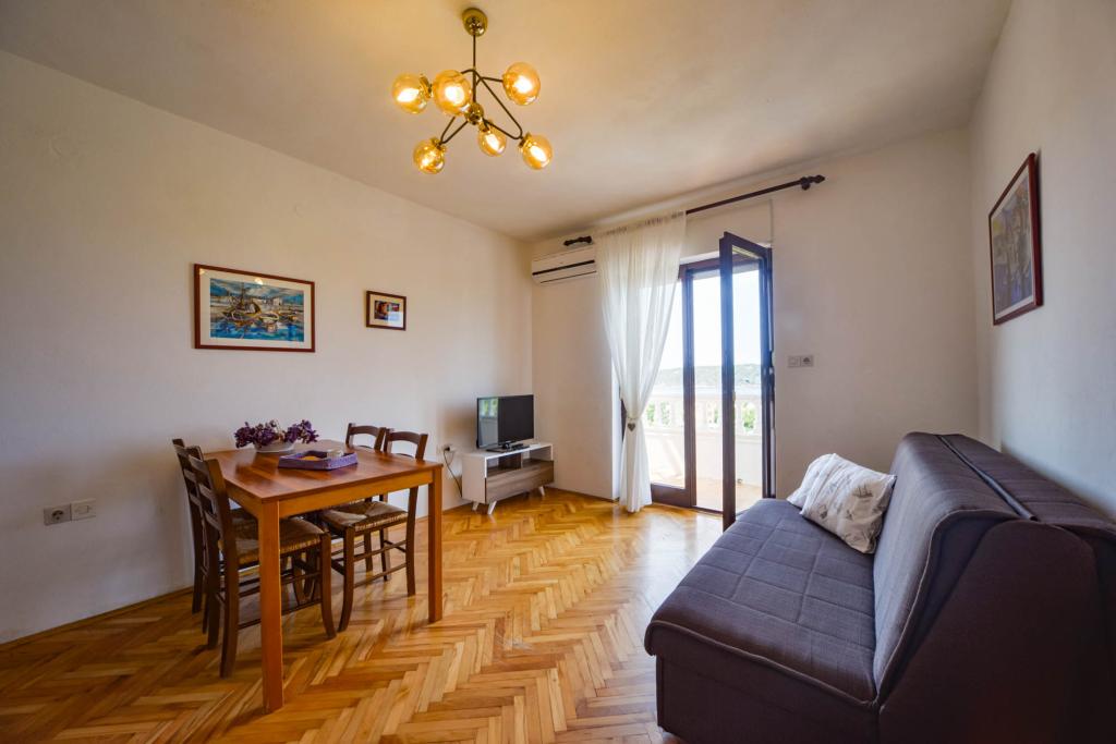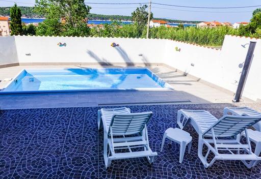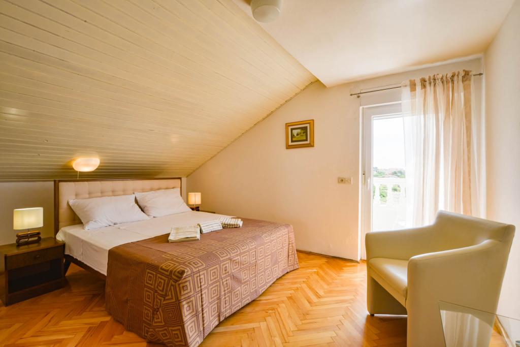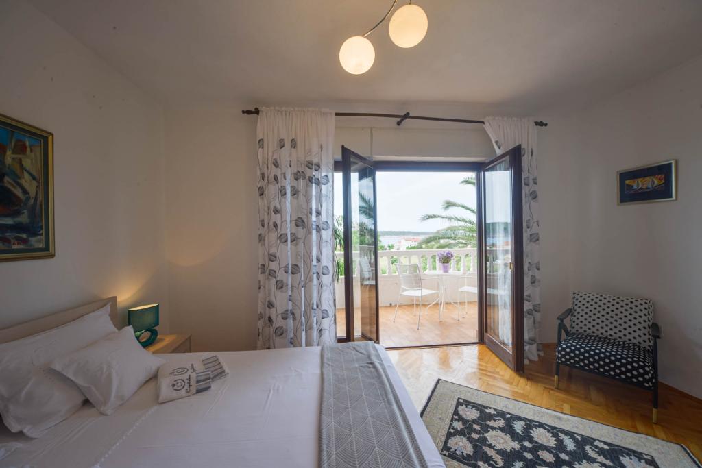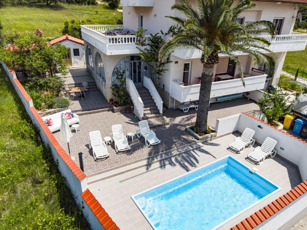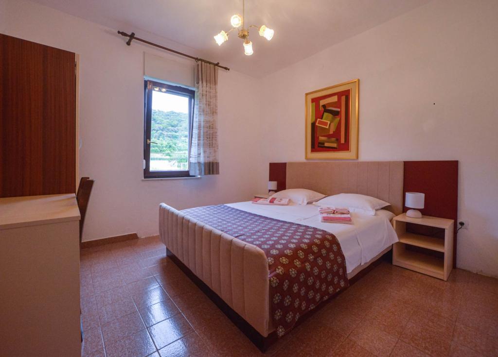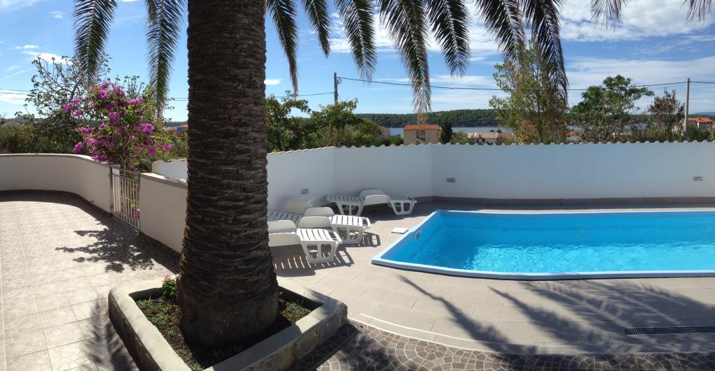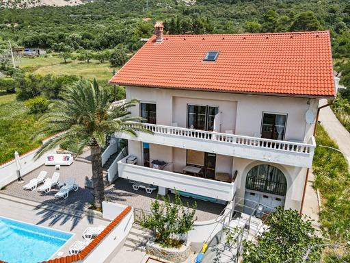 Apartamente spațioase complet echipate, cu vedere la Canalul Bărbat și la Sfântul Damjan (rămășițele unei fortărețe cercetașe bizantine din secolul al VI-lea), cu suficient spațiu exterior pentru ca diferite grupuri să aibă propria intimitate, fie pe terasa spațioasă, la piscină sau în foișorul umbrit de lângă grătar. Casa este potrivită și pentru închiriere completă pentru familii (12 persoane). Copiii și animalele de companie sunt binevenite. Se află la mai puțin de 5 minute de mers pe jos de promenada de pe malul mării cu plaje, restaurante și cafenele - 300 m.