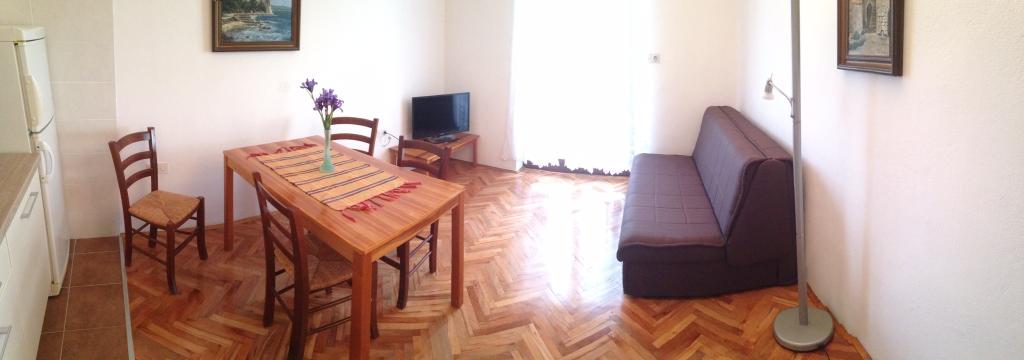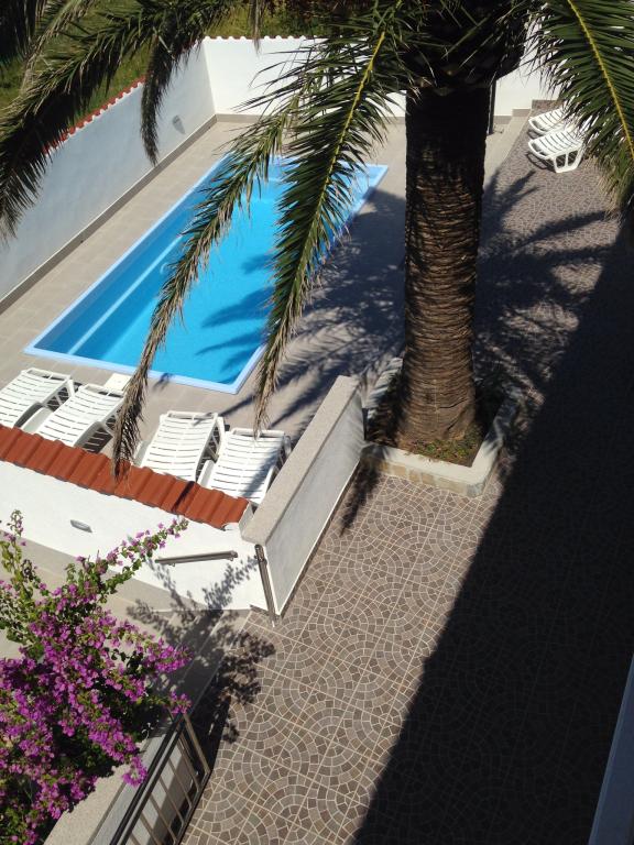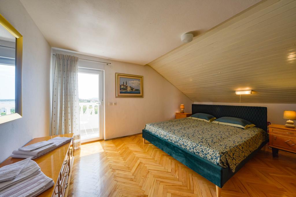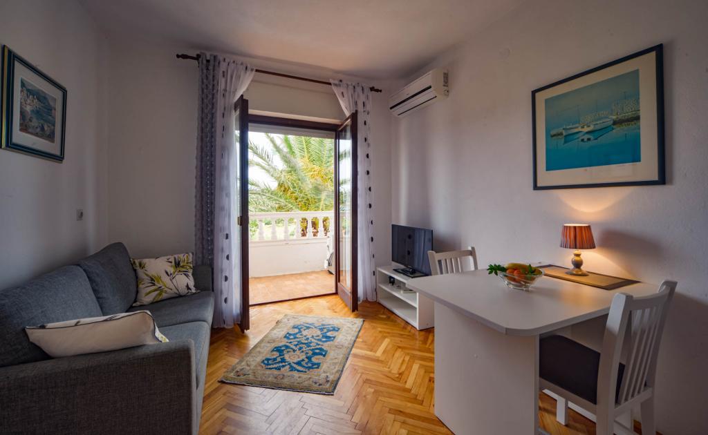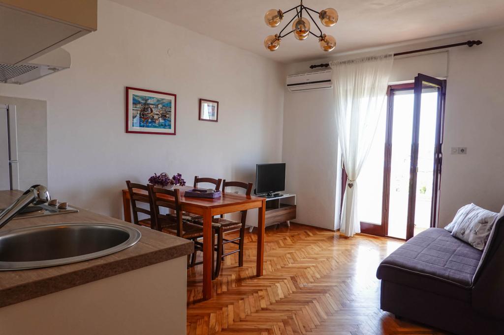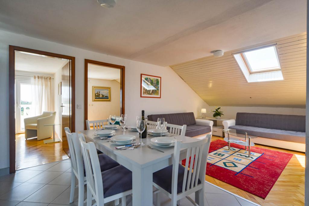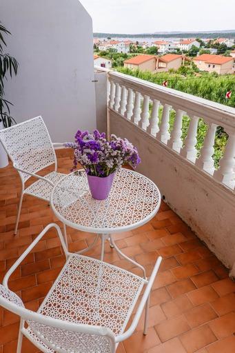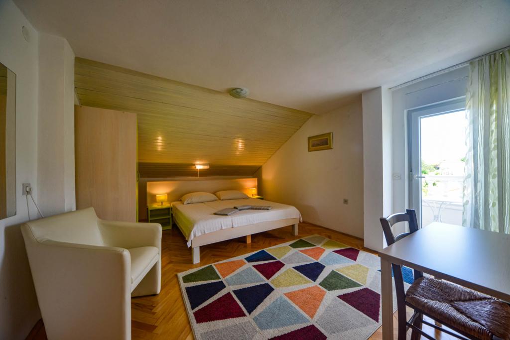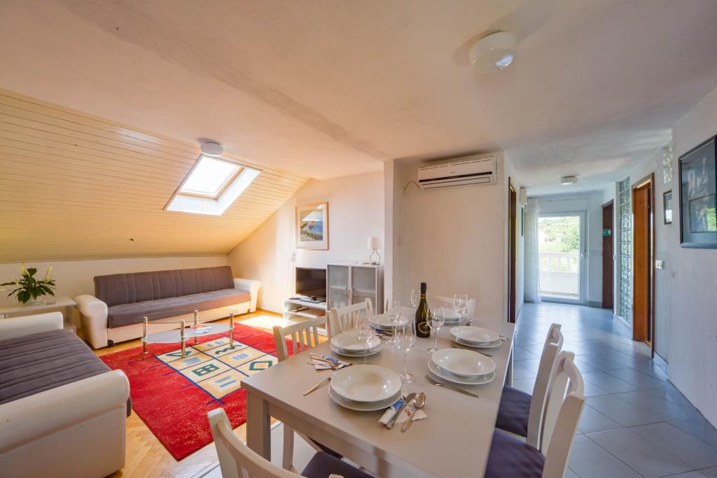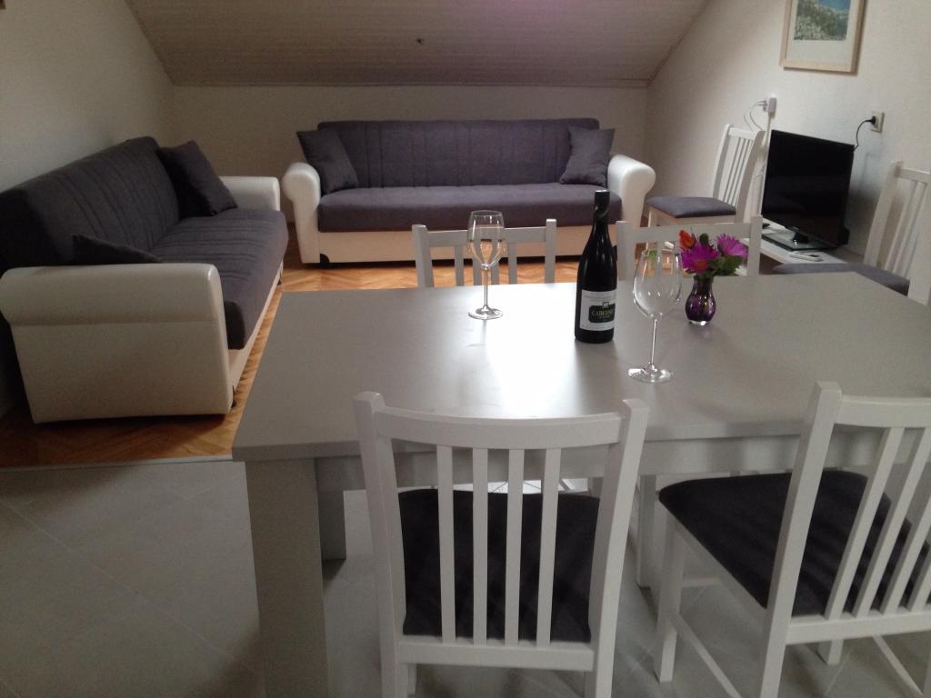 Apartamente spațioase complet echipate, cu vedere la Canalul Bărbat și la Sfântul Damjan (rămășițele unei fortărețe cercetașe bizantine din secolul al VI-lea), cu suficient spațiu exterior pentru ca diferite grupuri să aibă propria intimitate, fie pe terasa spațioasă, la piscină sau în foișorul umbrit de lângă grătar. Casa este potrivită și pentru închiriere completă pentru familii (12 persoane). Copiii și animalele de companie sunt binevenite. Se află la mai puțin de 5 minute de mers pe jos de promenada de pe malul mării cu plaje, restaurante și cafenele - 300 m.
