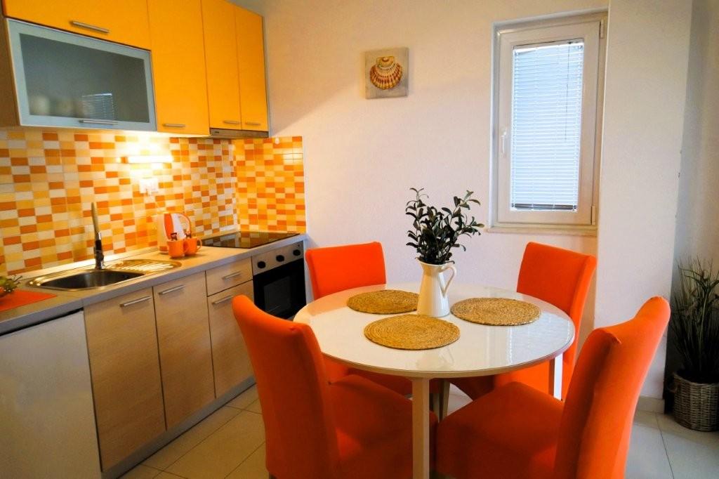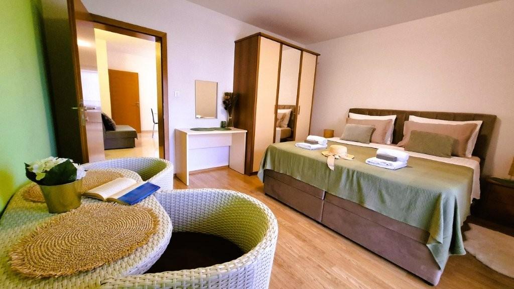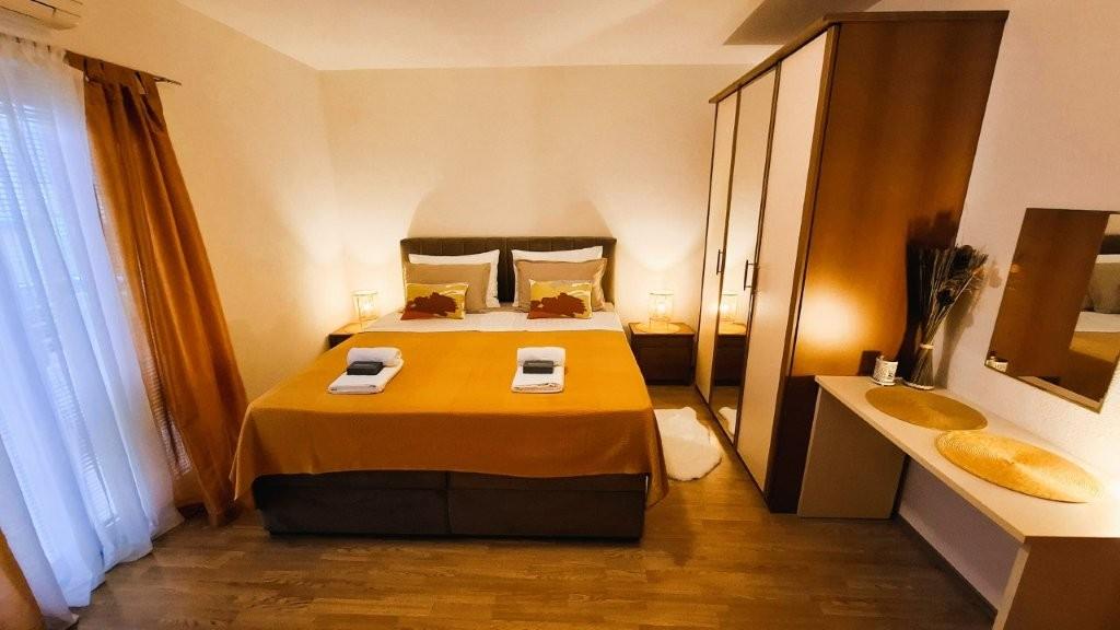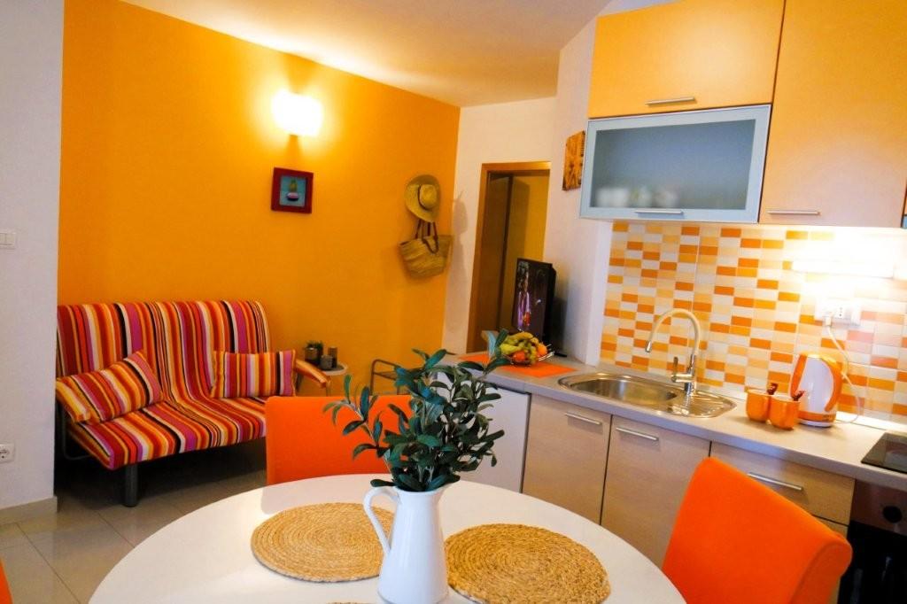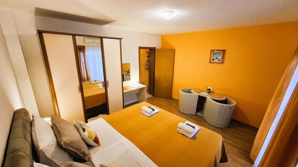 Apartamentele Harmonia modern echipate sunt alegerea perfectă pentru o vacanță confortabilă în familie sau pentru cuplurile care caută cazare confortabilă în apropierea plajei. La aproximativ 200 de metri de plaja Nikola, într-o zonă atractivă din Baška Vodă și nu departe de centru, cu o vedere frumoasă laterală a mării și a muntelui Biokovo. Oferim cazare în apartamente verzi și portocalii, destinate 2 adulți cu 2 copii mici și într-un apartament turcoaz pentru 2 adulți cu ev. 1 copil. Fiecare apartament este de 40m2, are un dormitor mare, zonă de living care include o bucătărie complet utilată, masă și scaune și o canapea extensibilă, baie și terasă. Apartamentele verzi și portocalii sunt situate la primul etaj al casei de familie și au balcoane mari, cu vedere la mare, în timp ce apartamentul turcoaz este situat la subsolul casei, fără vedere la mare, cu o terasă mare și scaune. Fiecare apartament este complet echipat, oferind curățenie și culori strălucitoare, care cu siguranță te vor face să te simți confortabil și să ai o vacanță frumoasă.
