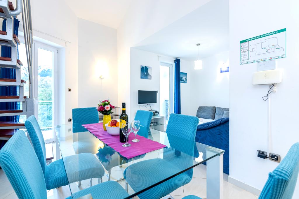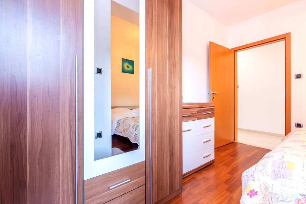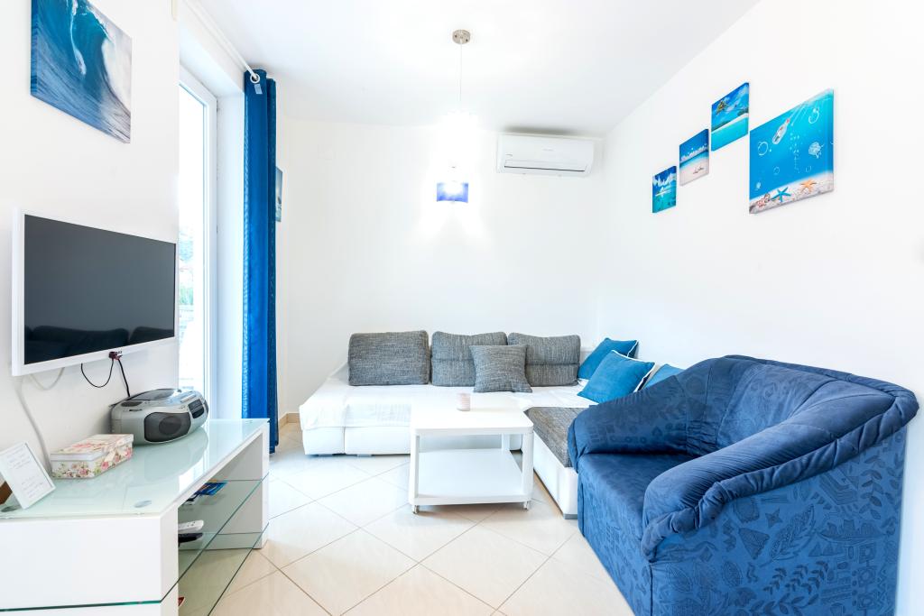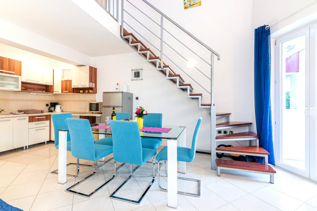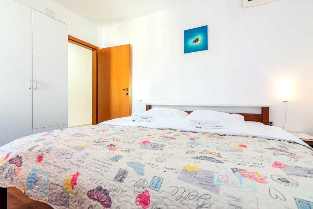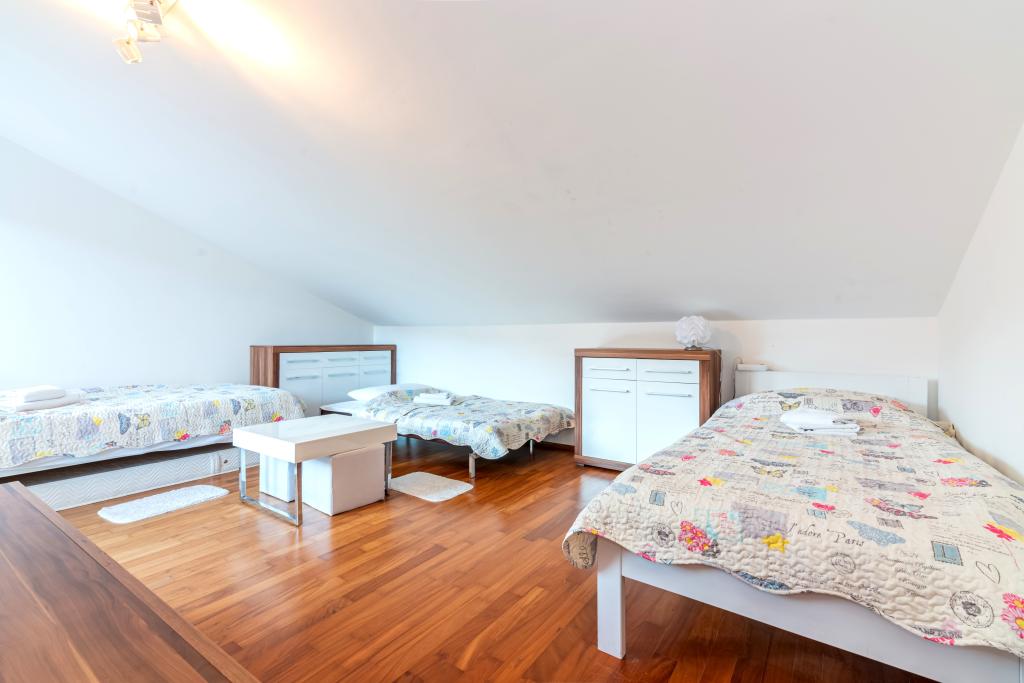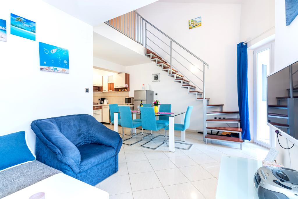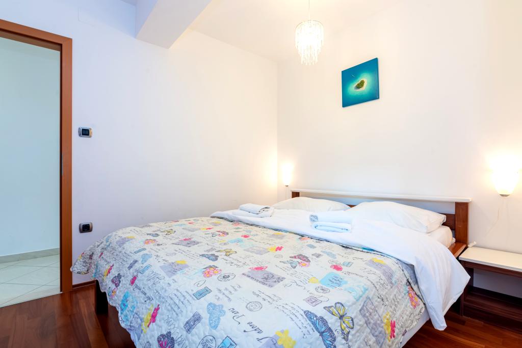 Apartamentul este situat la etajele 2 si 3. Dispune de 2 camere duble cu paturi duble, 1 camera dubla cu paturi de o persoana, living cu canapea pentru 2 persoane, 2 bai, bucatarie complet utilata si sufragerie. Acest apartament este situat la aproximativ 3 minute de mers pe jos de plaja centrală. Situat într-o zonă liniștită, acest apartament modern este dotat cu 3 aparate de aer condiționat, internet WiFi gratuit, SAT-TV, o terasă spațioasă și parcare privată gratuită în fața casei. Unitatea este, de asemenea, lângă un mic magazin și restaurant.