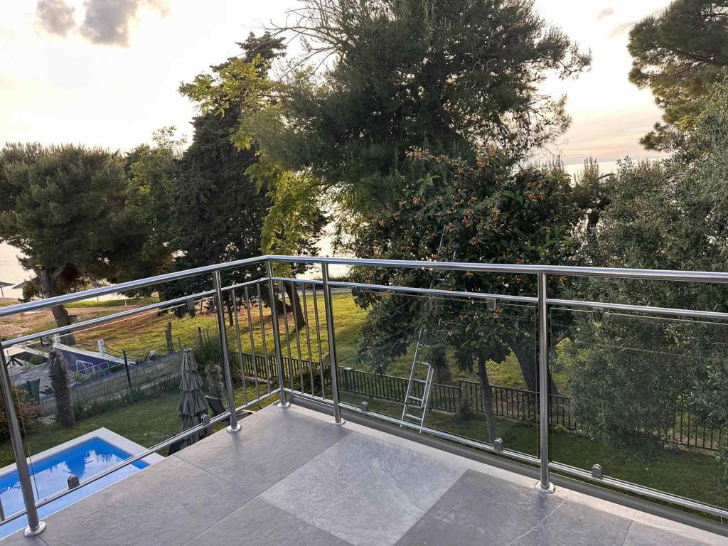 Taxa de rezidenta este inclusa in pret.In zona comuna se afla o frumoasa piscina inconjurata de verdeata cu vedere la mare. Această piscină oferă un spațiu liniștit pentru a vă relaxa și a vă bucura de șezlongurile confortabile unde vă puteți bucura de soare sau vă puteți relaxa la umbra copacilor sau a umbrelelor. Pentru copiii mai mici, există și o piscină mică și puțin adâncă, unde pot înota în siguranță sub supravegherea părinților. Complexul dispune de spatiu mai mult decat suficient pentru toti oaspetii (casa are in total 3 apartamente) cu un numar suficient de sezlonguri si umbrele.