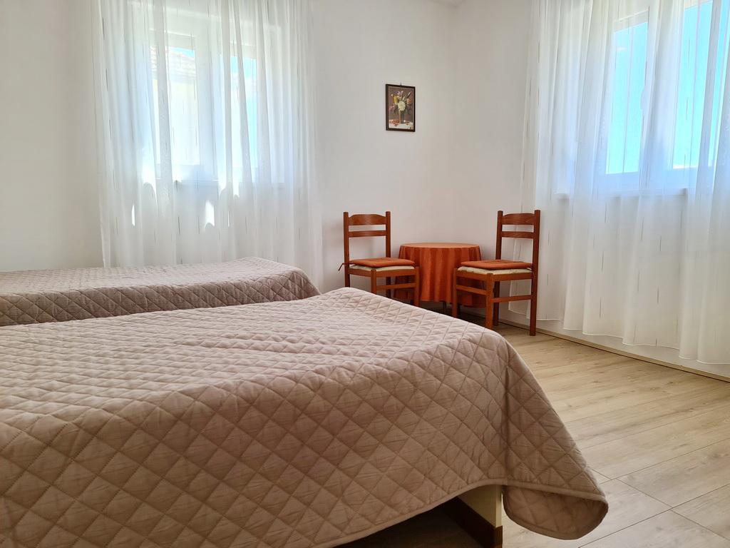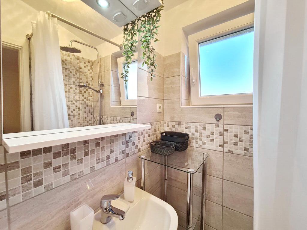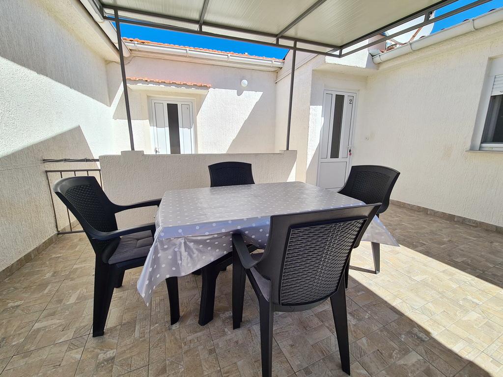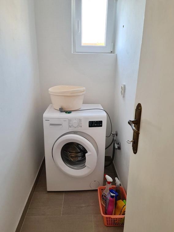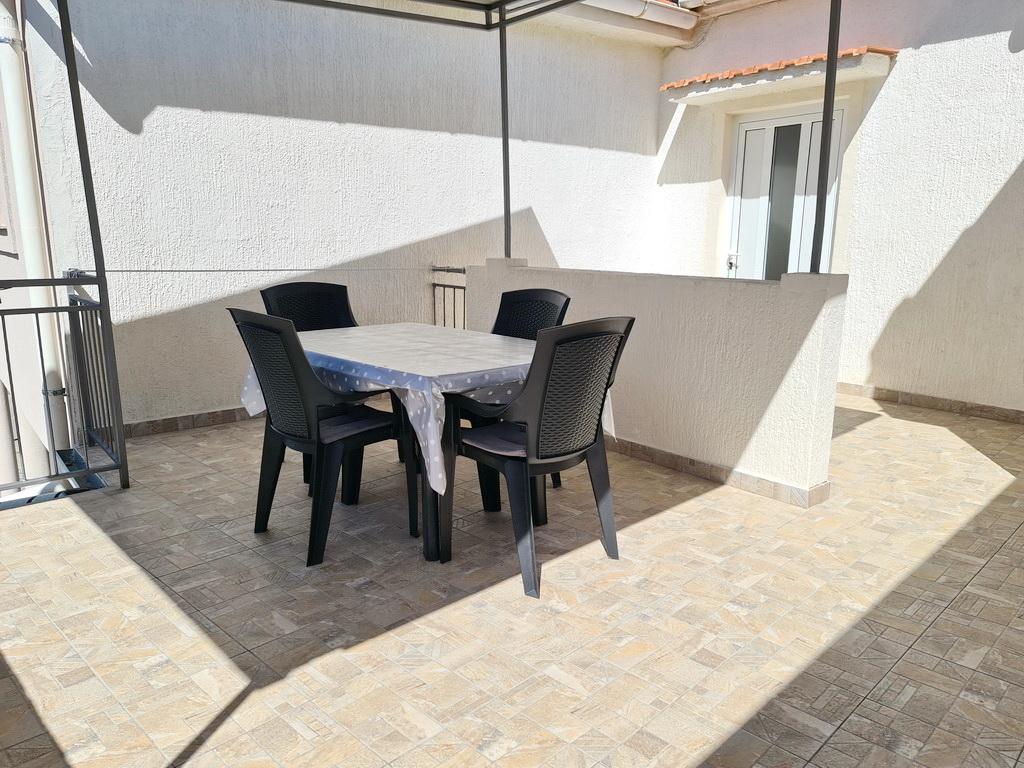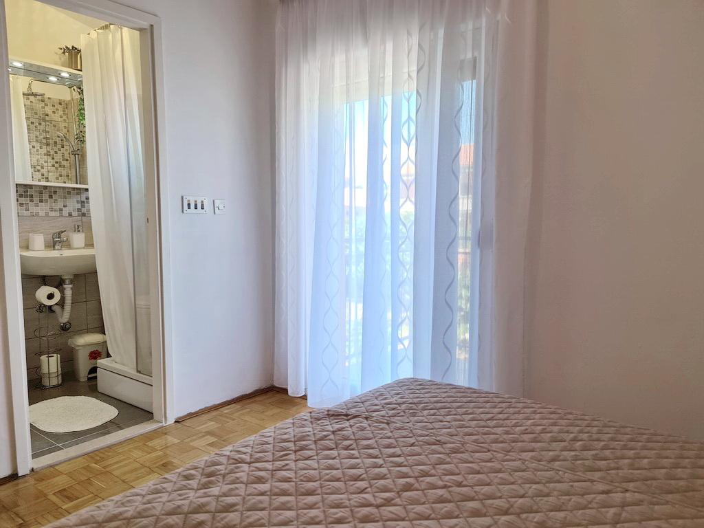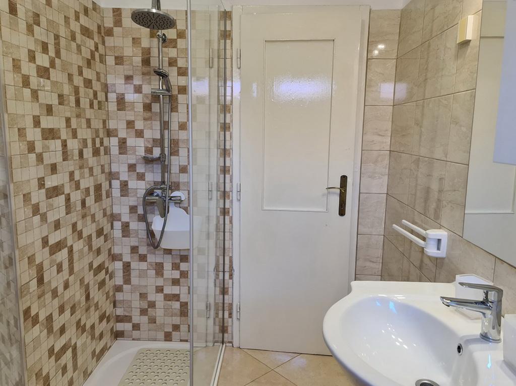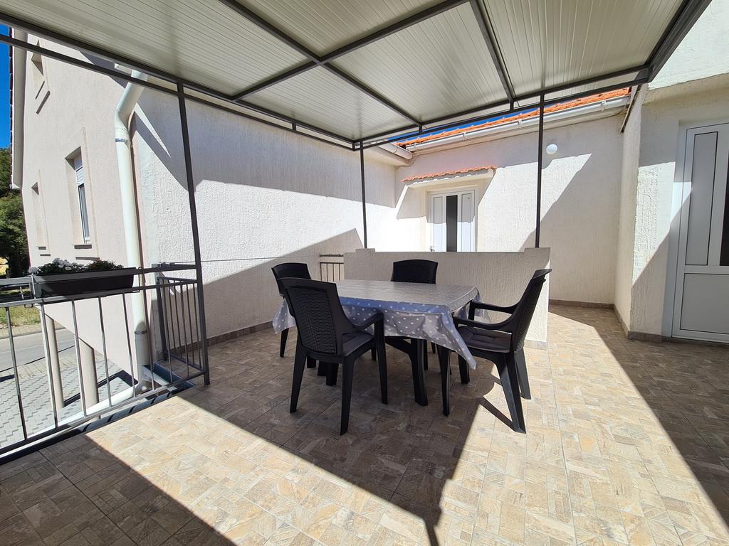 Închiriez un apartament situat la primul etaj al unei case de familie. Este format dintr-o bucătărie cu zonă de luat masa, două dormitoare, fiecare având o baie mică, cămară și hol. Sala de mese are acces la o terasă spațioasă cu vedere la grădină, care oferă oaspeților liniște și intimitate. Parcarea este într-o curte împrejmuită, la umbra viței de vie. Casa este la trei minute de mers pe jos de plaja cu pietricele, la un minut de magazin, la aproximativ zece minute de centru și de malul apei.