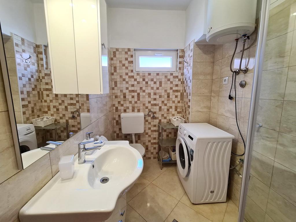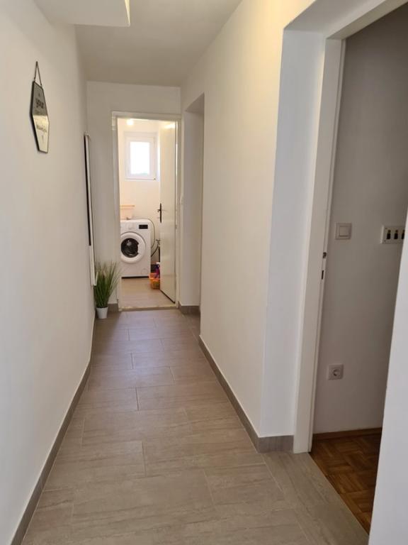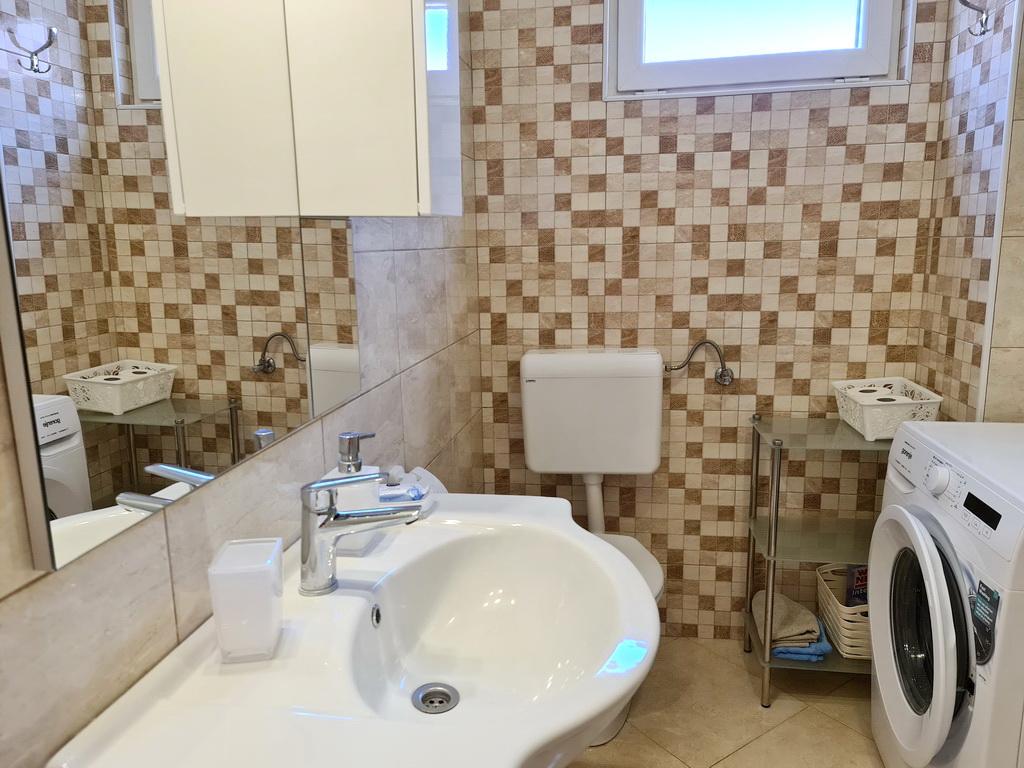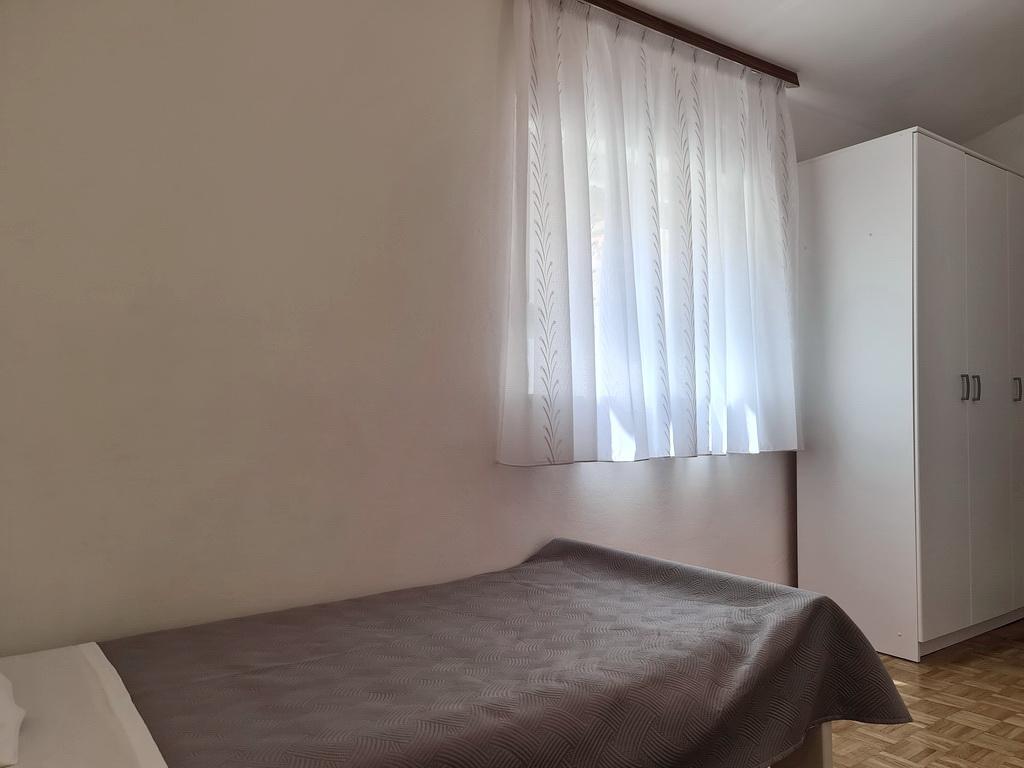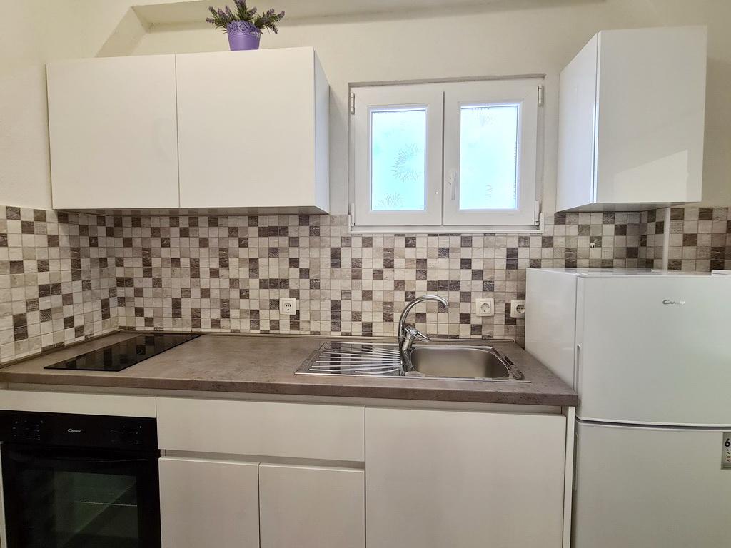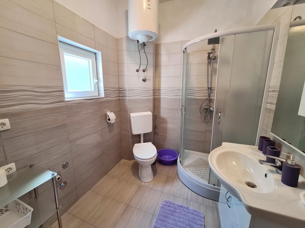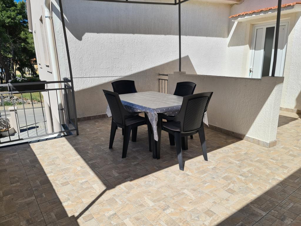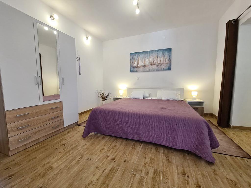 Închiriez un apartament situat la primul etaj al unei case de familie. Este format dintr-o bucătărie cu zonă de luat masa, două dormitoare, fiecare având o baie mică, cămară și hol. Sala de mese are acces la o terasă spațioasă cu vedere la grădină, care oferă oaspeților liniște și intimitate. Parcarea este într-o curte împrejmuită, la umbra viței de vie. Casa este la trei minute de mers pe jos de plaja cu pietricele, la un minut de magazin, la aproximativ zece minute de centru și de malul apei.