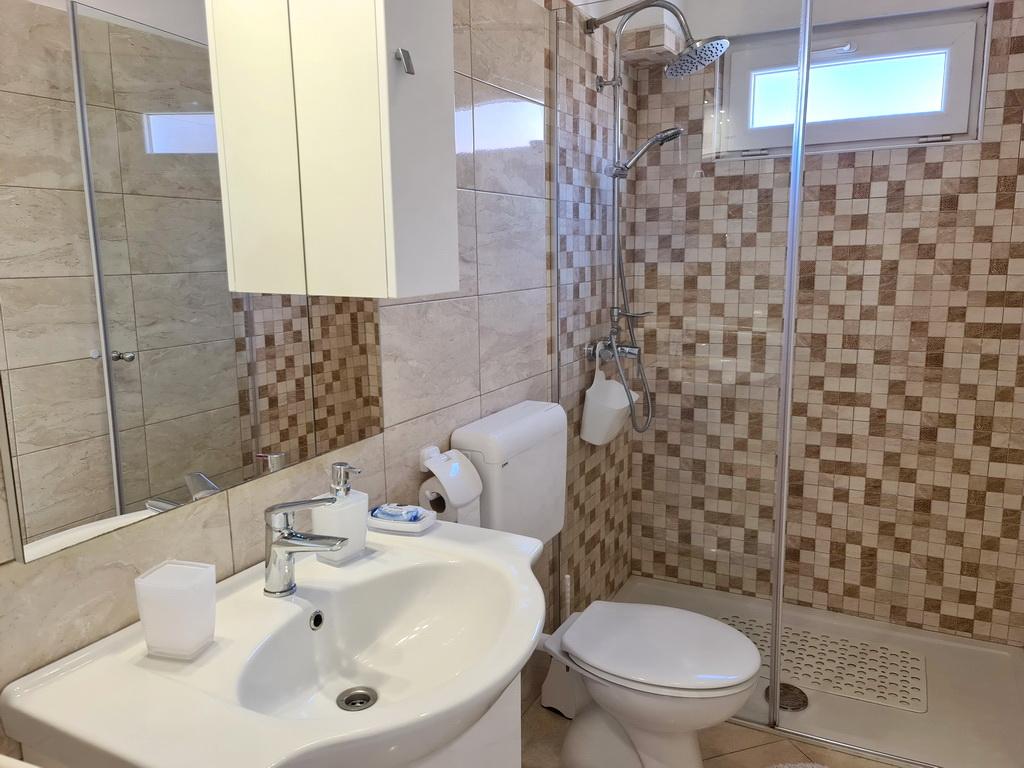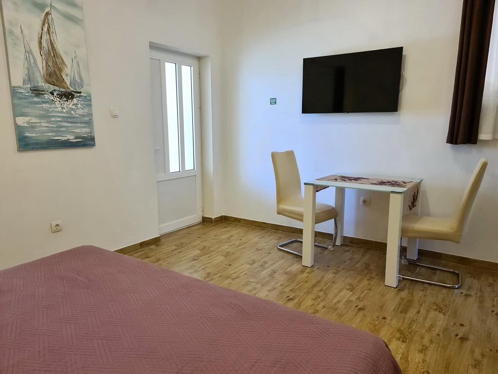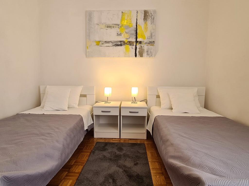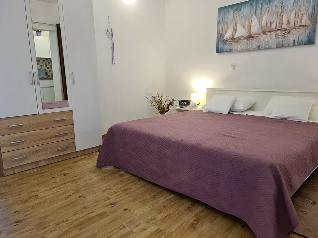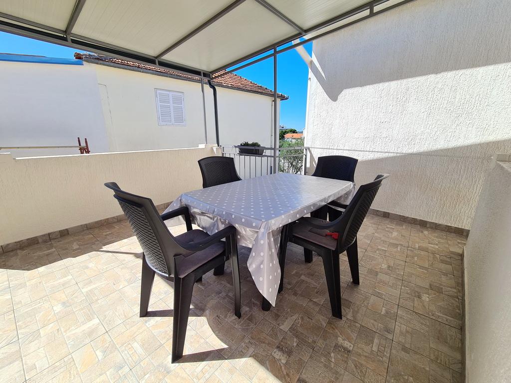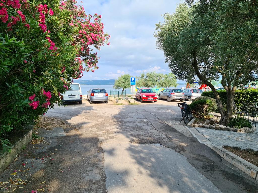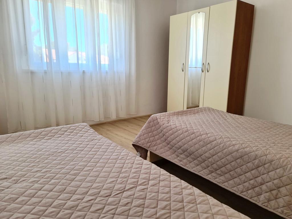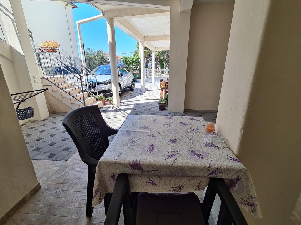 Închiriez un apartament situat la primul etaj al unei case de familie. Este format dintr-o bucătărie cu zonă de luat masa, două dormitoare, fiecare având o baie mică, cămară și hol. Sala de mese are acces la o terasă spațioasă cu vedere la grădină, care oferă oaspeților liniște și intimitate. Parcarea este într-o curte împrejmuită, la umbra viței de vie. Casa este la trei minute de mers pe jos de plaja cu pietricele, la un minut de magazin, la aproximativ zece minute de centru și de malul apei.