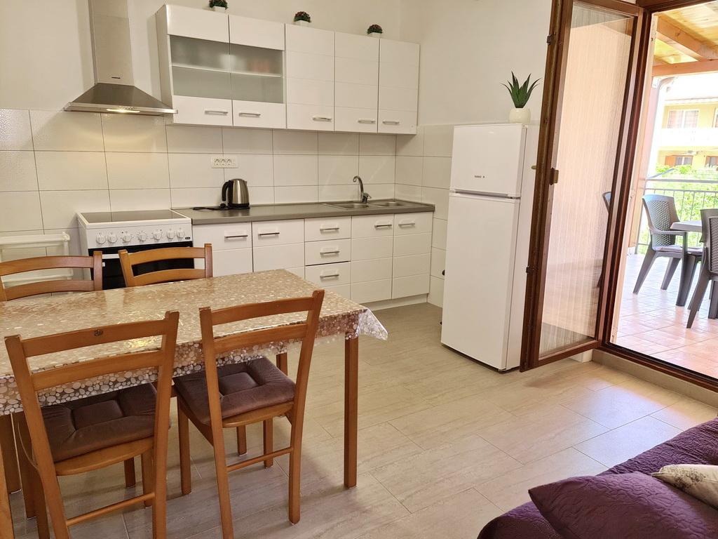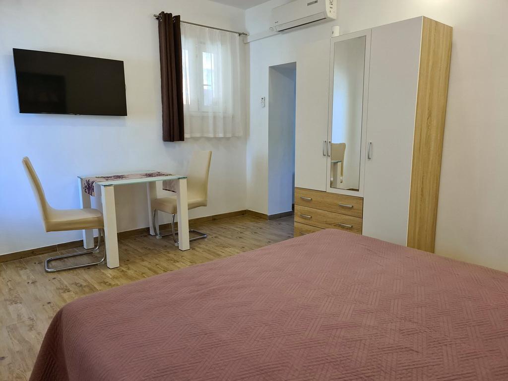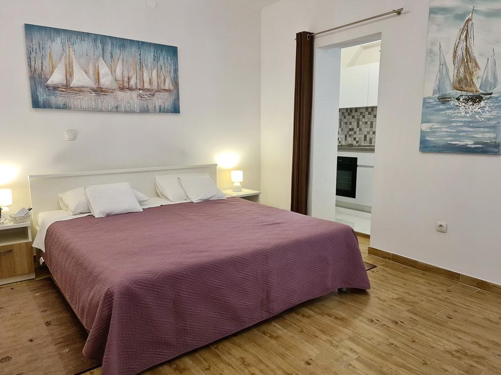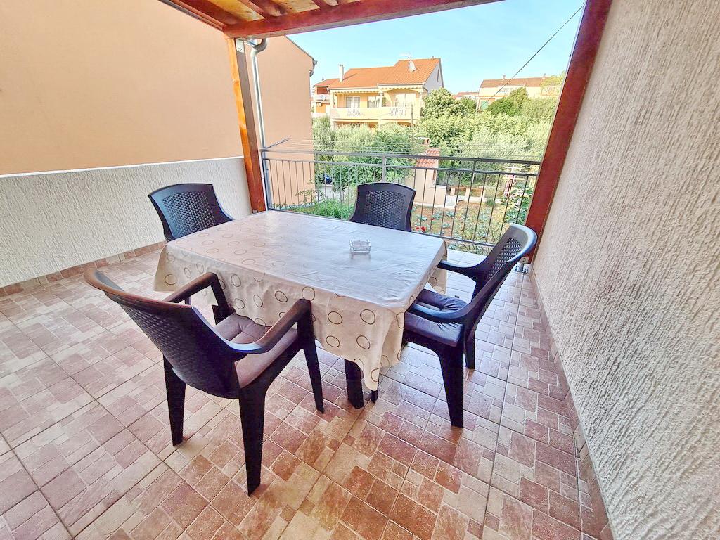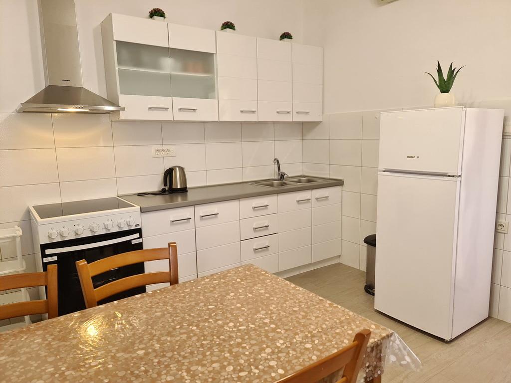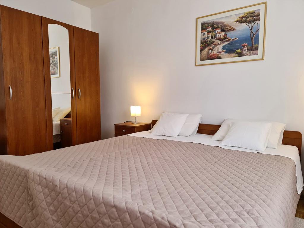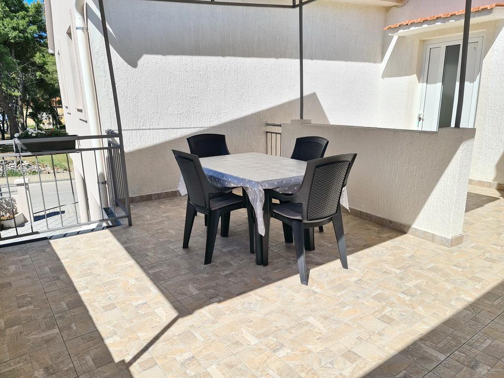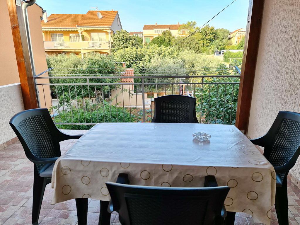 Închiriez un apartament situat la primul etaj al unei case de familie. Este format dintr-o bucătărie cu zonă de luat masa, două dormitoare, fiecare având o baie mică, cămară și hol. Sala de mese are acces la o terasă spațioasă cu vedere la grădină, care oferă oaspeților liniște și intimitate. Parcarea este într-o curte împrejmuită, la umbra viței de vie. Casa este la trei minute de mers pe jos de plaja cu pietricele, la un minut de magazin, la aproximativ zece minute de centru și de malul apei.
