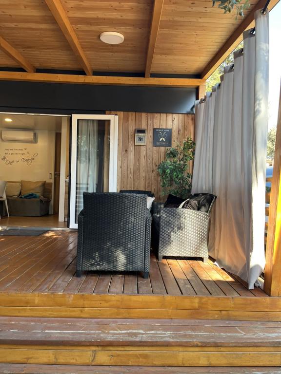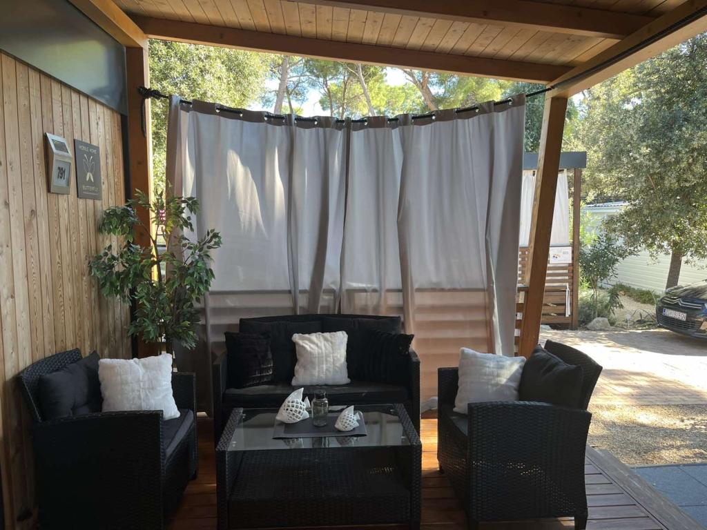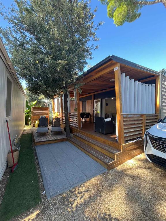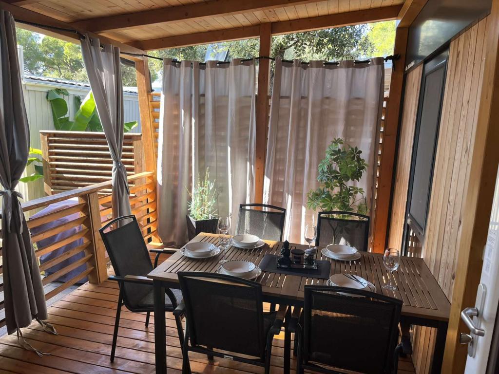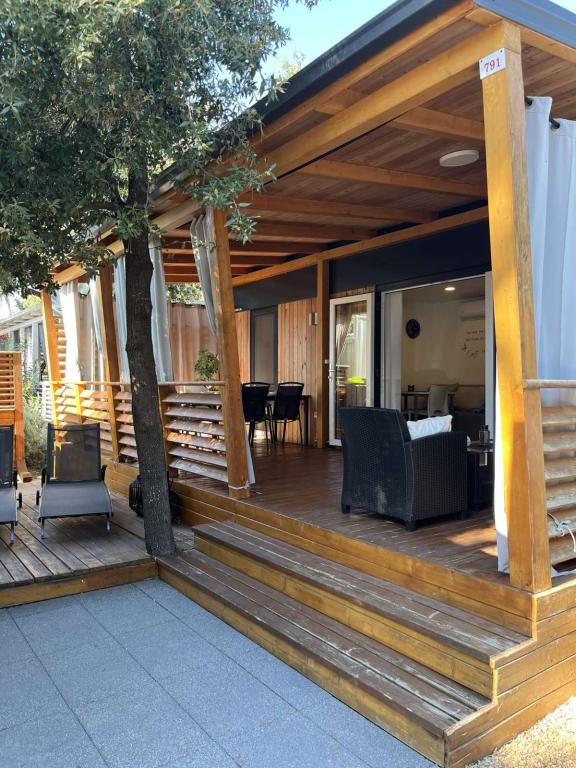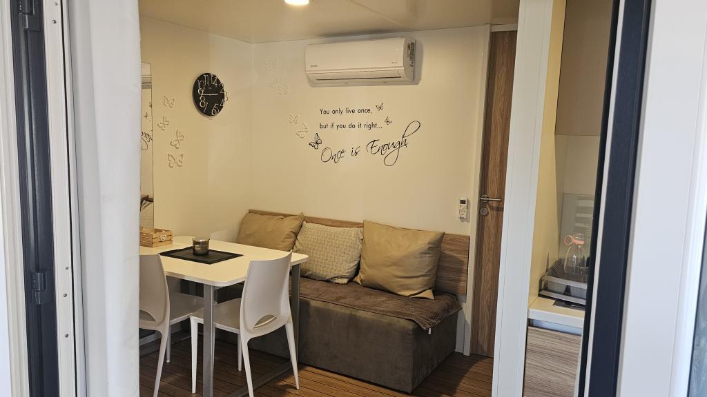 Rulotă modernă, cu aer condiționat, în campingul Park Soline, la doar câțiva pași de plajă și la 15 minute de mers pe jos de centrul orașului Biograd. Oferă 2 dormitoare, o bucătărie, un living, 2 băi și o terasă acoperită cu mobilier de exterior. Wi-Fi gratuit, parcare, divertisment pentru copii, terenuri de sport și un restaurant mediteranean la fața locului. Perfectă pentru familii sau cupluri care caută relaxare la umbra pinilor, aproape de toate atracțiile principale.