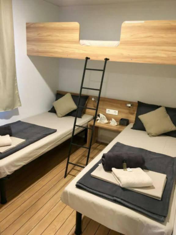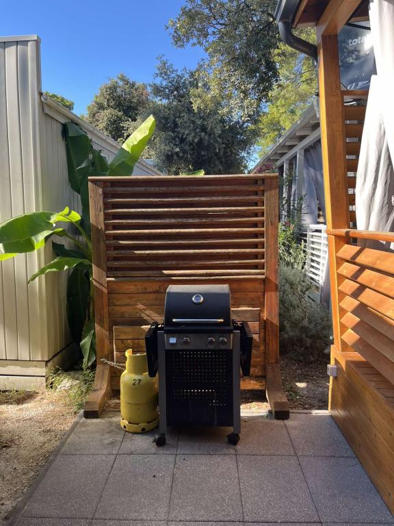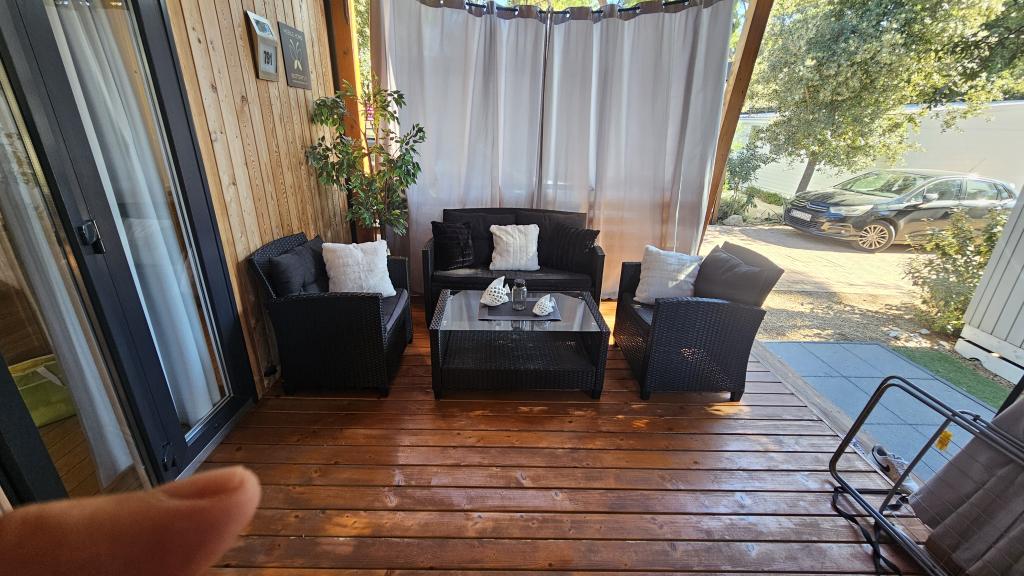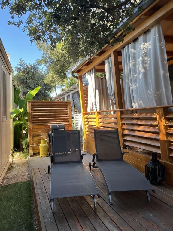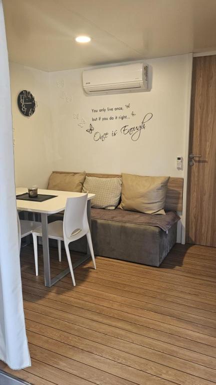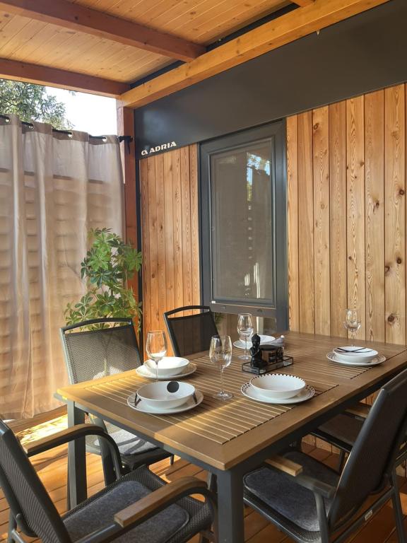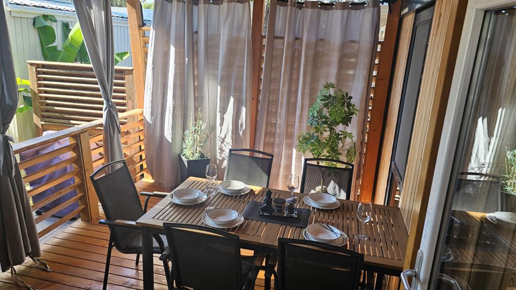 Rulotă modernă, cu aer condiționat, în campingul Park Soline, la doar câțiva pași de plajă și la 15 minute de mers pe jos de centrul orașului Biograd. Oferă 2 dormitoare, o bucătărie, un living, 2 băi și o terasă acoperită cu mobilier de exterior. Wi-Fi gratuit, parcare, divertisment pentru copii, terenuri de sport și un restaurant mediteranean la fața locului. Perfectă pentru familii sau cupluri care caută relaxare la umbra pinilor, aproape de toate atracțiile principale.