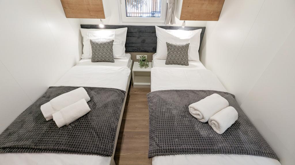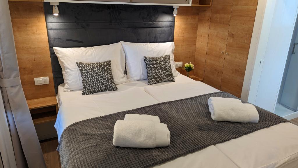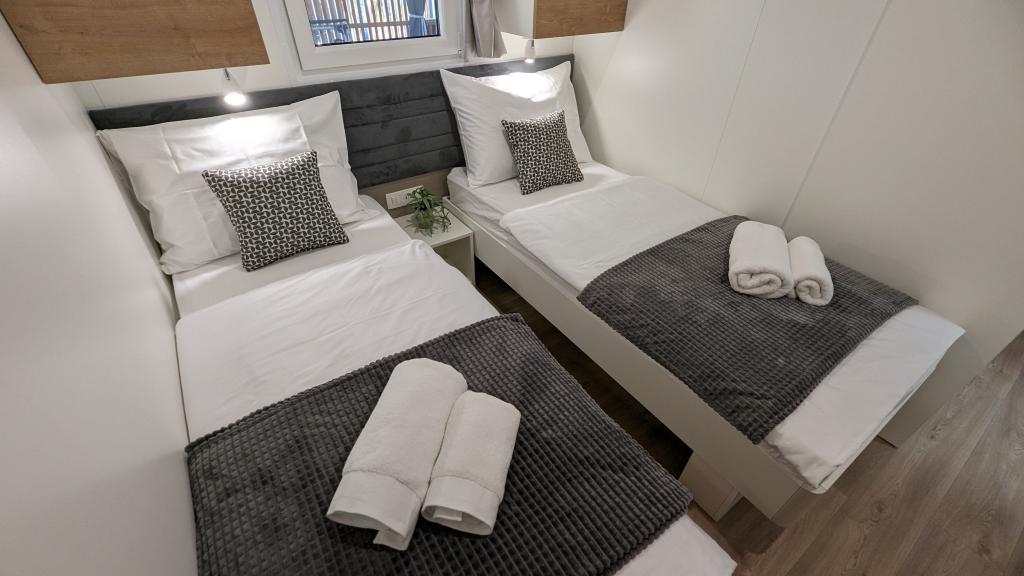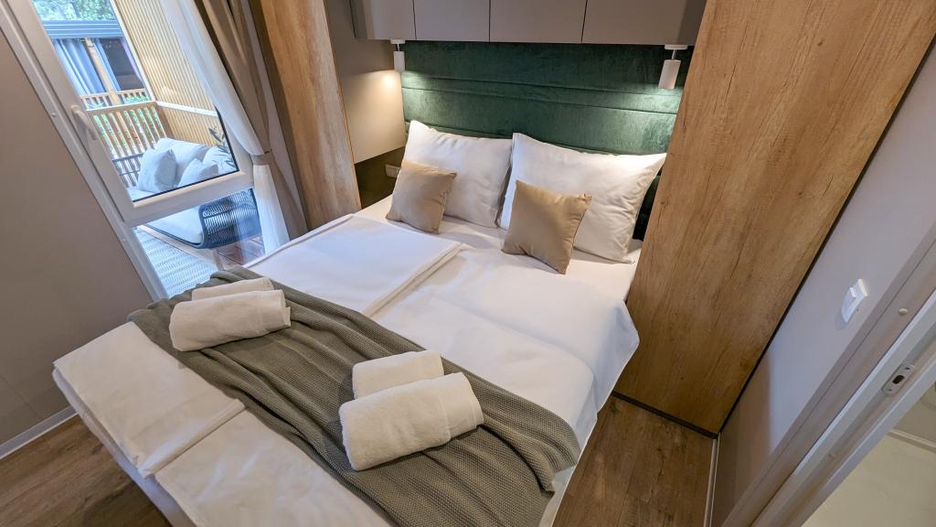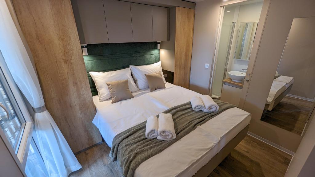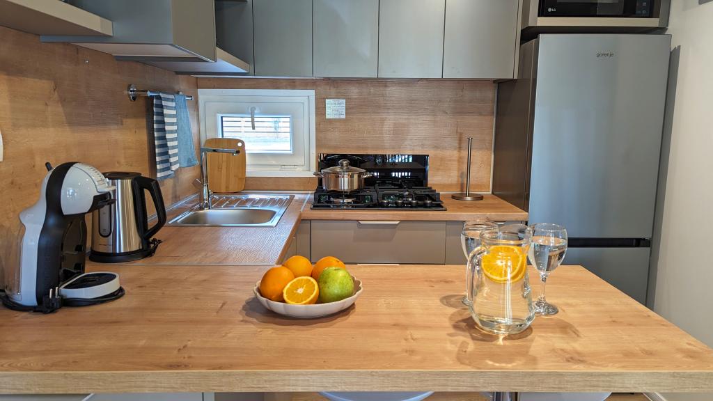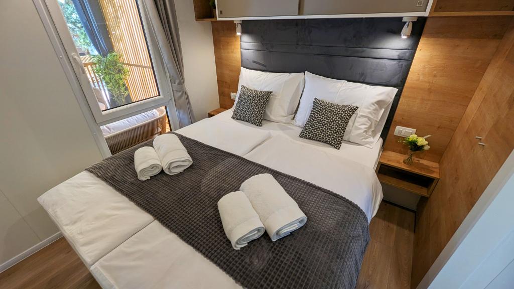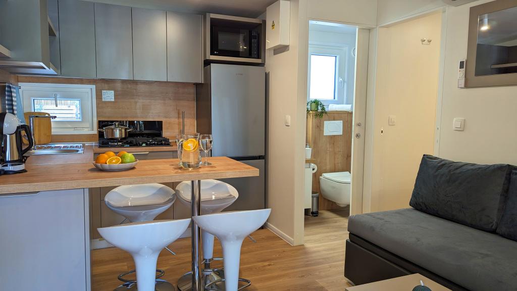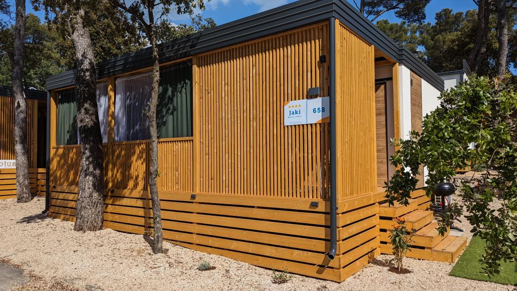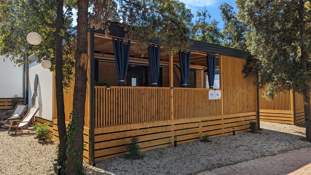 Bucurați-vă de natură și confort: case mobile Jaki la campingul Soline, Biograd na Moru. Situate într-o zonă liniștită a campingului de 4 stele, înconjurată de păduri de pini, casele noastre mobile dotate modern sunt ideale pentru până la 6 persoane. Bucurați-vă de apropierea de plajă (2-5 minute de mers pe jos), de magazine și restaurante și de promenada care duce spre centrul orașului (15 minute). Aceste căsuțe oferă 2 dormitoare și 2 băi, un living, o terasă mare cu masă și zonă de lounge și o bucătărie complet utilată - mașină de spălat vase, cuptor cu microunde, aparat de cafea, prăjitor de pâine, blender, grătar în aer liber. Casa include și WiFi gratuit, parcare gratuită chiar lângă casă, Smart TV, aer condiționat, prosoape și lenjerie de pat. Tabăra oferă numeroase facilități pentru întreaga familie: plaje frumoase cu nisip și pietriș care se întind până în centrul orașului, un restaurant cu specialități mediteraneene, un loc de joacă pentru copii, activități sportive și închiriere de biciclete. Dalmaland, cel mai mare parc acvatic tematic din Croația, este la 15 minute de mers cu mașina.