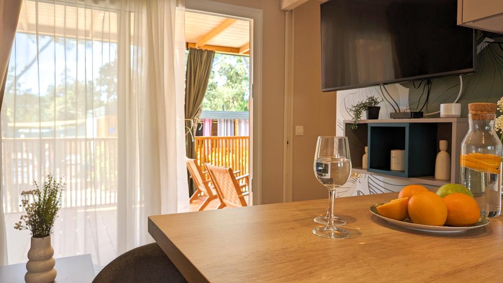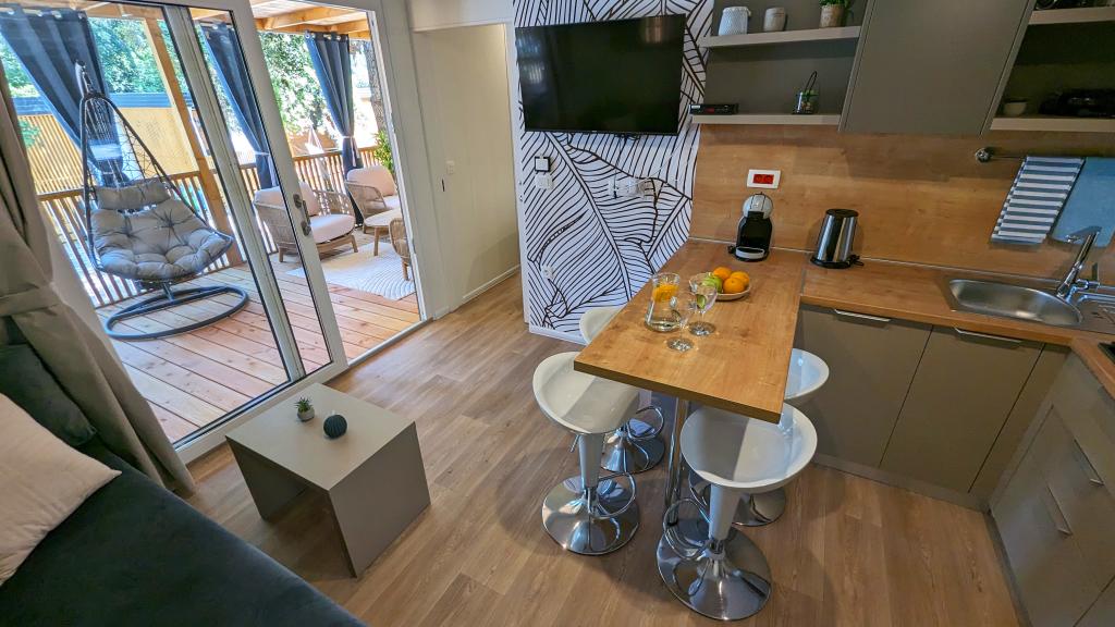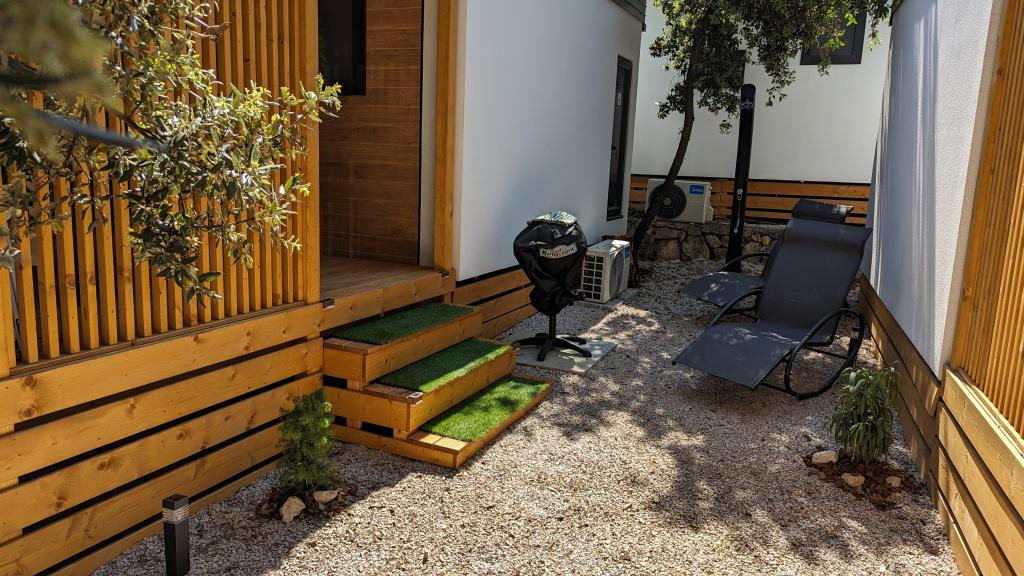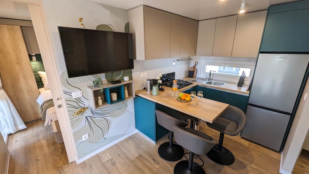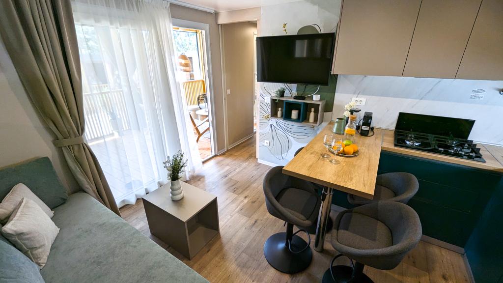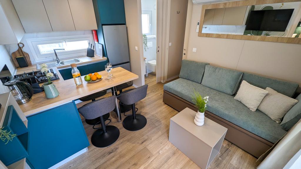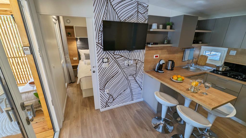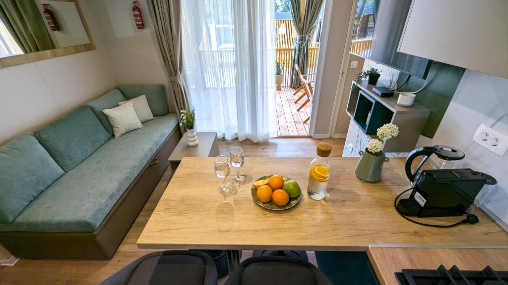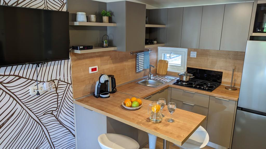 Bucurați-vă de natură și confort: case mobile Jaki la campingul Soline, Biograd na Moru. Situate într-o zonă liniștită a campingului de 4 stele, înconjurată de păduri de pini, casele noastre mobile dotate modern sunt ideale pentru până la 6 persoane. Bucurați-vă de apropierea de plajă (2-5 minute de mers pe jos), de magazine și restaurante și de promenada care duce spre centrul orașului (15 minute). Aceste căsuțe oferă 2 dormitoare și 2 băi, un living, o terasă mare cu masă și zonă de lounge și o bucătărie complet utilată - mașină de spălat vase, cuptor cu microunde, aparat de cafea, prăjitor de pâine, blender, grătar în aer liber. Casa include și WiFi gratuit, parcare gratuită chiar lângă casă, Smart TV, aer condiționat, prosoape și lenjerie de pat. Tabăra oferă numeroase facilități pentru întreaga familie: plaje frumoase cu nisip și pietriș care se întind până în centrul orașului, un restaurant cu specialități mediteraneene, un loc de joacă pentru copii, activități sportive și închiriere de biciclete. Dalmaland, cel mai mare parc acvatic tematic din Croația, este la 15 minute de mers cu mașina.