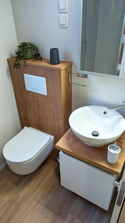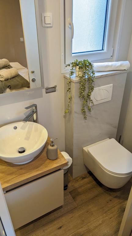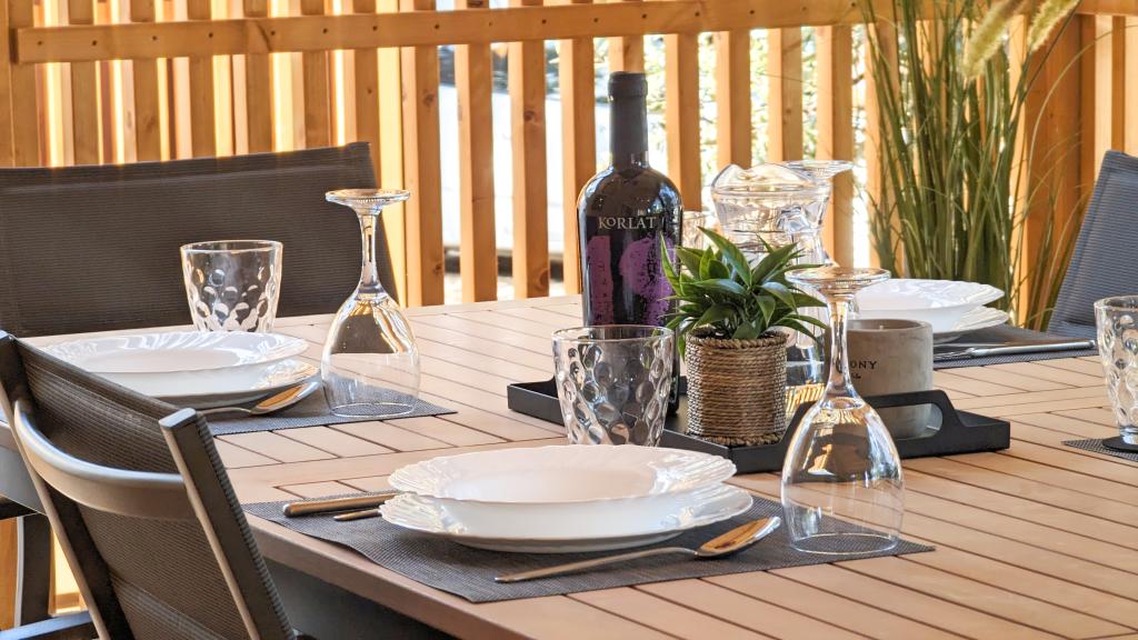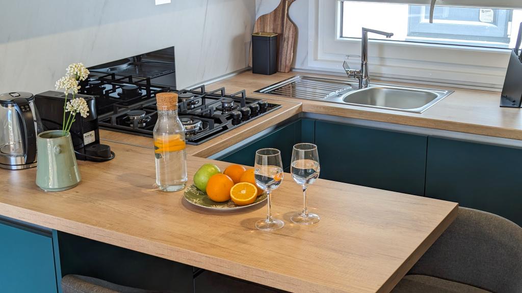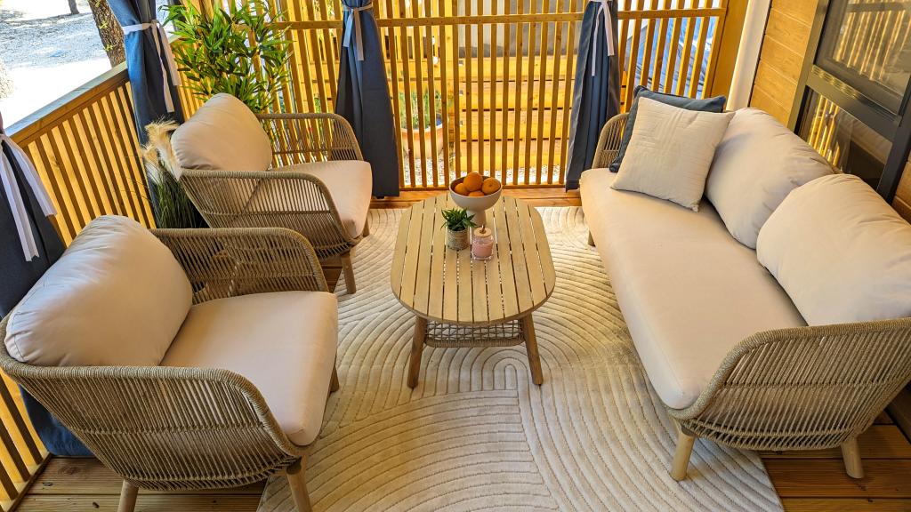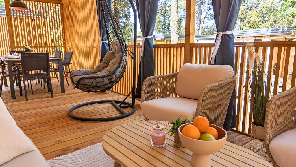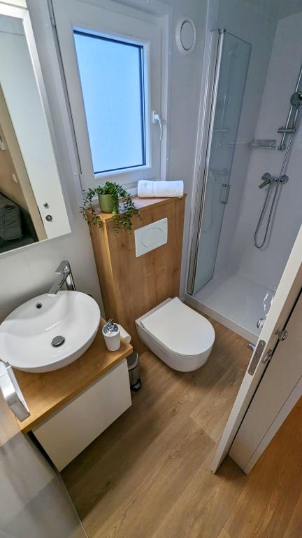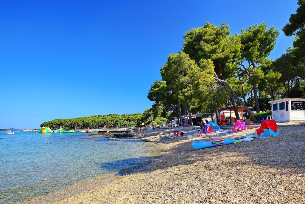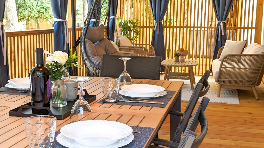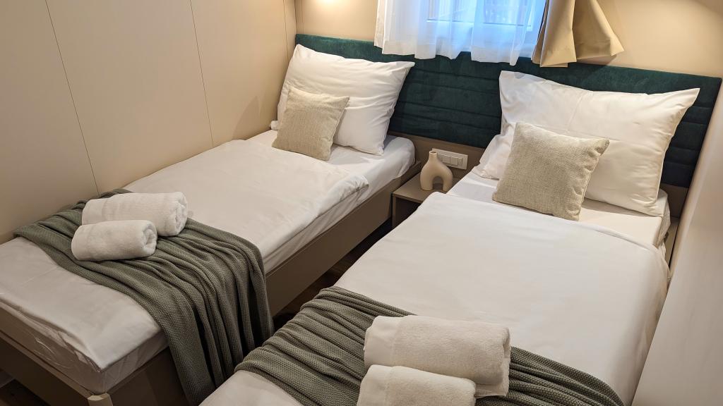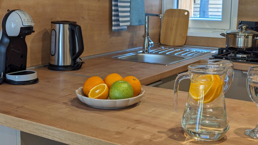 Bucurați-vă de natură și confort: case mobile Jaki la campingul Soline, Biograd na Moru. Situate într-o zonă liniștită a campingului de 4 stele, înconjurată de păduri de pini, casele noastre mobile dotate modern sunt ideale pentru până la 6 persoane. Bucurați-vă de apropierea de plajă (2-5 minute de mers pe jos), de magazine și restaurante și de promenada care duce spre centrul orașului (15 minute). Aceste căsuțe oferă 2 dormitoare și 2 băi, un living, o terasă mare cu masă și zonă de lounge și o bucătărie complet utilată - mașină de spălat vase, cuptor cu microunde, aparat de cafea, prăjitor de pâine, blender, grătar în aer liber. Casa include și WiFi gratuit, parcare gratuită chiar lângă casă, Smart TV, aer condiționat, prosoape și lenjerie de pat. Tabăra oferă numeroase facilități pentru întreaga familie: plaje frumoase cu nisip și pietriș care se întind până în centrul orașului, un restaurant cu specialități mediteraneene, un loc de joacă pentru copii, activități sportive și închiriere de biciclete. Dalmaland, cel mai mare parc acvatic tematic din Croația, este la 15 minute de mers cu mașina.
