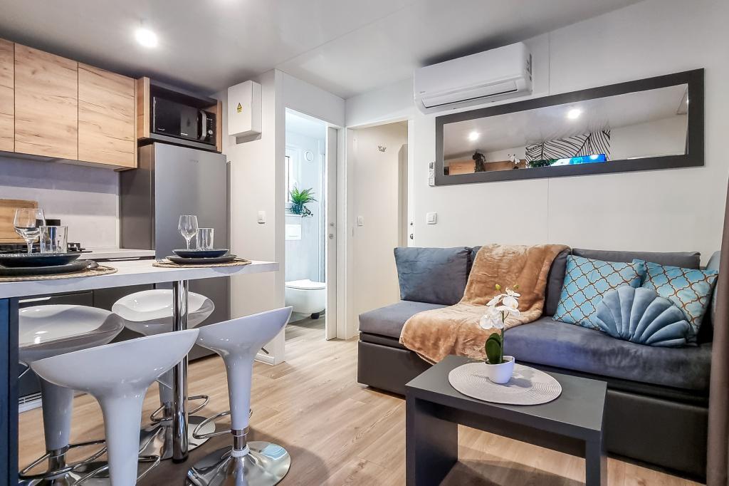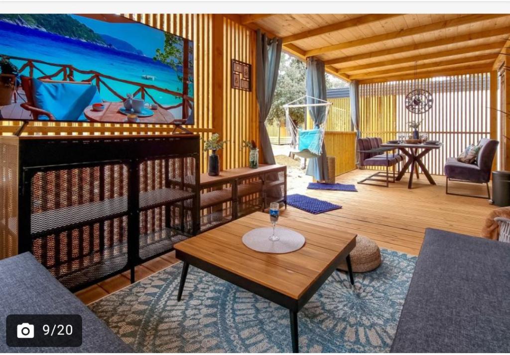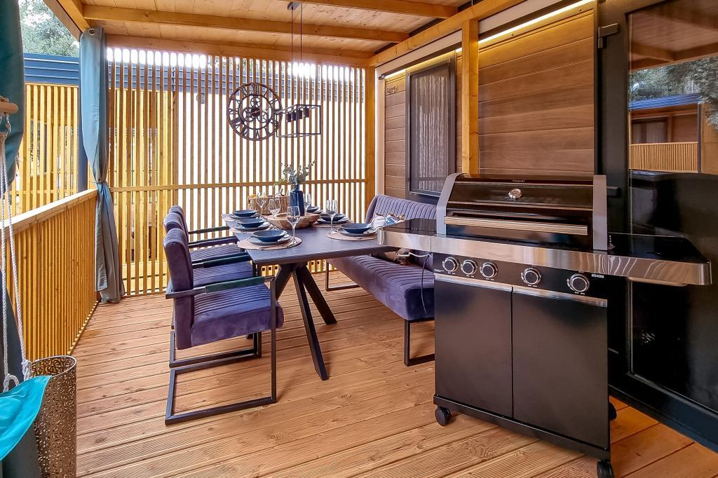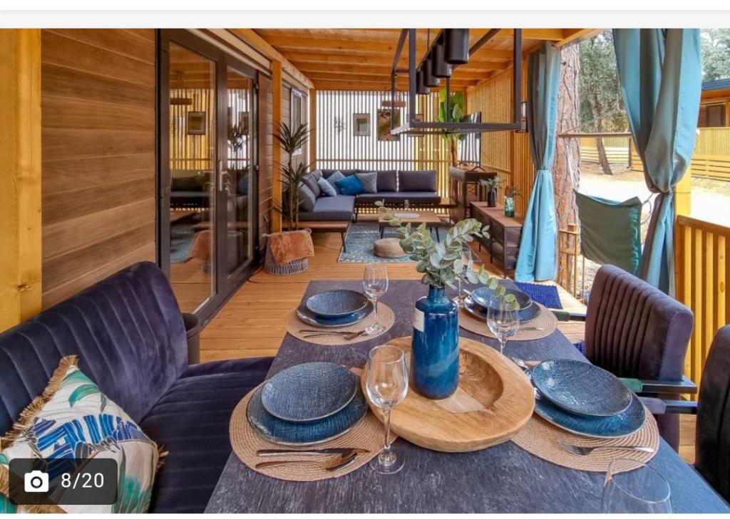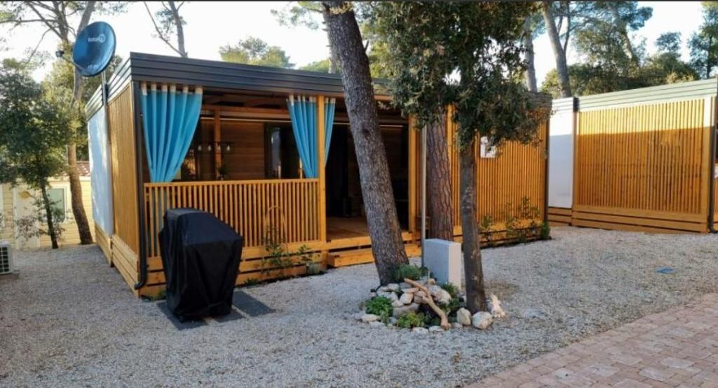 Casa noastră mobilă modern utilată oferă cazare confortabilă pentru până la 6 persoane, cu 2 dormitoare spațioase, un living cu o canapea extensibilă și 2 băi. Bucurați-vă de terasa mare acoperită, dotată cu o zonă de luat masa și un living exterior, ideal pentru întâlniri lungi de seară. Aici vă puteți bucura de darts sau vă puteți relaxa în fața televizorului mare, în timp ce faceți grătar pe grătarul nostru mare pe gaz și pe aragazul exterior. Terasa acoperită este înconjurată de pini și de o briză ușoară de la mare. Pe o parte a terasei există o zonă de luat masa spațioasă, dotată cu o canapea confortabilă și fotolii și mai confortabile, în timp ce pe cealaltă parte, livingul nostru exterior oferă o zonă de relaxare confortabilă, unde nu numai că vă puteți relaxa, ci și vă puteți bucura de emisiunile TV preferate pe televizorul imens cu canale TV prin satelit disponibile, Netflix și HBO GO. Casa este situată la 3 minute de frumoasa plajă.