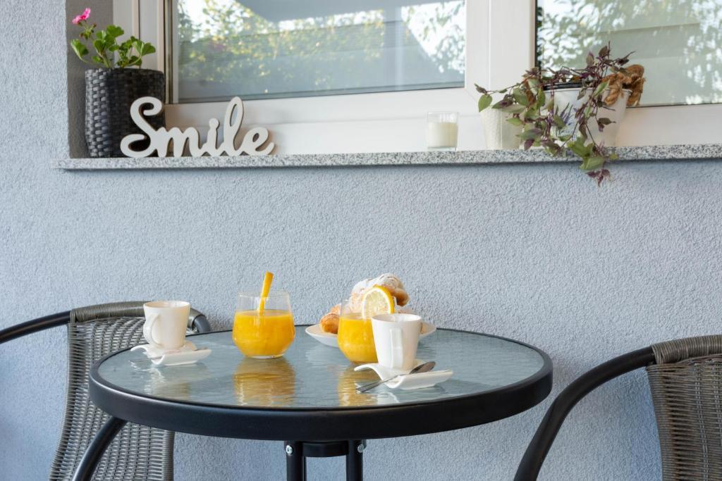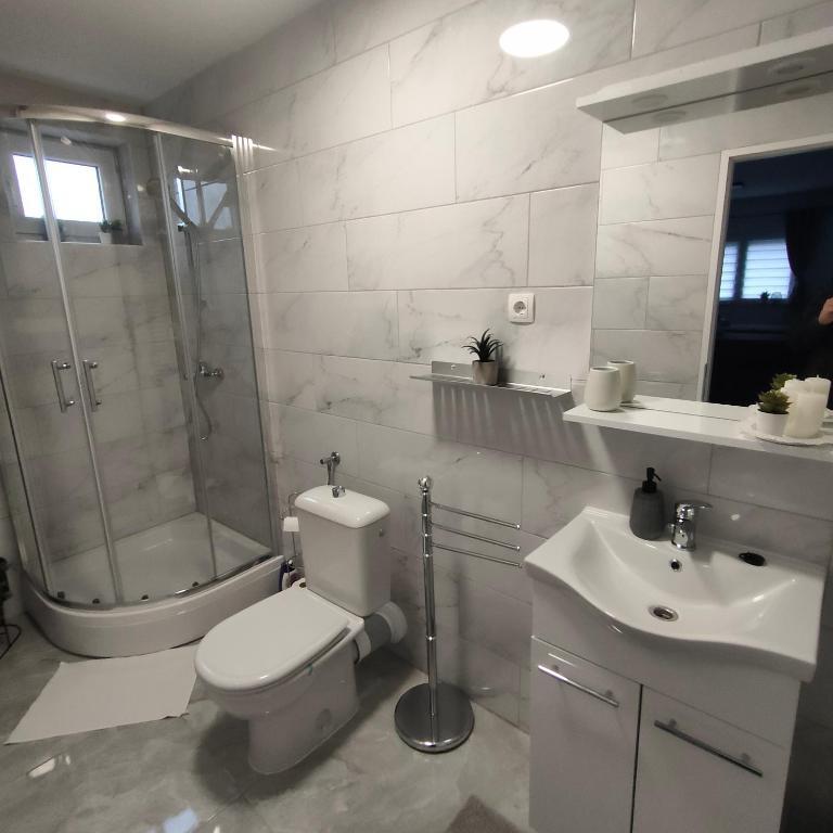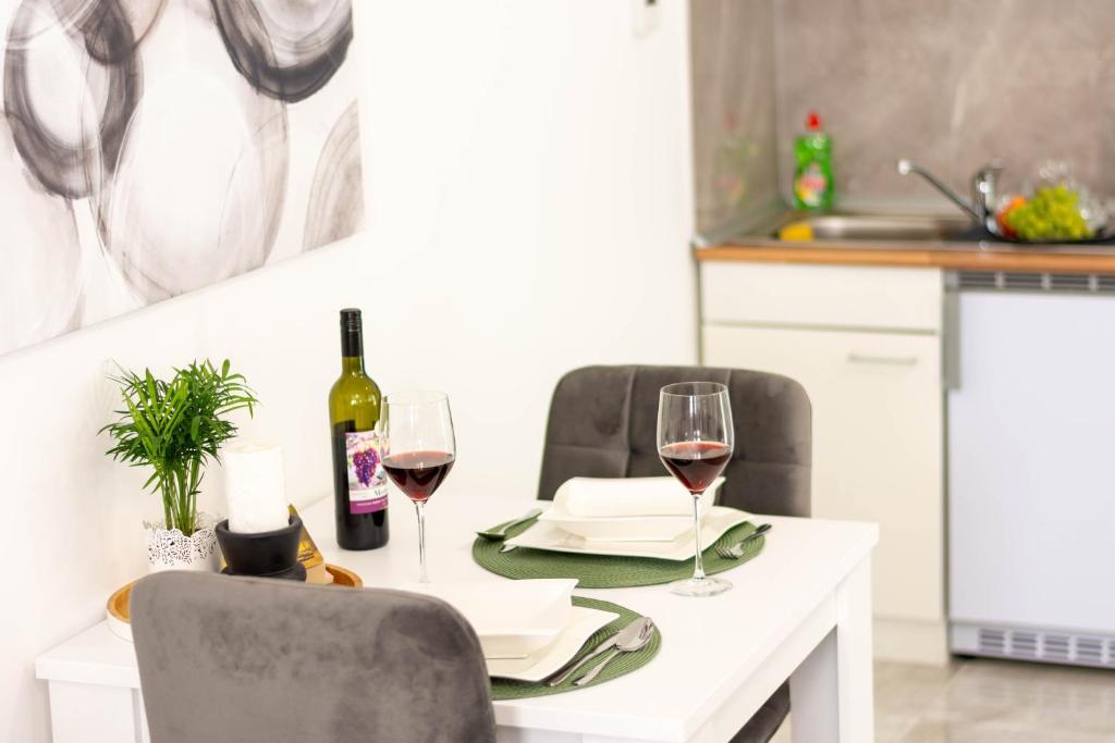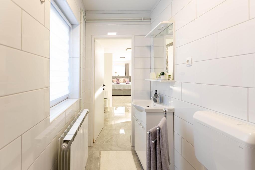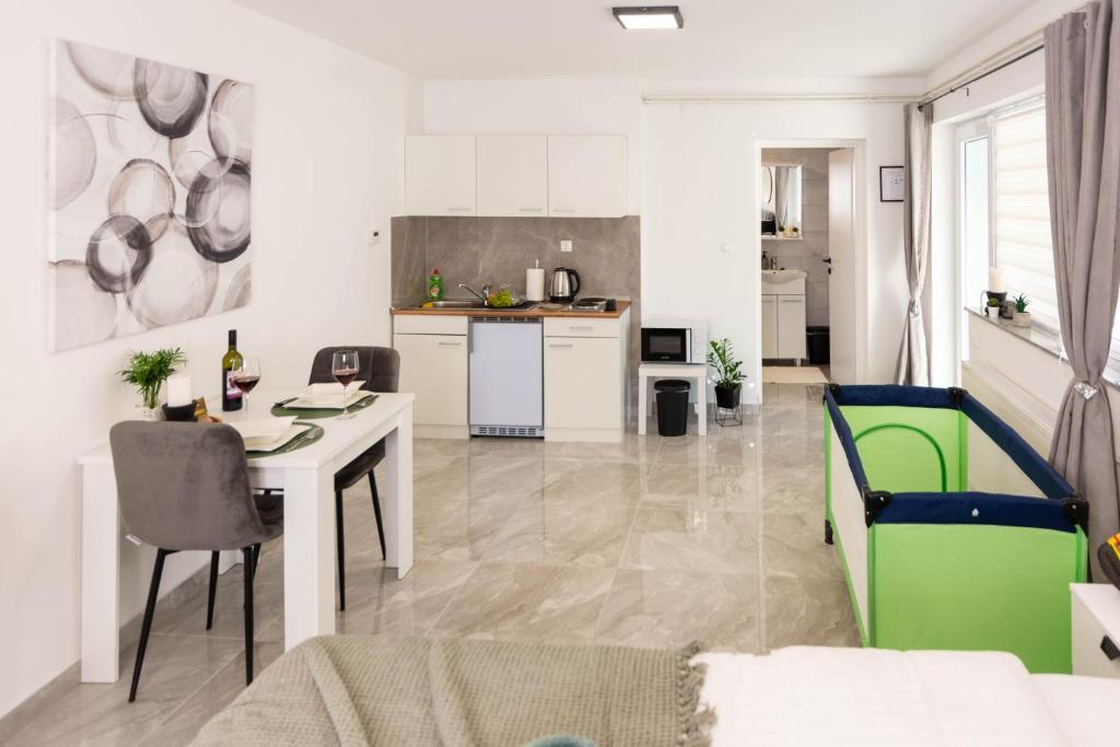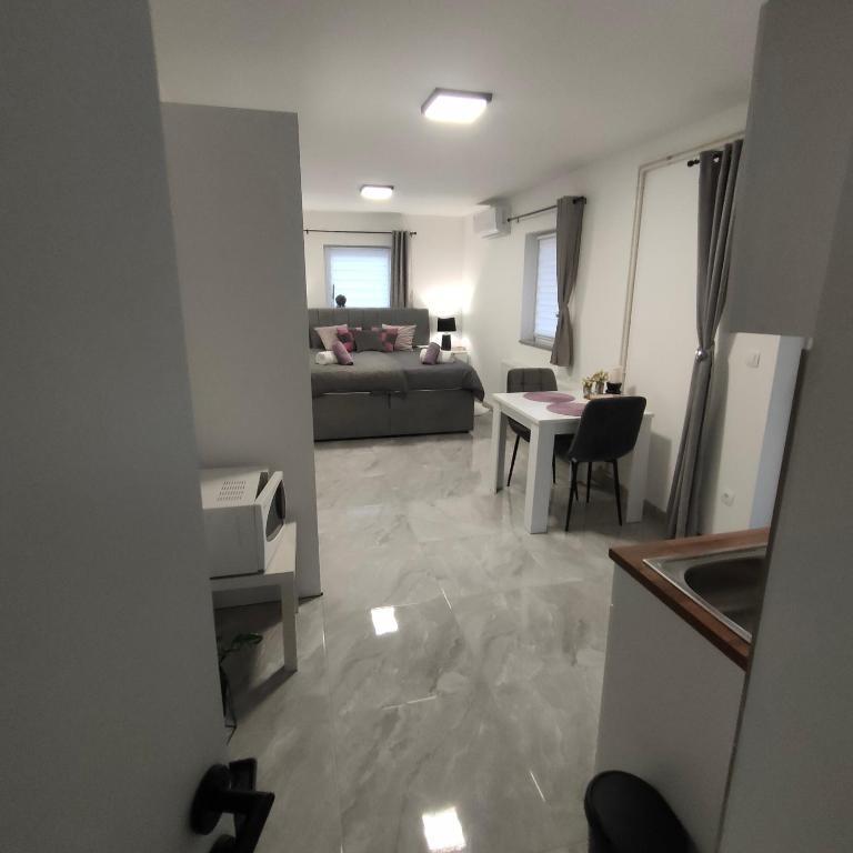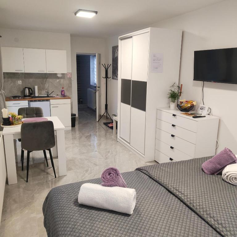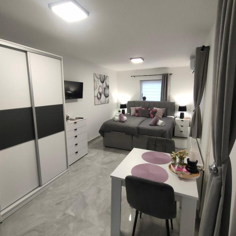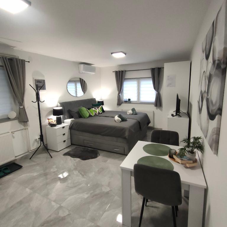 Casa este formata din doua garsoniere. Fiecare apartament studio conține 1 dormitor cu bucătărie complet utilată, 1 baie, lenjerie de pat, prosoape, săpunuri, geluri de duș, șampoane, un TV cu ecran plat, o terasă comună pentru a savura cafeaua cu o grădină mare. Apartamentul este situat pe o strada linistita la aproximativ 500 m de centrul orasului si este ascuns in teren. O curte și o grădină mare separă apartamentul de drum, ceea ce permite o ședere liniștită în apartament și pe terasă. Există o parcare pentru mașini private în curte.