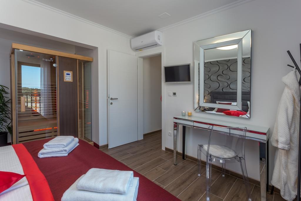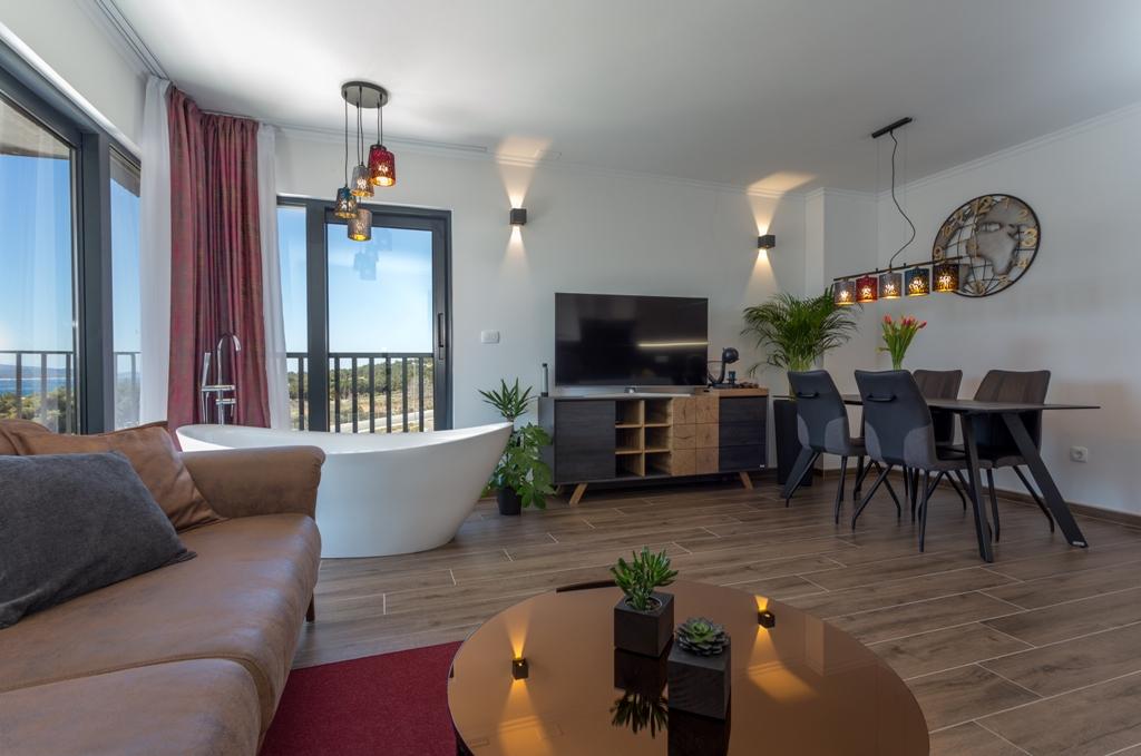Apartamentul Pleasure Bol este o combinație superbă de poziționare, confort și conectivitate. Ai ales ce e mai bun, deoarece la intrarea în orașul Bol, intri în garajul de la parterul apartamentului și acolo se termină toate grijile legate de siguranța mașinii tale, de care nu mai ai nevoie pentru șederea ta în Bol. Intrarea în apartament vă va aduce un zâmbet larg pe față, deoarece, alături de detaliile de design, priveliștea este atrasă de pereții mari de sticlă care dezvăluie plaja Zlatni Rat, marea deschisă și un apus de soare superb chiar în fața dumneavoastră. Când ieși pe terasă, toate acestea sunt completate de o priveliște neobstrucționată asupra celui mai înalt vârf de pe insula Brač - Vidova Gora (778 m).