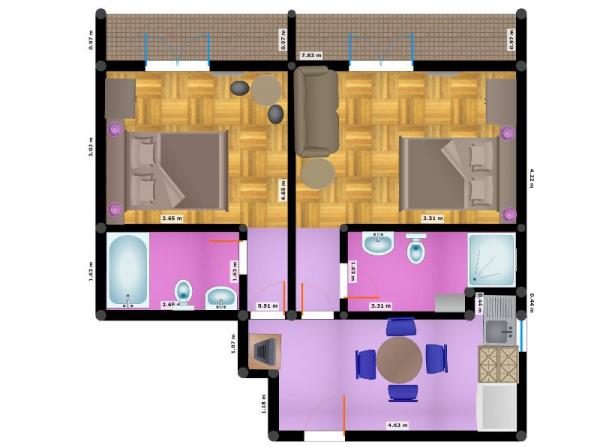 Apartament pentru patru persoane, cu două paturi suplimentare (45 m2)