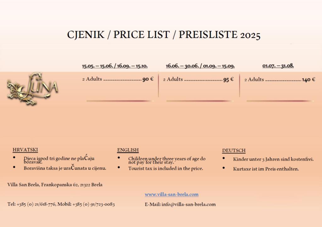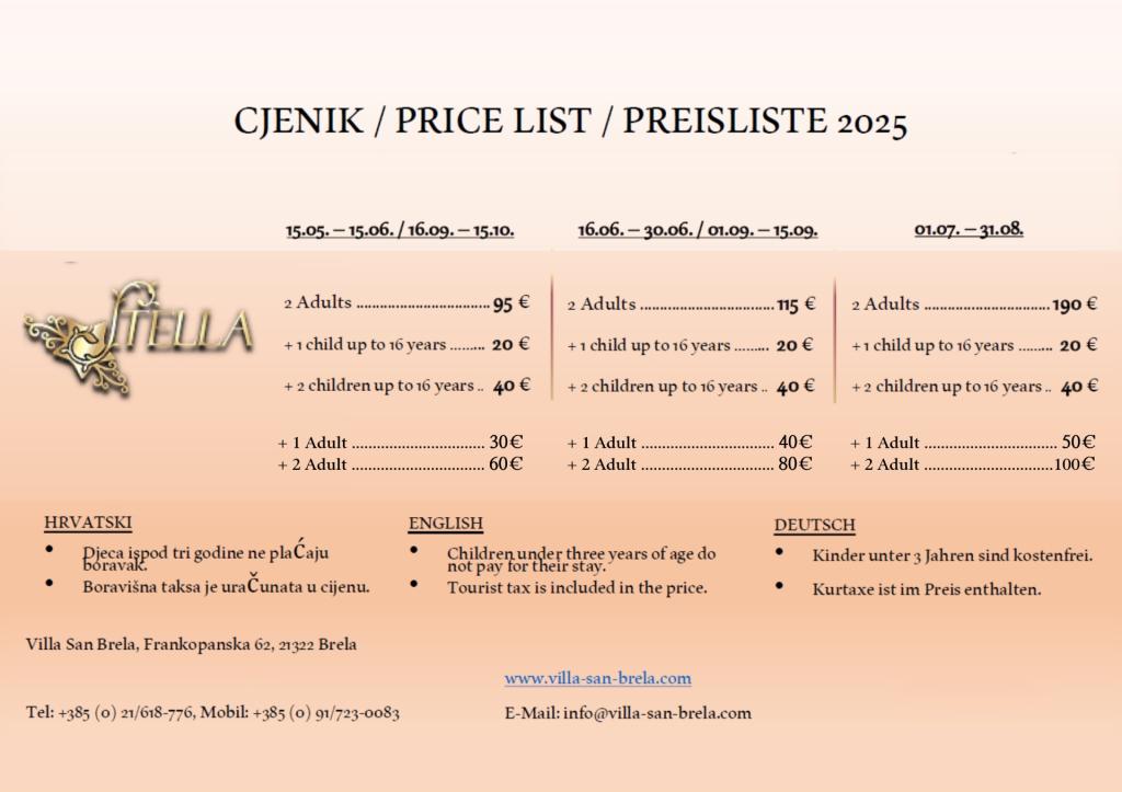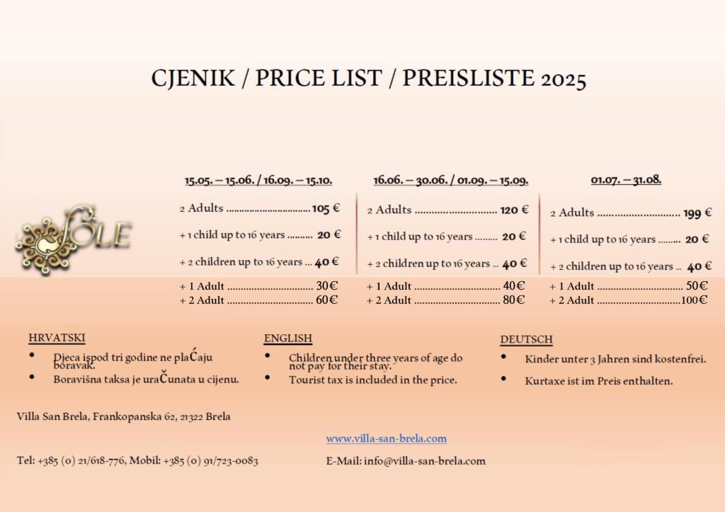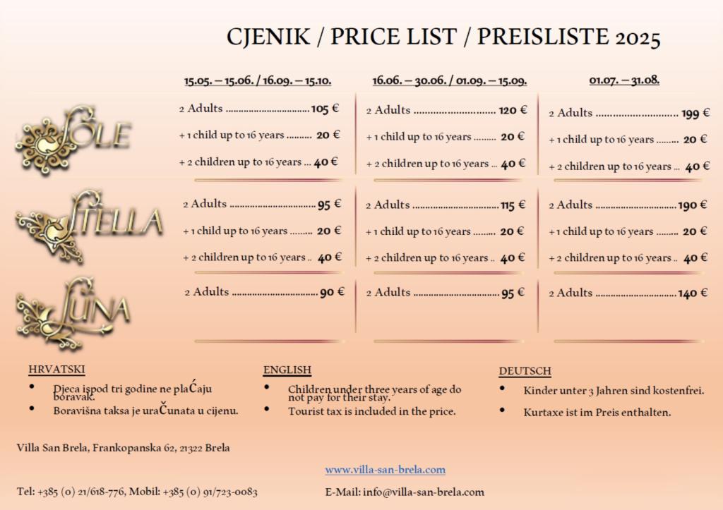 Villa San a fost un vis Ned și Ante, care a devenit o realitate în frumoasa Brela și care împărtășesc astăzi cu oaspeții lor. La realizarea lui gastronomi instruiți au lucrat peste 30 de ani în restaurantul familiei sale în Germania. 1998 eforturile lor în cele din urmă a fost încununat de cumpararea unei vile vechi într-un mediu liniștit aproape de mare. Șapte ani de muncă de durată de renovare a vilei construit în 1937 în timp ce toate în totalitate nu se potrivea cu dorințele Ned și Ante. Astăzi, prietenii și oaspeții sunt disponibile de la 15 04th-a 15-a 10 în fiecare an, de trei frumos și un apartament confortabil, mobilat numit Luna, Sole și Stella. Fiecare apartament are propriul farmec și stil - fie pe șemineu, terasa frumoasă și vedere uimitoare la mare. Grădina idilică cu palmieri și diverse plante și flori invită să se odihnească. Pentru aceasta, proprietarii de oază în 2008 municipalitatea a primit cea mai bună grădină de atribuire în Brela, pe care acestea sunt deosebit de mândru.