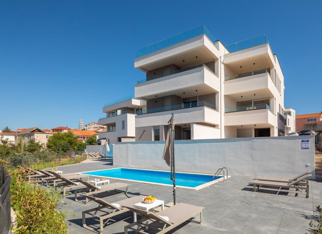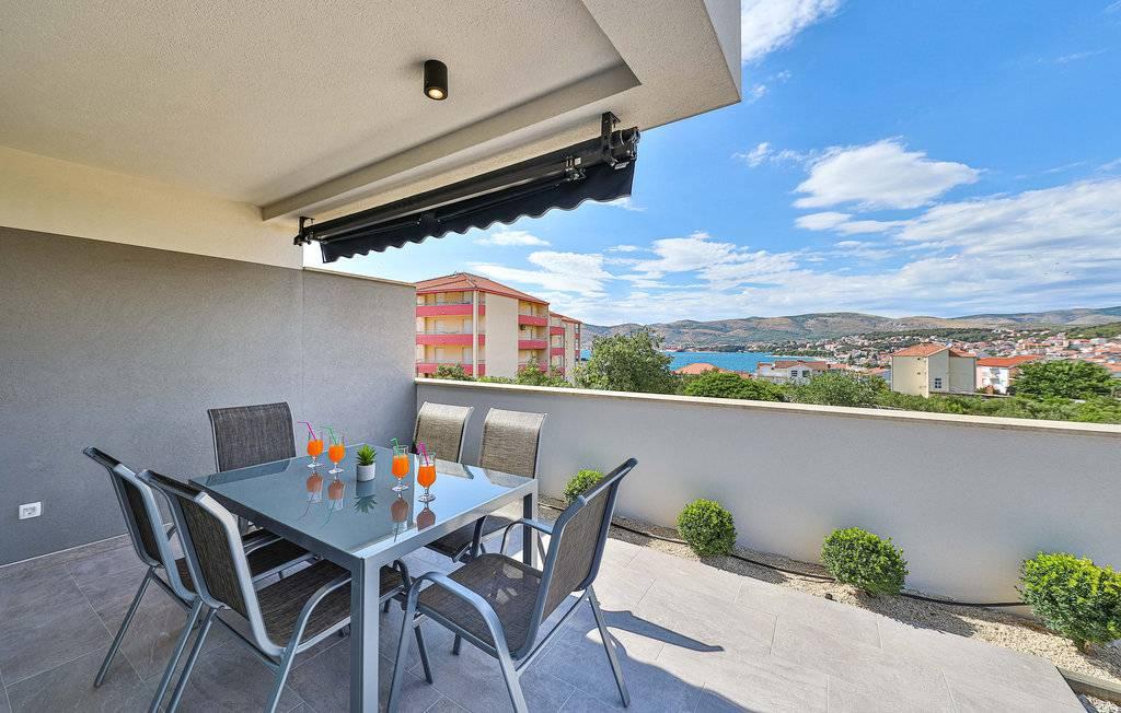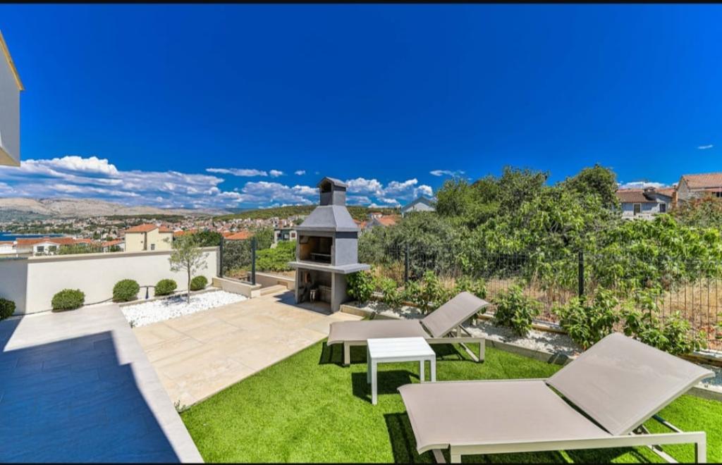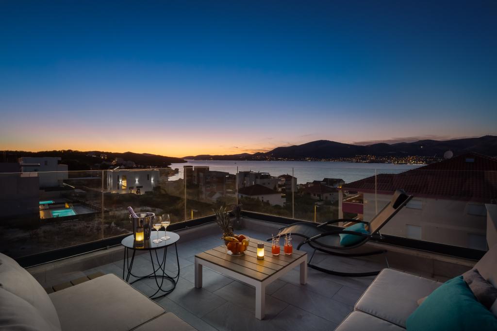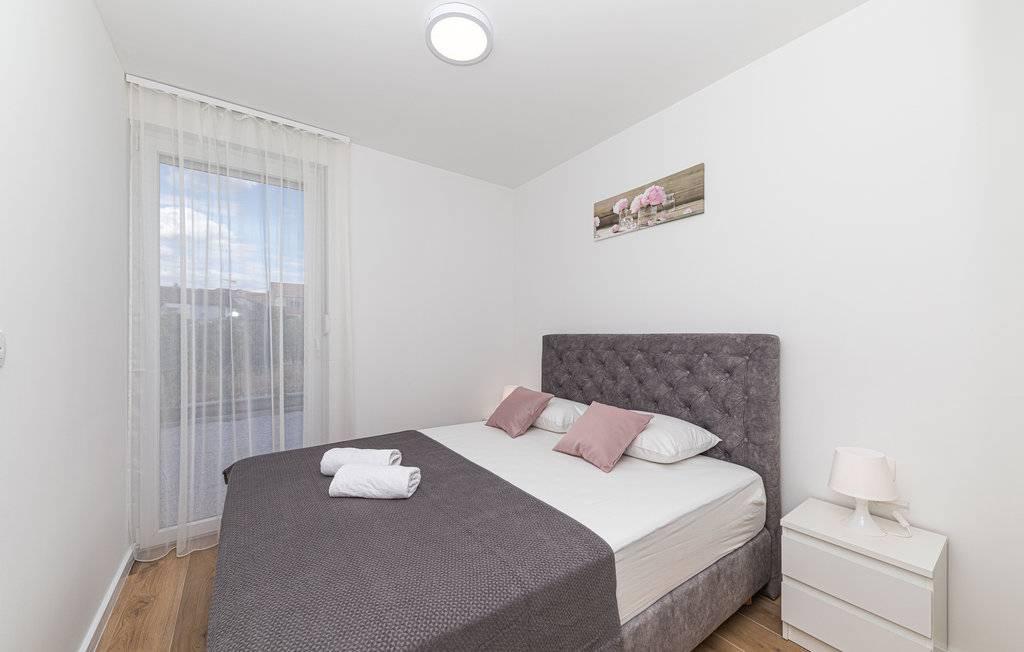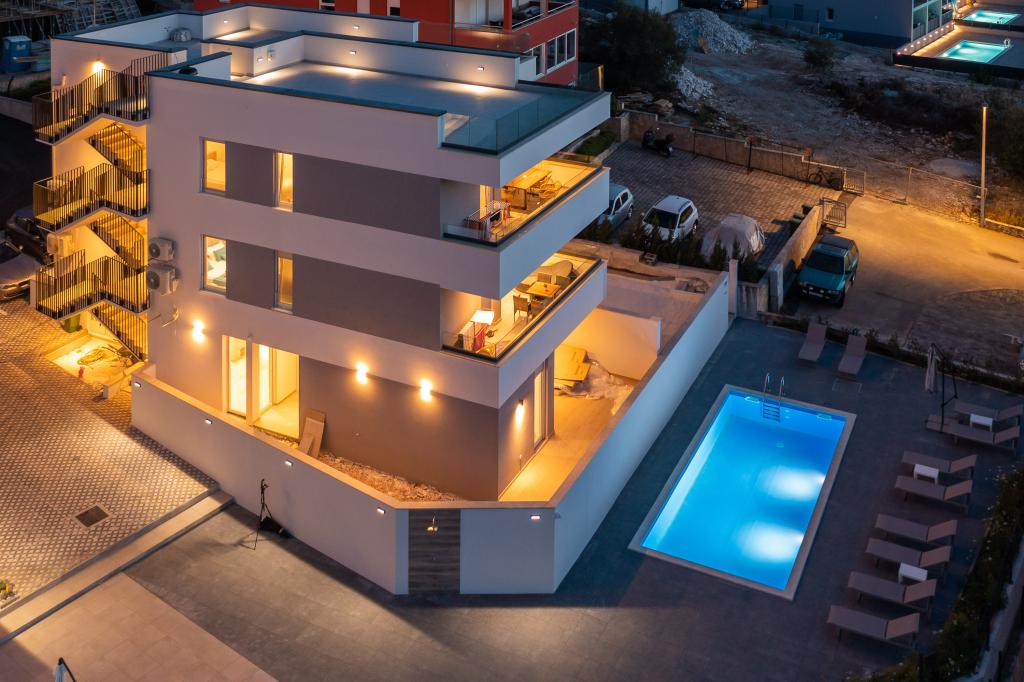 Această proprietate complet nouă și modernă (construită în 2021) este alegerea perfectă pentru oaspeții care caută un apartament de lux la mare în Croația. Proprietatea are o piscină privată exclusivă pentru oaspeți, trei locuri de parcare securizate și este situată la doar 250 de metri de plajă sau la doar 6 minute de mers pe jos. Apartamentul este situat la etajul 2 și oferă un nivel superior de confort și intimitate. Toate ferestrele sunt dotate cu obloane electrice și plase de țânțari, iar fiecare cameră are aer condiționat separat, asigurând o ședere plăcută pe tot parcursul anului. Proprietatea oferă o vedere panoramică frumoasă asupra întregului golf, care este evidentă mai ales seara. Oaspeții au acces la o terasă privată spațioasă de 70 m², ideală pentru relaxare și socializare cu familia și prietenii. Un grătar și echipamente complete pentru grătar, precum și șezlonguri, umbrele de soare, un duș exterior și toate echipamentele pentru piscină sunt disponibile gratuit. Exteriorul proprietății și parcarea sunt supravegheate video, în timp ce ușa de la intrare este antiefracție.