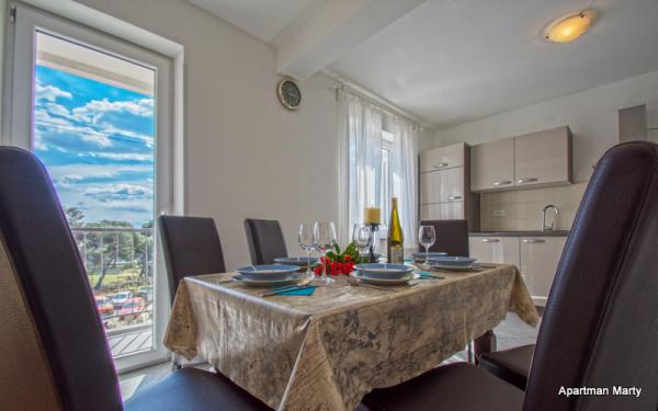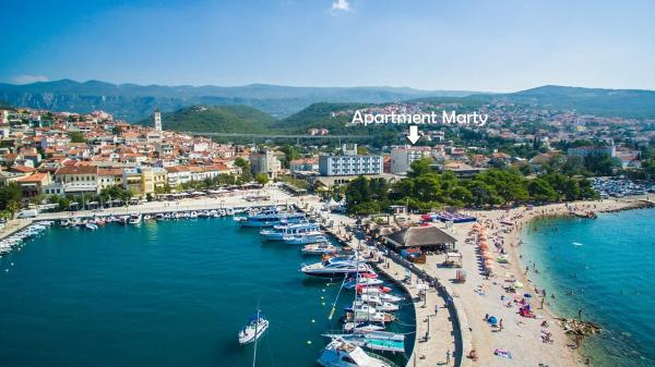 Marty apartament este situat în centrul orașului Crikvenica! Apartamentul este 76m2 și este situat într-o clădire rezidențială, la etajul 2, și în apartamentele de la mai puțin de 50m sunt situate oficiu postal, banca, magazine, stație de autobuz, pe plajă. Este foarte frumos și confortabil, și constă într-o bucătărie complet utilată, sala de mese, baie cu WC, WC, living, doua dormitoare si un balcon. Parcarea este publică.