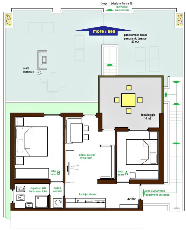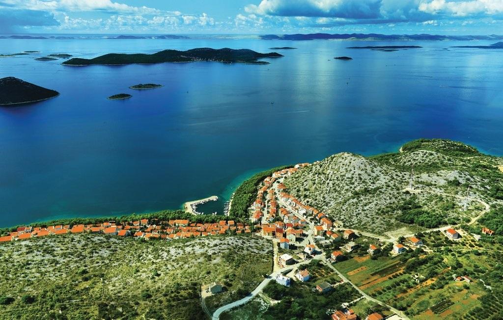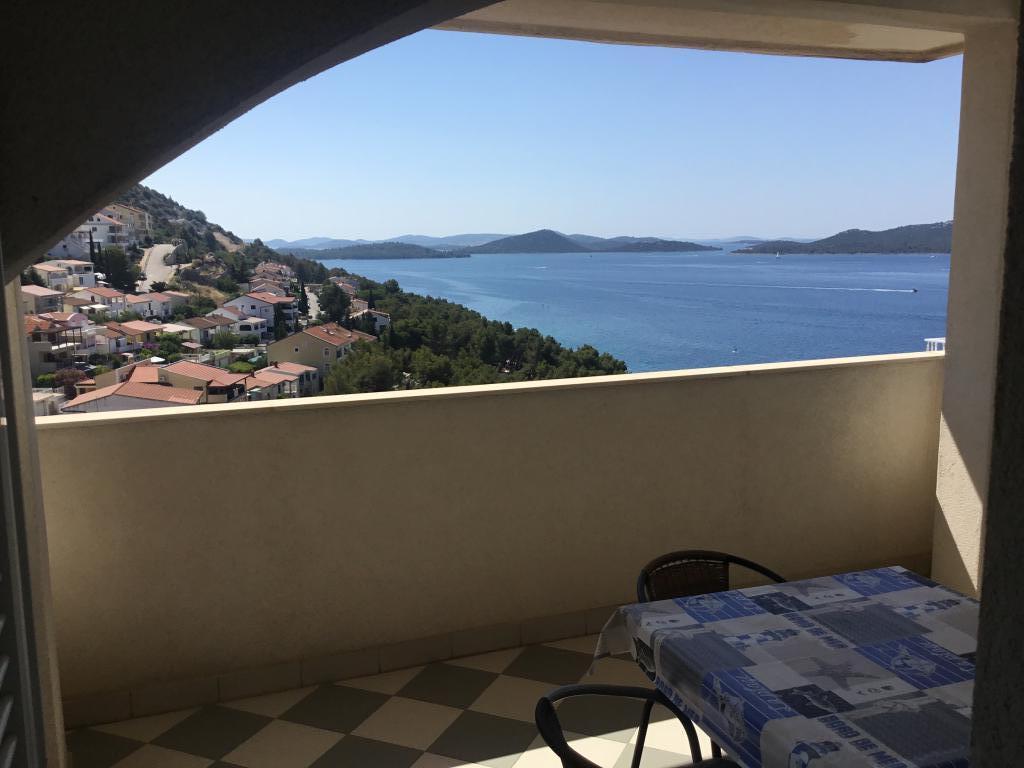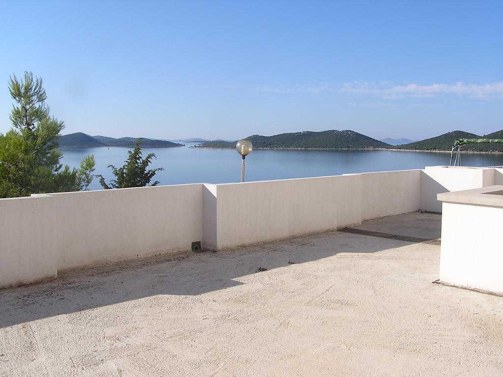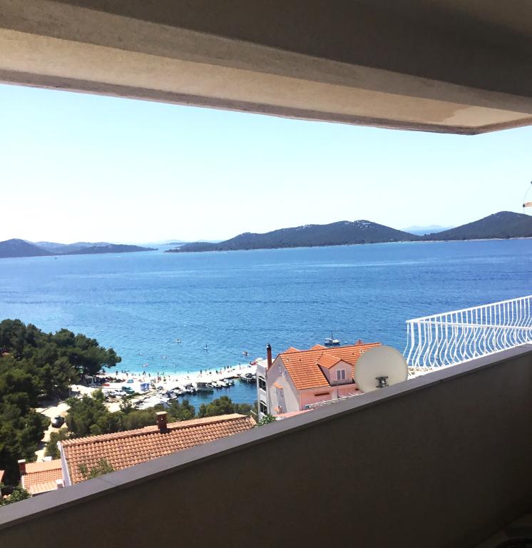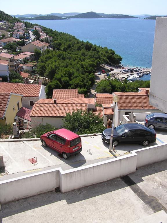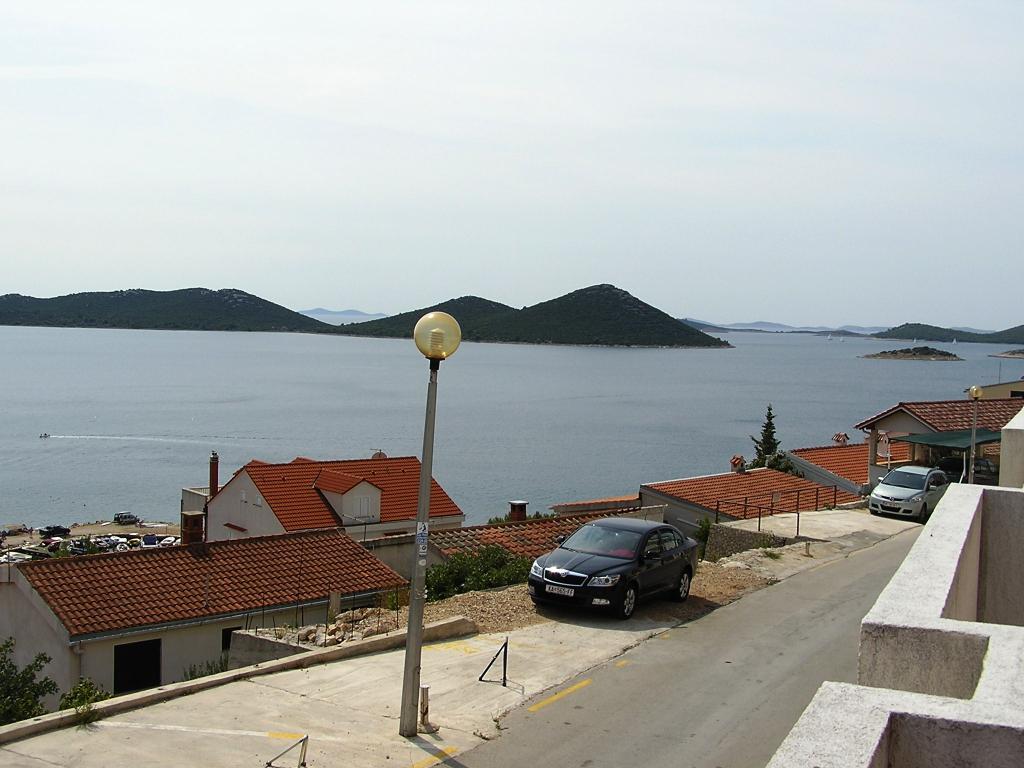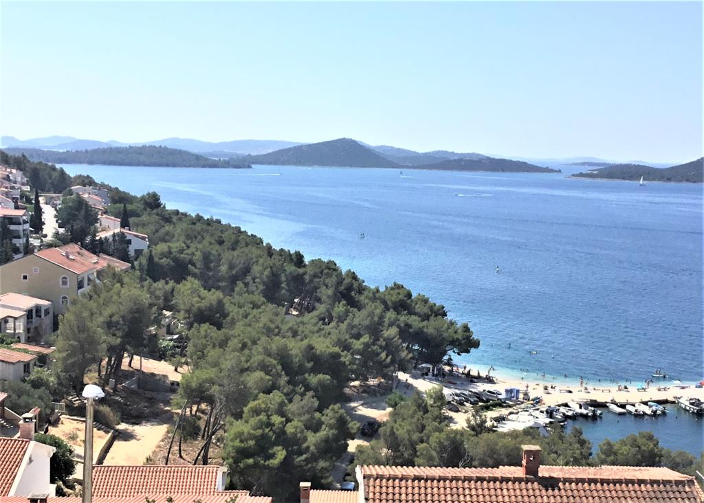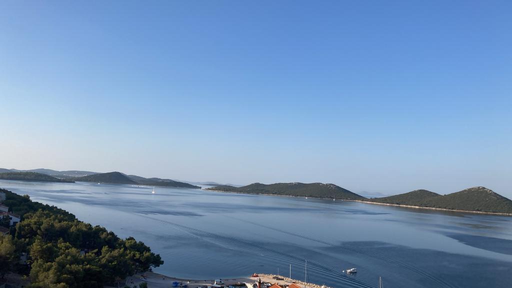 Proprietatea este situată în al treilea rând al satului de weekend Dolaška Draga Bay, parte a orașului Drage, la aproximativ 100 m (în linie dreaptă) de mare și de plajele care se întind de-a lungul satului de weekend până la pădurea densă de pini și promenadă. Datorită altitudinii dominante a proprietății (aproximativ 50 m deasupra nivelului mării), toate camerele apartamentelor și terasele au o vedere panoramică frumoasă asupra satului de weekend în sine, a portului local, a plajelor din jur, a insulelor din apropiere și a orașului Murter și a insulelor Kornati în depărtare. Distanța de la proprietate până la mare (plaje înconjurate de păduri dense de pini și o promenadă) este de aproximativ 300 m folosind drumul de acces prin satul de weekend Dolaška Draga; pe jos, în jurul drumului (aproximativ 10 minute) sau cu mașina (2 minute). La mare se poate ajunge pe jos mai rapid (5 minute) dacă se folosește o porțiune scurtă a drumului de acces și una dintre numeroasele scări din satul de weekend construite special pentru accesul la mare, plajă, promenadă, pădure de pini, port, cafenea etc. Complexul dispune de două apartamente (la etajele 2 și 3), dintre care se închiriază doar apartamentul de la etajul 2, iar gazdele (2-4 persoane) stau în apartamentul de la etajul 3 vara, astfel încât sunt disponibile zilnic și la dispoziția oaspeților, fără a le tulbura liniștea și intimitatea. Oaspeții au la dispoziție 1 loc de parcare pentru o mașină în garajul complexului, iar pe terasa panoramică (80 m2) de deasupra garajului (etajul 1) pot folosi echipamentele corespunzătoare (grătar, masă de grădină cu 4 scaune și 2 șezlonguri) nelimitat.