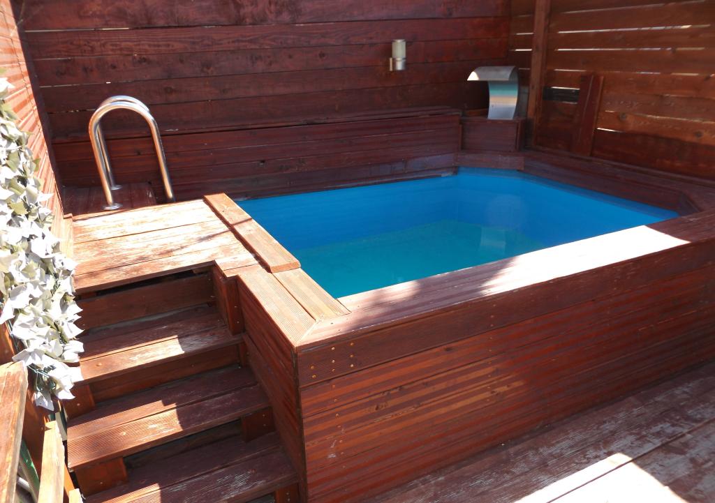 Piscină mică, șezlonguri, parcare acoperită, fiecare apartament are balcon propriu, terasă pentru relaxare, grătar, zonă de relaxare acoperită.