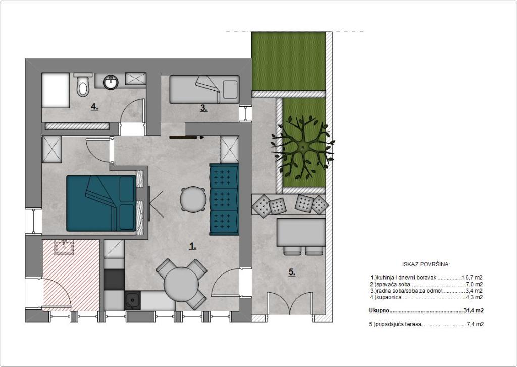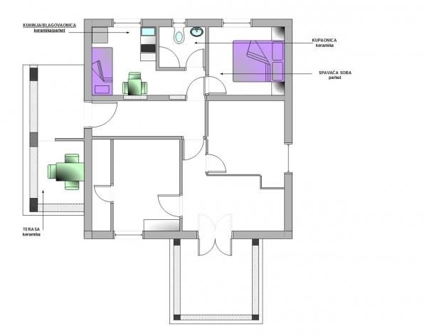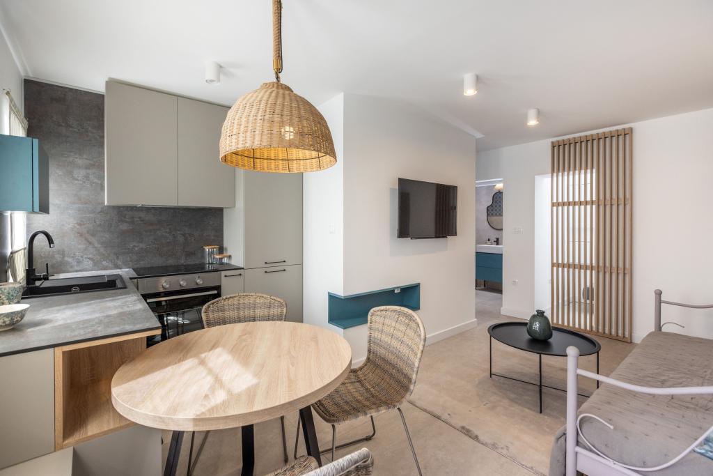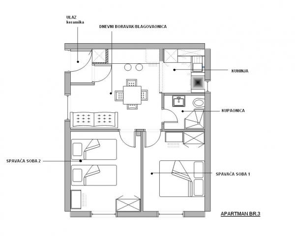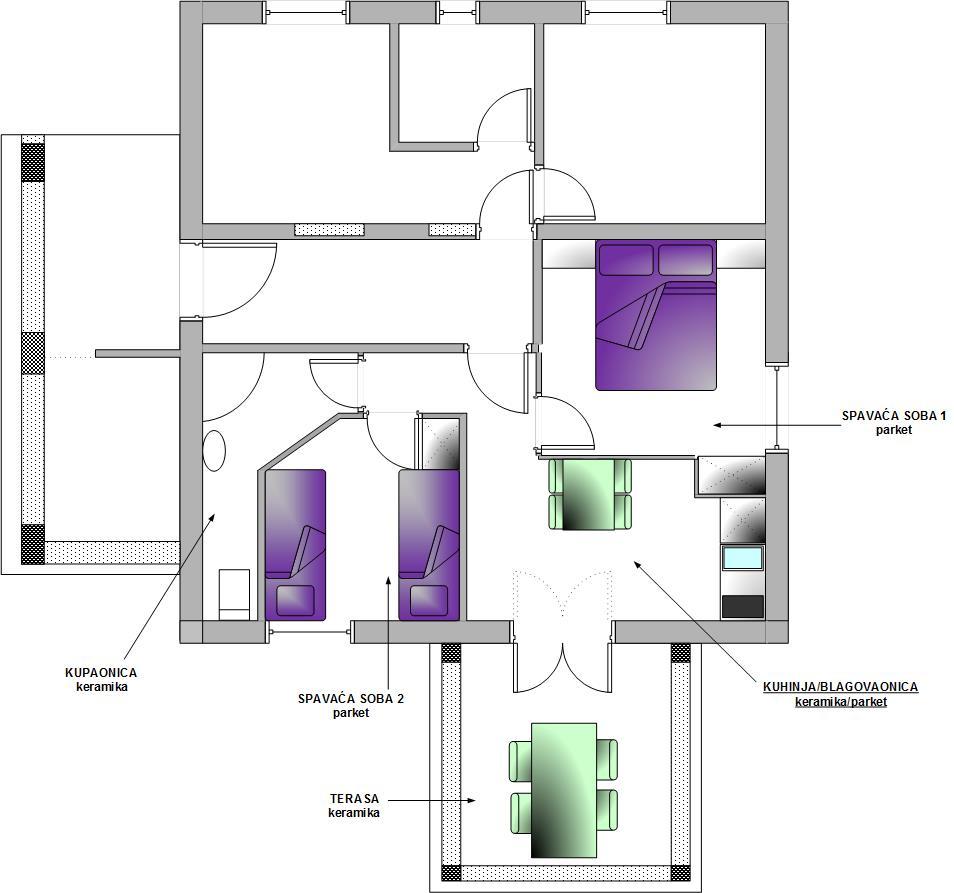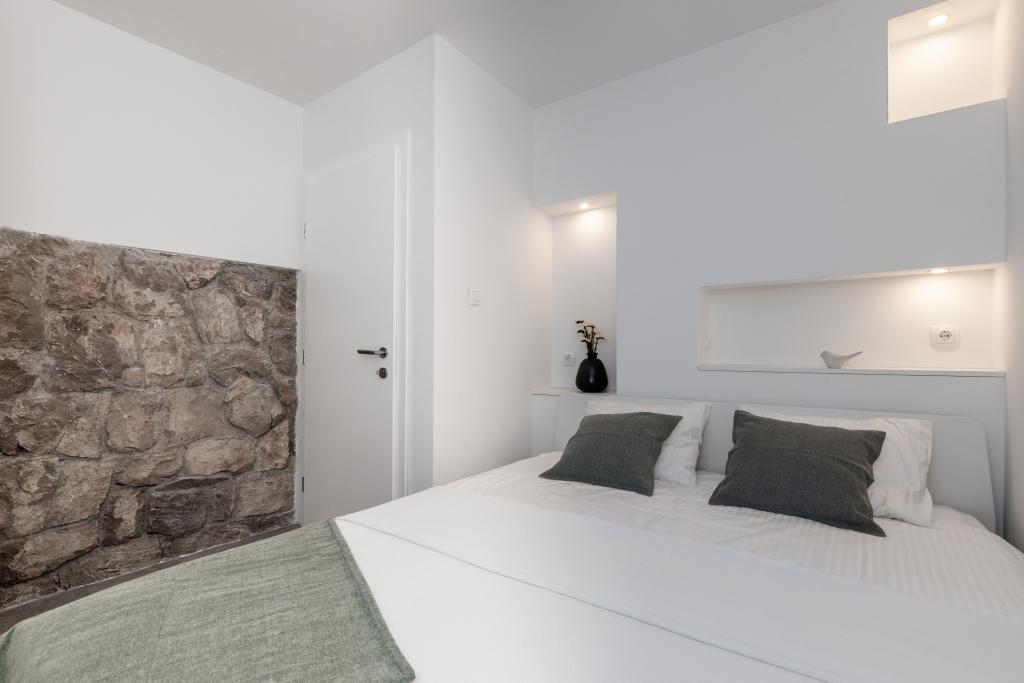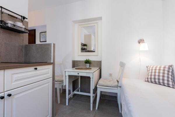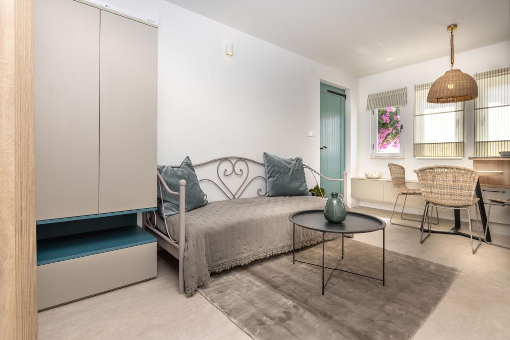 Apartamente complet echipate într-o locație minunată cu vedere la mare într-o casă înconjurată de verdeață. Facilitatea se afla la o distanta de 150 m de mare si plaja, langa care se afla o padure deasa de pini. O promenadă iluminată se întinde prin pădurea de pini de-a lungul mării. Fiecare apartament are bucatarie si baie proprie si 1-2 dormitoare, in functie de apartament. Bucataria are toate electrocasnicele si vasele necesare. Apartamentul are cuptor sau cuptor cu microunde (in functie de apartament). Camerele au paturi confortabile, lenjerie de pat și prosoape sunt furnizate în baie. Apartamentul A4 are o terasa spatioasa cu vedere frumoasa la mare iar terasa este parte integranta a apartamentului. Apartamentul A4+1 are o terasa privata acoperita langa apartament, inconjurata de verdeata. Garsoniera are propria sa terasă privată lângă apartament, separată de pasaj, cu o vedere frumoasă la mare Planul fiecărei unități de cazare este atașat la poze, astfel încât să puteți vedea dimensiunea și amenajarea camerelor . Fiecare apartament are propriul loc de parcare.