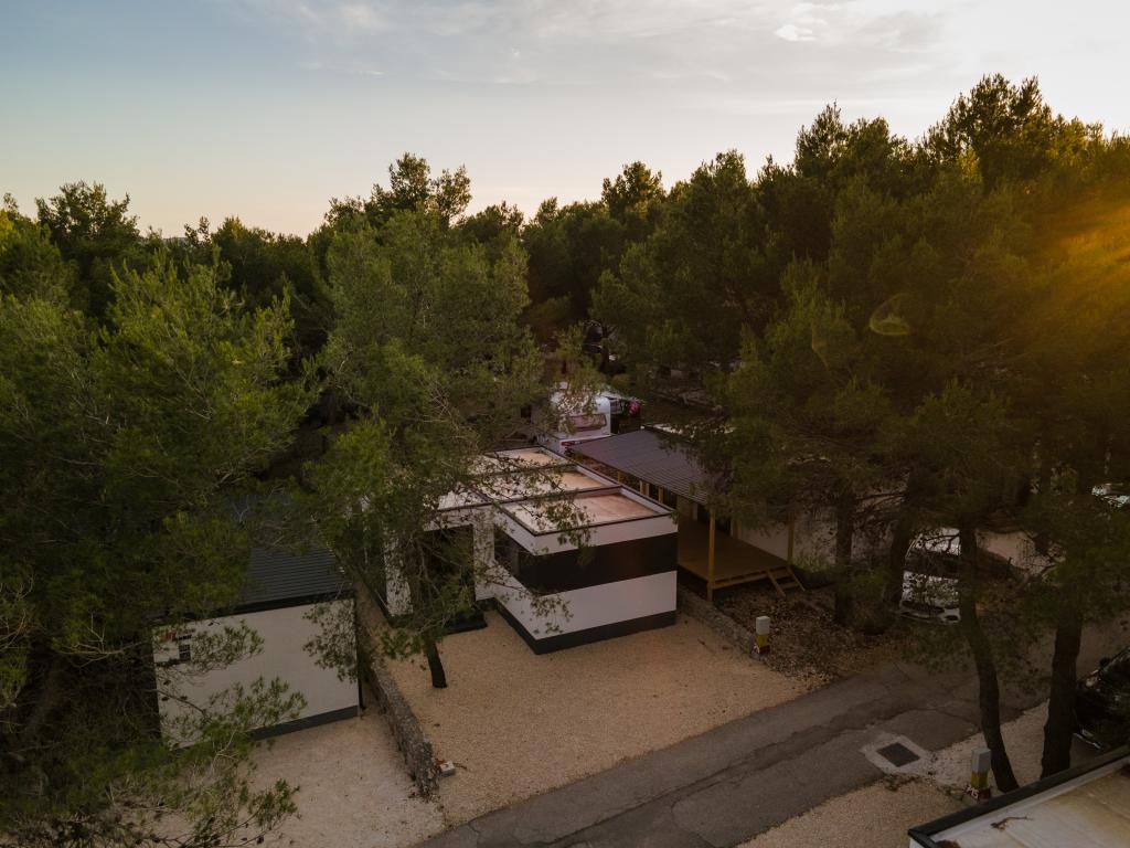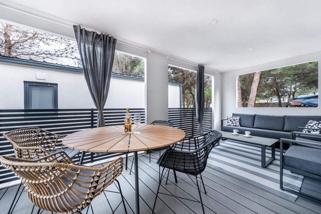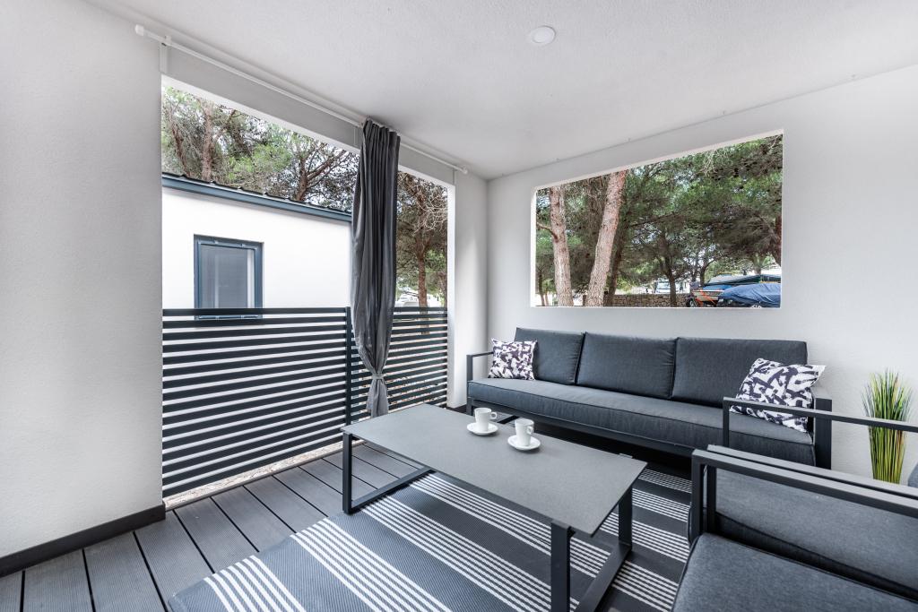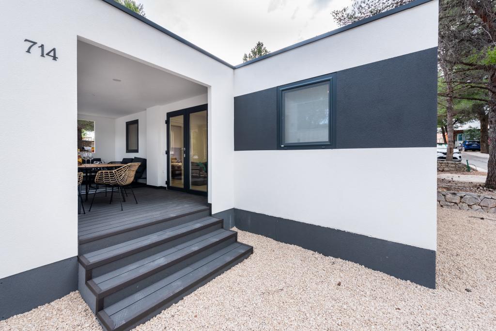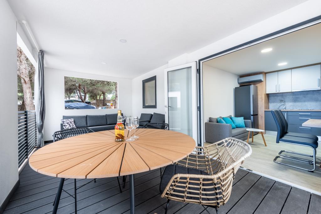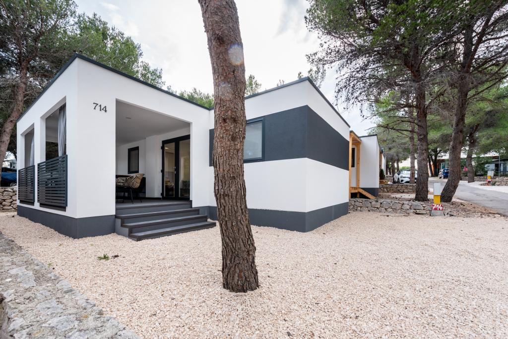 O casă mobilă luxoasă, dotată modern, cu o terasă frumoasă care va satisface toate gusturile. Casa mobila este situata in campingul "Oaza mira" intr-o locatie privilegiata intr-o padure de pini umbrita, la doar 50 m de frumoasa plaja. In imediata apropiere se afla o piscina mare si numeroase facilitati sportive (teren de tenis, teren de bocce, loc de joaca pentru copii). Tabăra are un restaurant, un supermarket și o unitate sanitară mare cu o spălătorie. Casele au fiecare două dormitoare, o cameră cu un pat dublu și o cameră cu două paturi de o persoană. În sufragerie, colțul poate servi drept pat suplimentar pentru încă două persoane. Casa are un living mare, o bucatarie cu vase, aragaz si frigider, si una/doua bai cu dus, chiuveta si toaleta. Casa mobilă are o grădină cu terasă și baldachin.