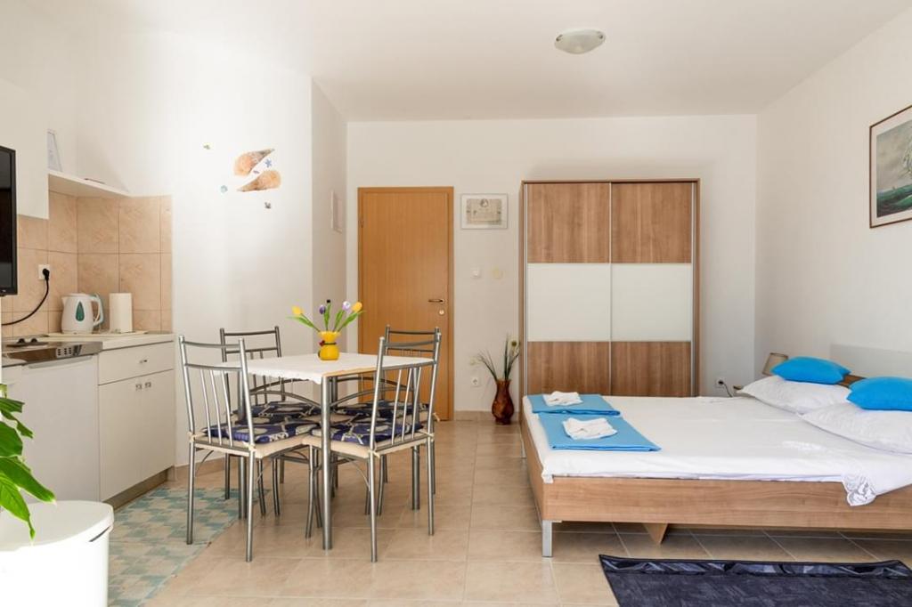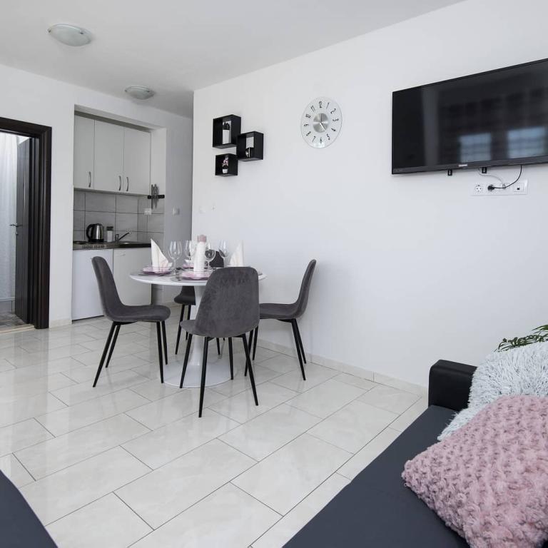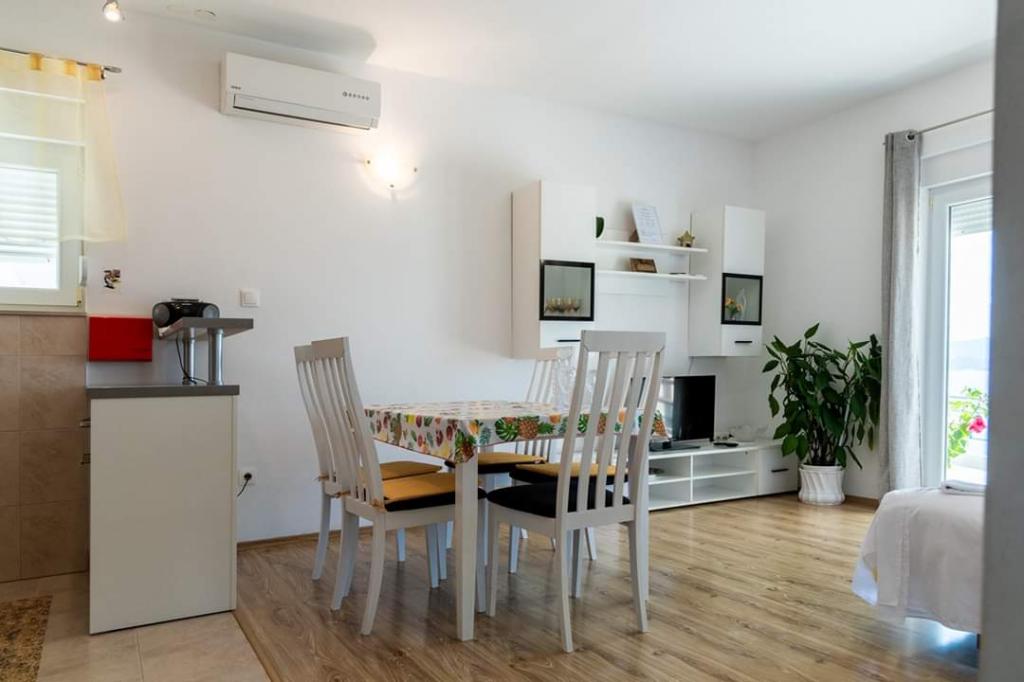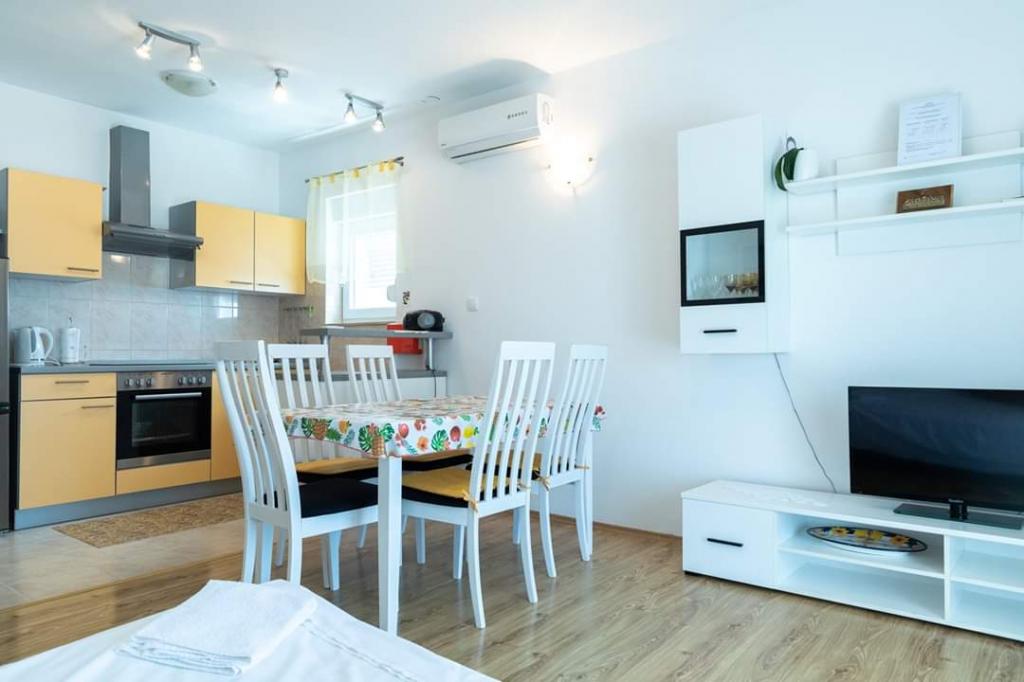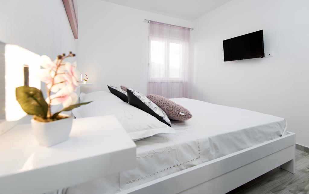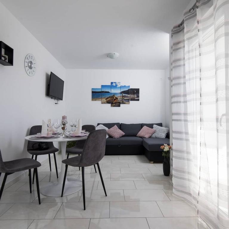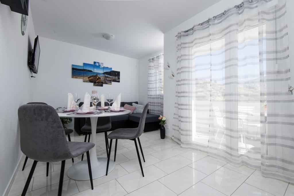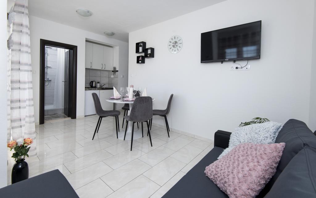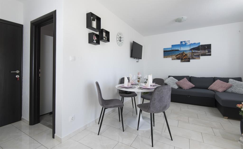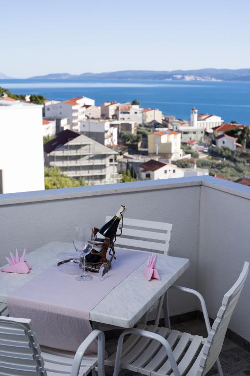 Apartamente complet renovate, cu aer condiționat și vedere la mare într-un loc turistic liniștit. Aproape de diverse facilități de servicii, magazine, baruri, restaurante. Pe plaja cu nisip, împreună cu marea limpede, sunt oferite diverse facilități sportive și de agrement. Oaspeții noștri au, de asemenea, reduceri la anumite restaurante, rafting, plimbări cu barca prin canionul râului Cetina, plimbări cu barca către insula Brac, jet-ski, rent-a-boat și plimbări cu banane și tuburi pentru cei mai tineri. Prețul include internet, SAT, parcare privată și utilizarea grătarului în aer liber.