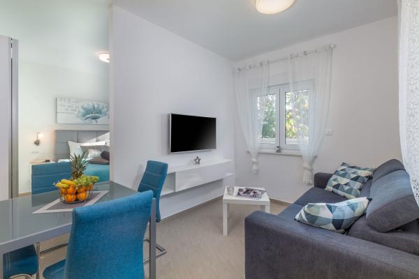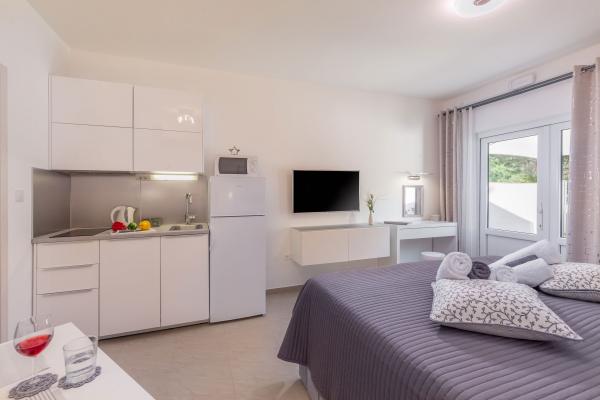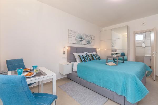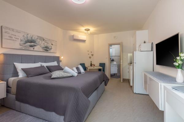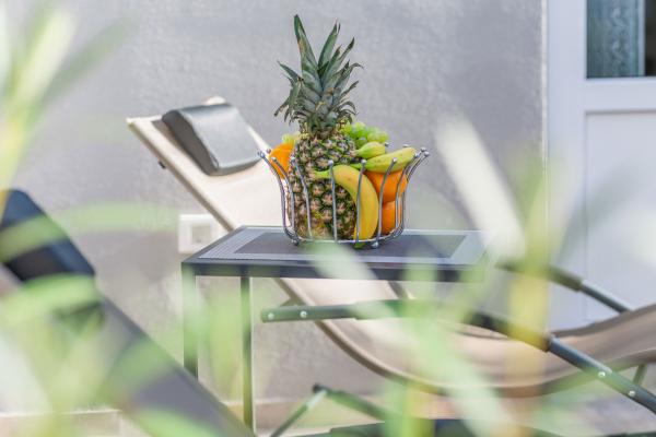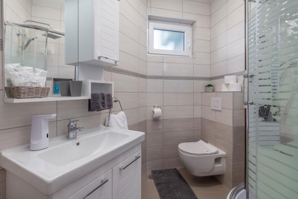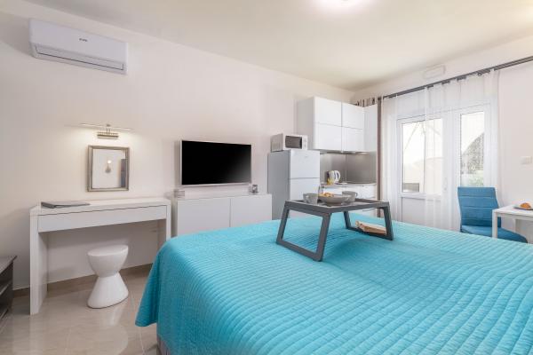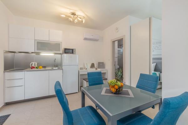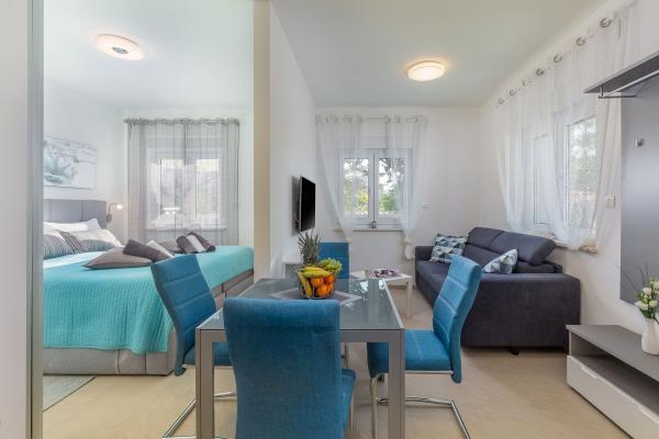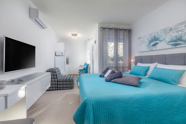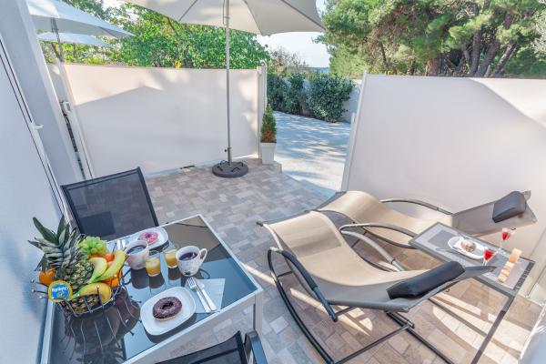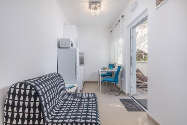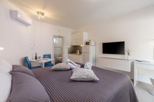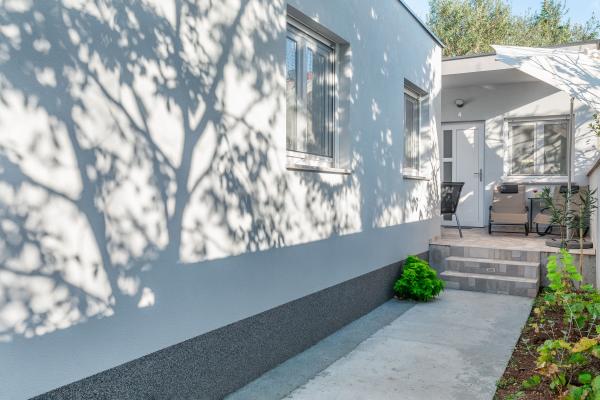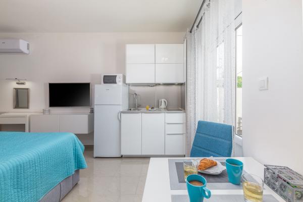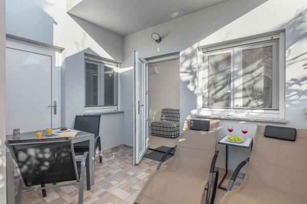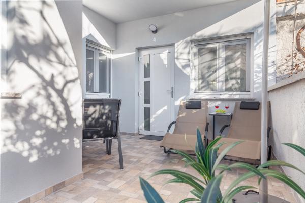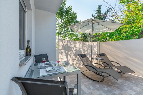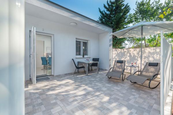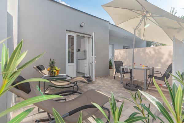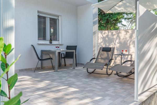eVita Premium Studio apartments are reconstructed in July 2018. It is ground floor house with 4 modern, fully equipped studios for 2. The beach is only 4 minutes walk through the woods and the center of Fažana is 10 minutes walk. Restaurant is 3 minutes walk and bus station is across the street. Come and enjoy this premium studio apartments for 2 :) In the yard there is barbecue for shared use and laundry room for washing and ironing with 2 washing machines, iron with ironing table, washing liquids, fire extinguisher. Inside can be parked 4 cars, each apartment has its own parking place. We hope you will recognize our effort in design of this concept and choose our apartment for you next holiday :) Guests have their own apartment with private entrance and terrace with table and chairs, a sunshade and 2 deck chairs with a side table. Private parking is inside the locked gate and all guests receive keys that open automatic gate, key for pedestrian gate, laundry room and key of ap.