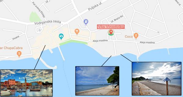 Vila Vinodolka este o casă situată în primul rând la mare, într-un loc liniștit numit Fažana. Se află la 2 minute de mers pe jos de mare și la 5 minute de mers pe jos de centru. Cel mai apropiat centru comercial se află la 5 minute de mers pe jos de apartament. De asemenea, în apropiere se află frumosul Parc Național Brijuni (la 5 minute de mers pe jos până la barcă) și orașul Pula, care se află la 15 minute de mers cu mașina.