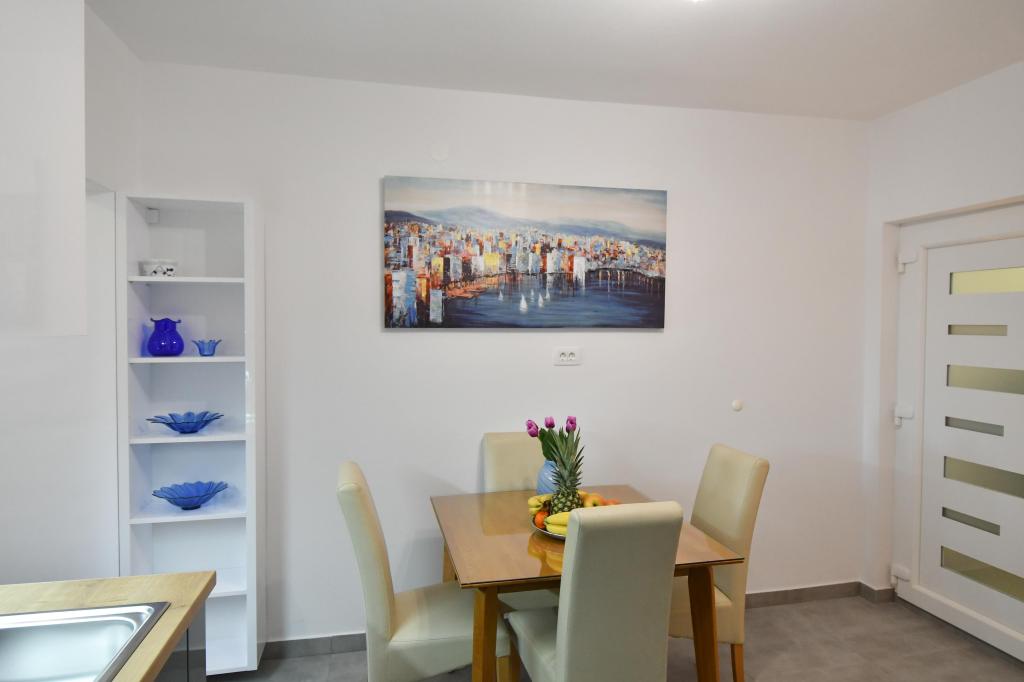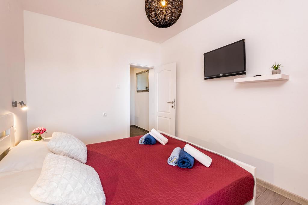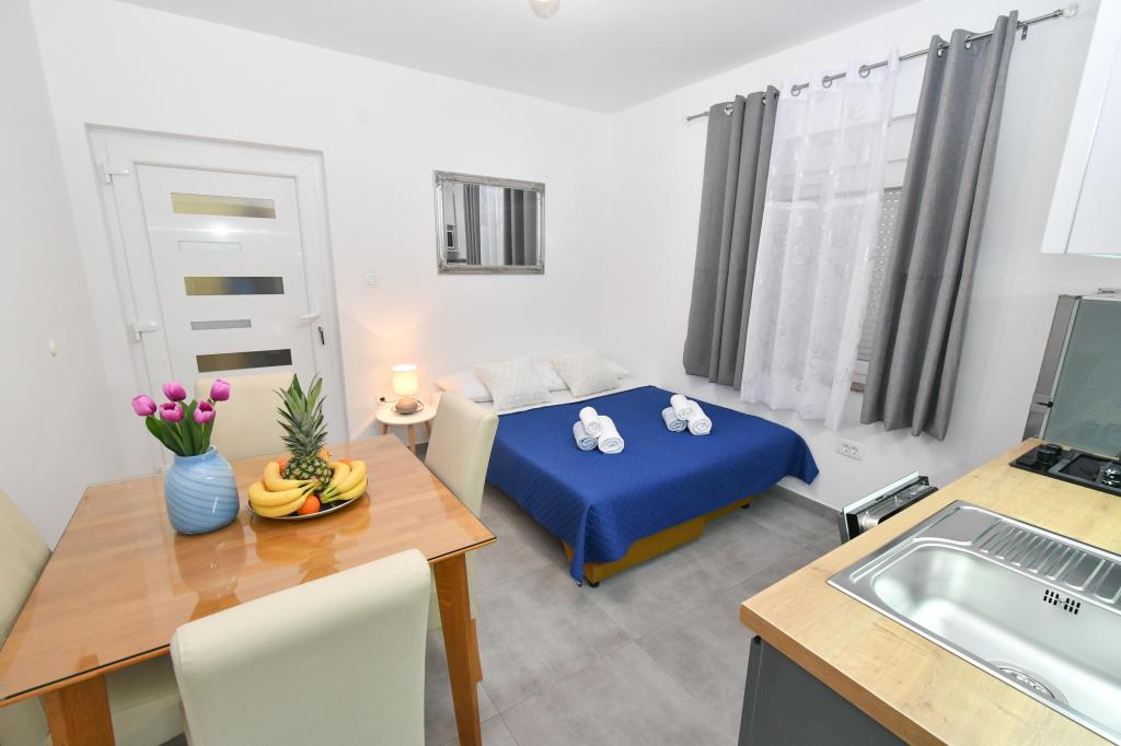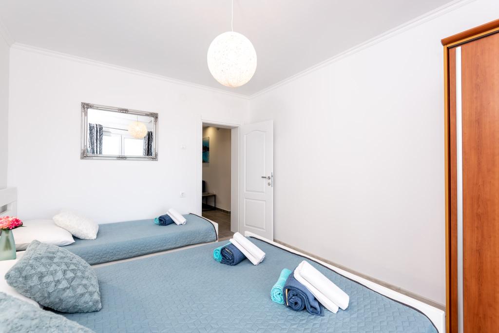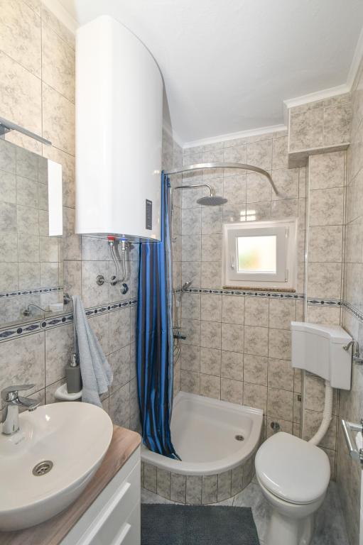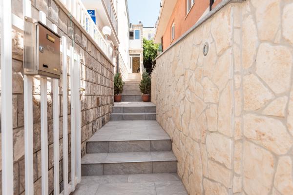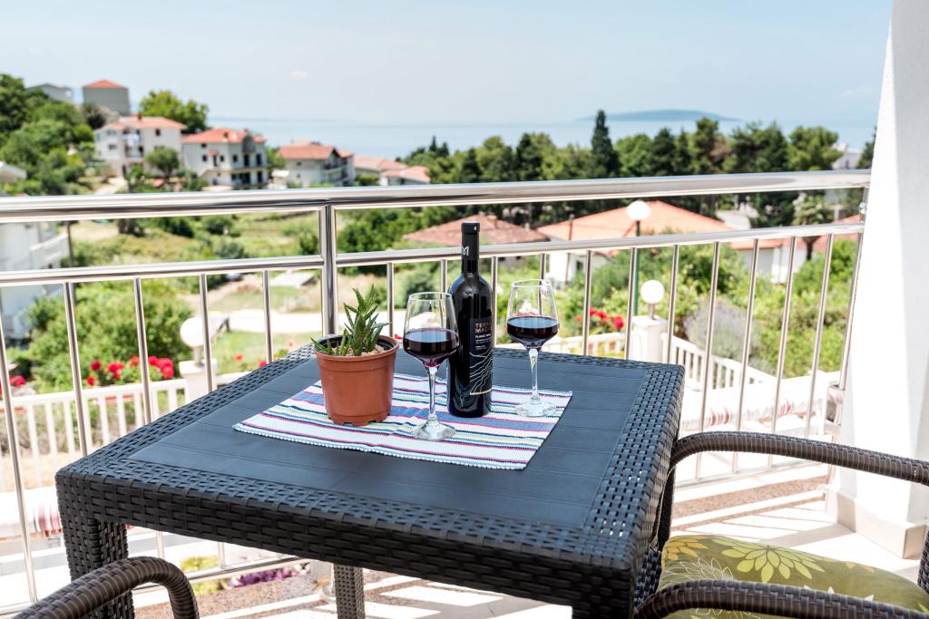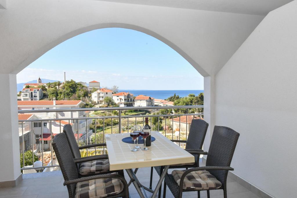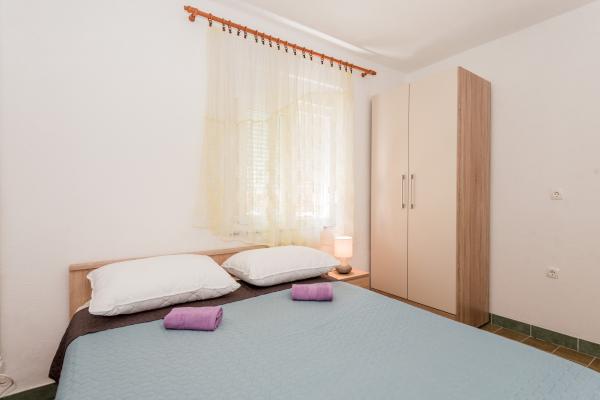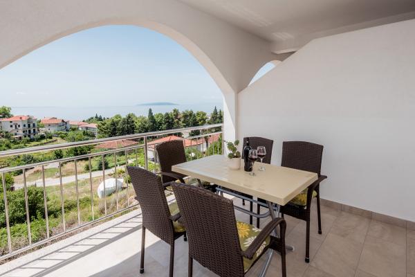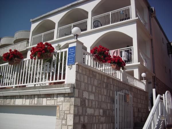 Apartamentele sunt situate în partea centrală a orașului, care sunt la doar 200 m de plajă și centru și alte facilități necesare pentru o vacanță atractivă. De-a lungul coastei se întinde un traseu de drumeții lung de cinci kilometri pentru cei cărora le place mersul pe jos și cu bicicleta. Nu departe de clădire există trei terenuri de tenis pe zgură pentru toți iubitorii de tenis. Casa are cinci apartamente, fiecare cu o terasă privată (10m2) cu vedere la mare. Apartamentele 3, 4 și 5 au două dormitoare și un loc de parcare în garaj care este inclus în preț. Veți fi întâmpinați de gazde prietenoase.