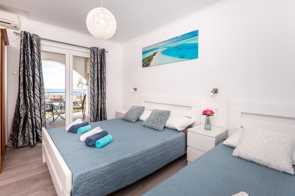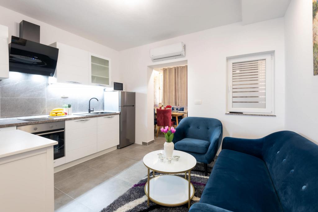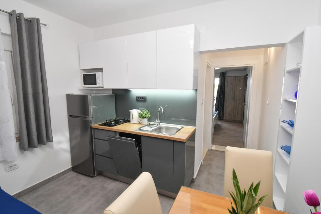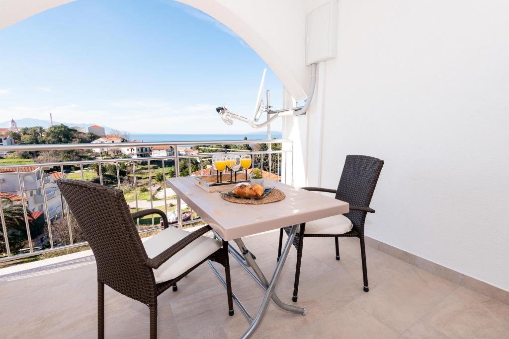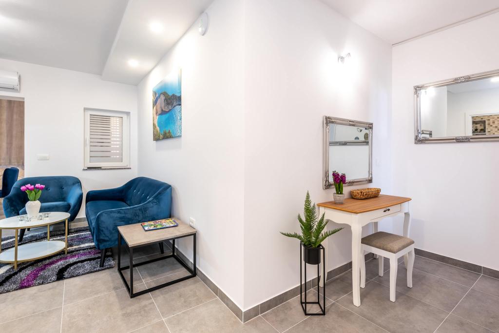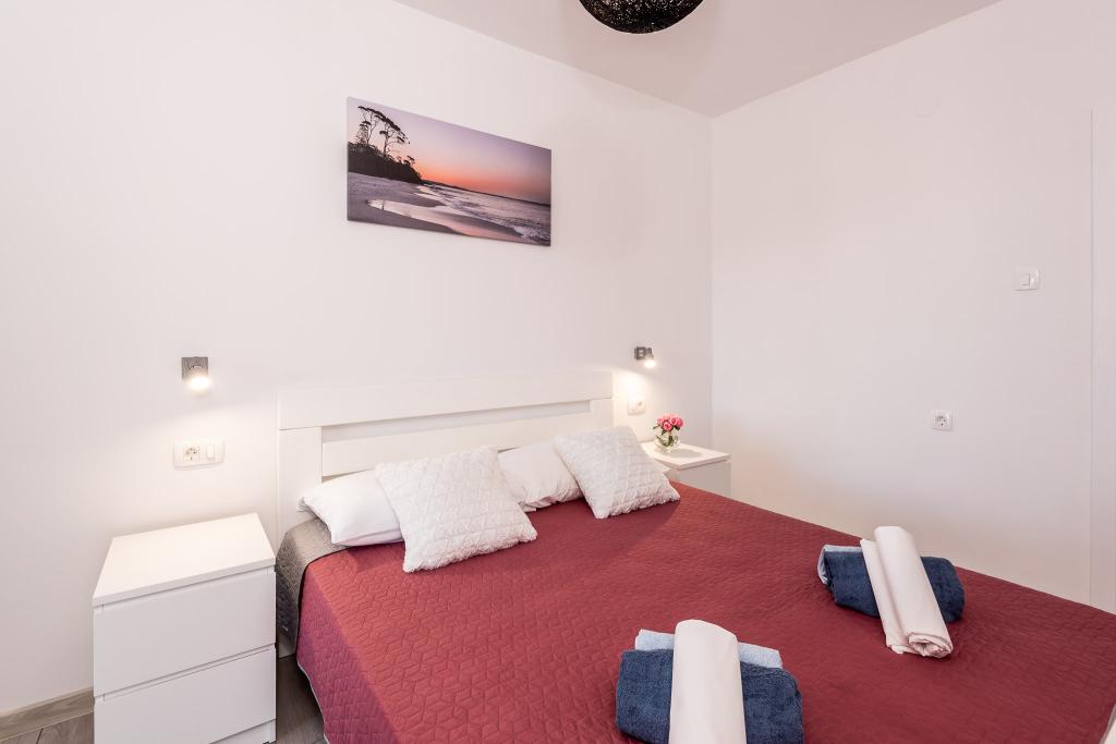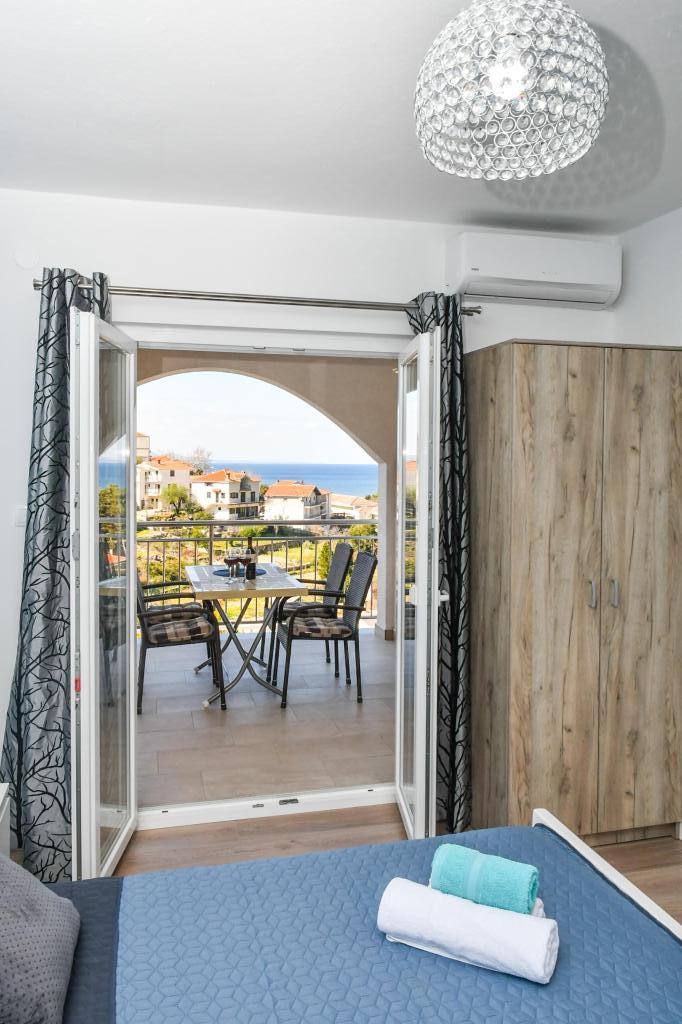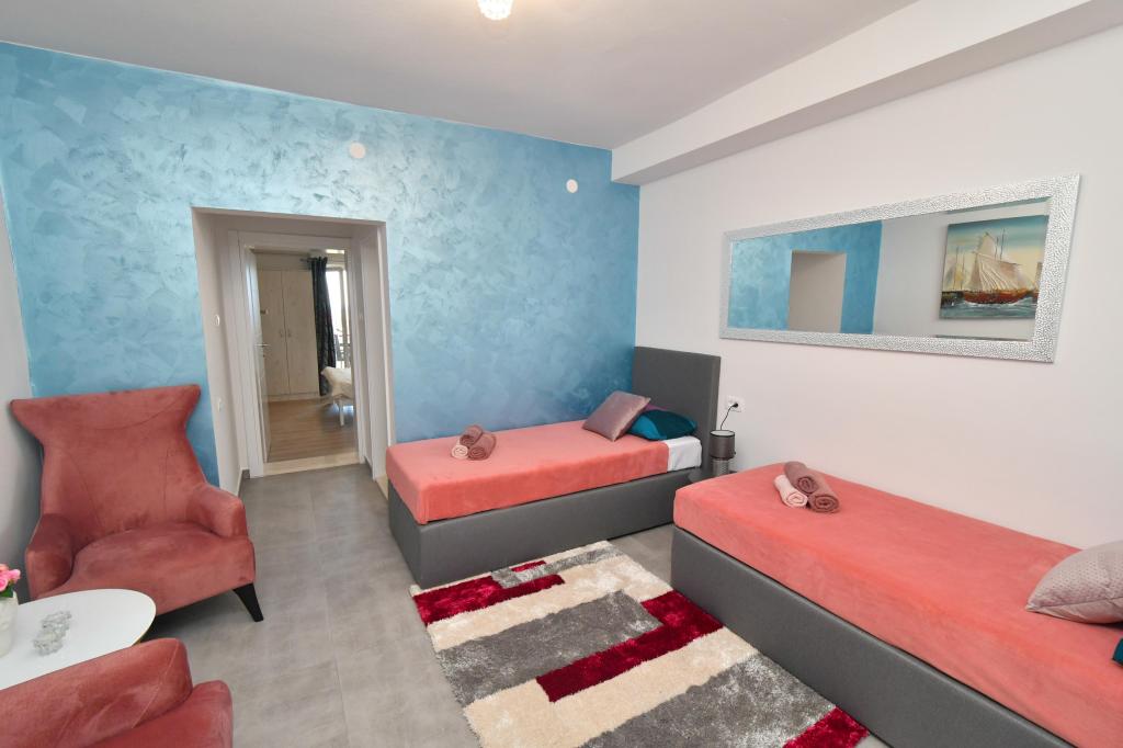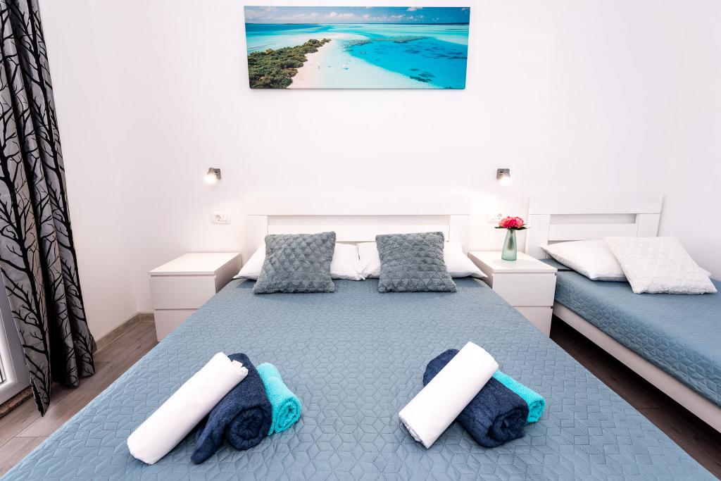Apartamentele sunt situate în partea centrală a orașului, care sunt la doar 200 m de plajă și centru și alte facilități necesare pentru o vacanță atractivă. De-a lungul coastei se întinde un traseu de drumeții lung de cinci kilometri pentru cei cărora le place mersul pe jos și cu bicicleta. Nu departe de clădire există trei terenuri de tenis pe zgură pentru toți iubitorii de tenis. Casa are cinci apartamente, fiecare cu o terasă privată (10m2) cu vedere la mare. Apartamentele 3, 4 și 5 au două dormitoare și un loc de parcare în garaj care este inclus în preț. Veți fi întâmpinați de gazde prietenoase.