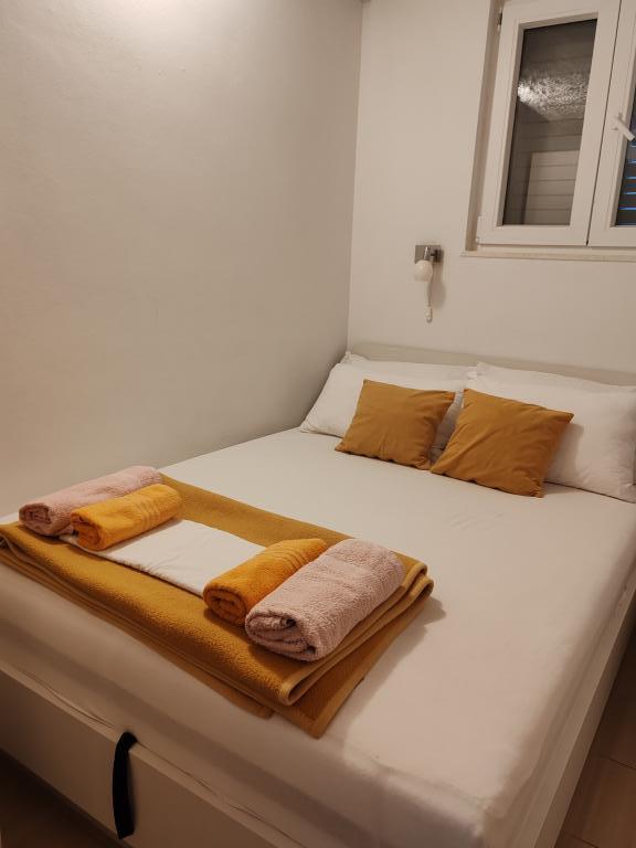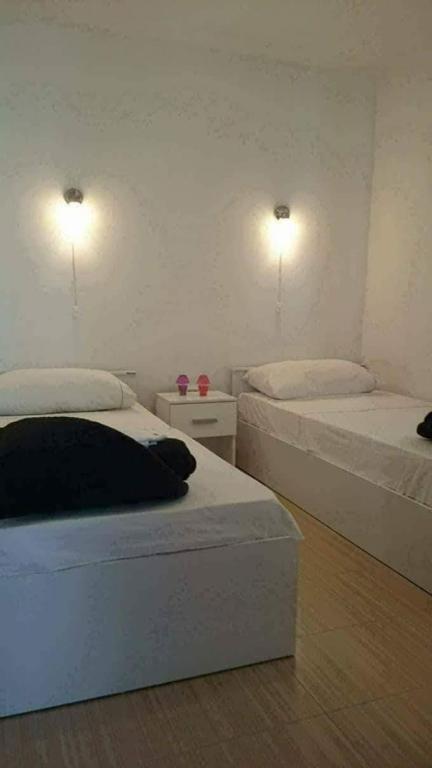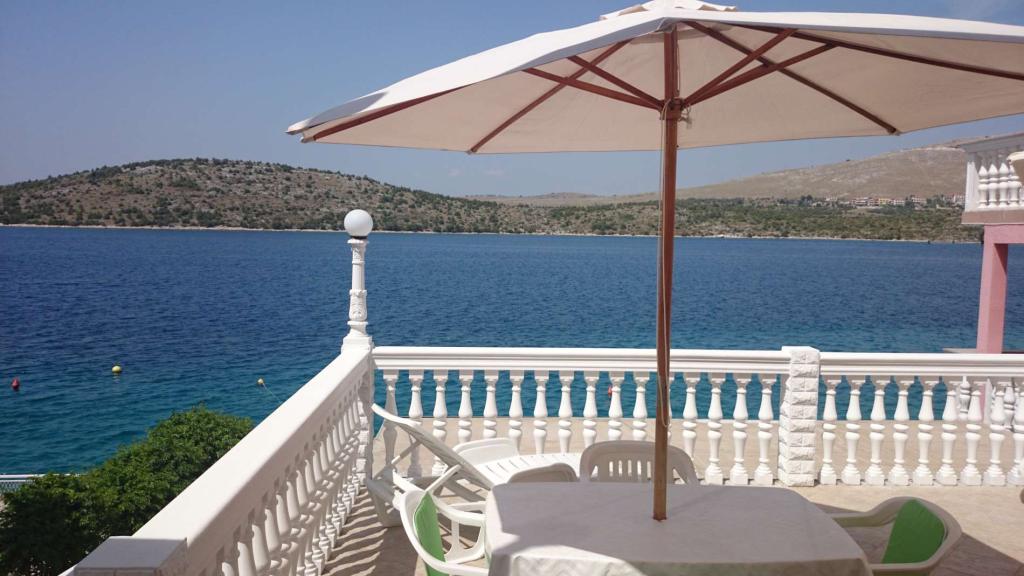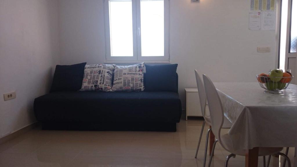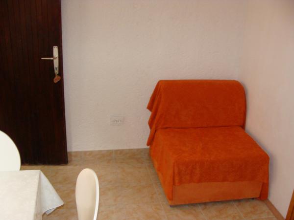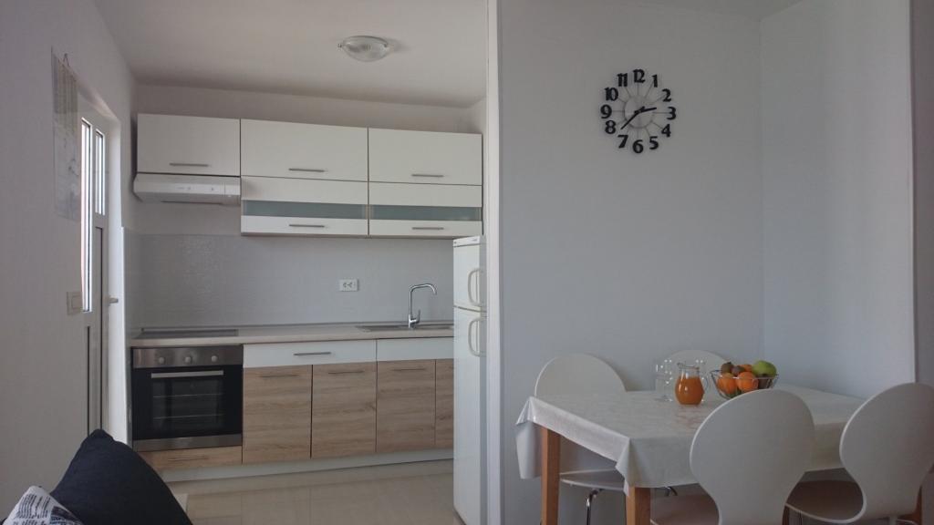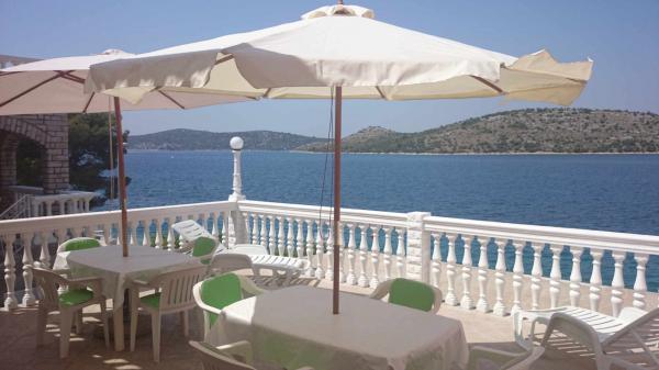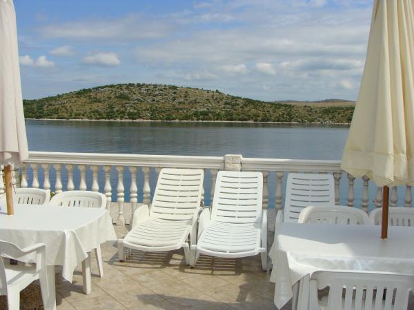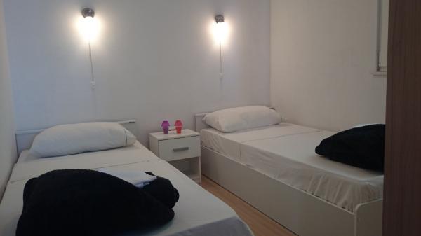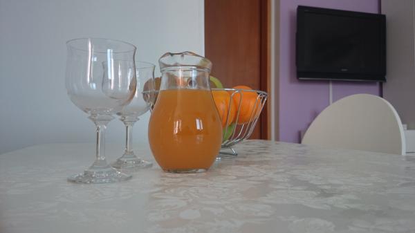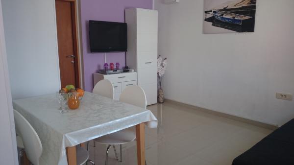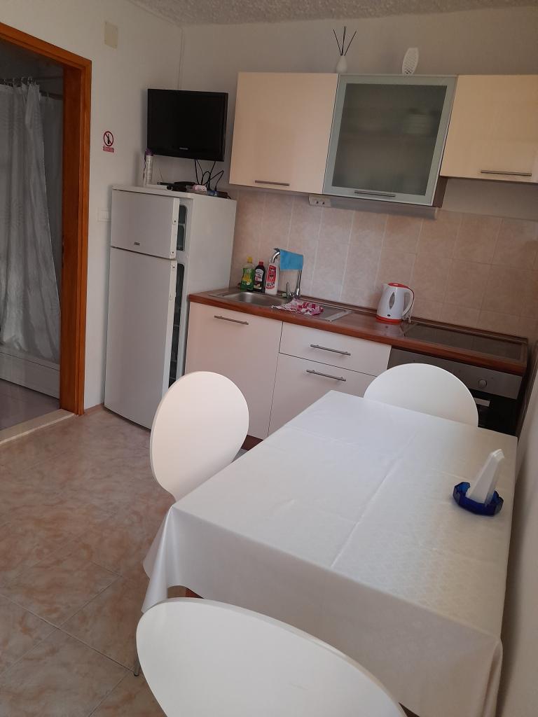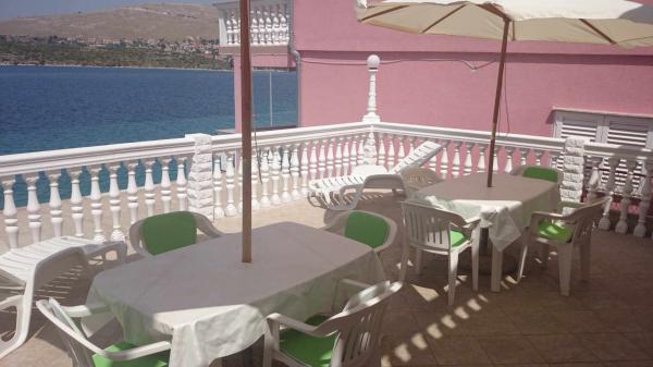 Apartamente la 7 metri de mare pentru 7 - 8 persoane pe o terasă de 34m2 cu vedere la mare. Apartamentele au o bucătărie cu ustensile de gătit și servire, un living cu o canapea extensibilă pentru relaxare sau dormit, TV prin satelit, aer condiționat, acces la internet, 3 dormitoare (2 camere duble și 1 cameră triplă) cu prosoape și lenjerie de pat, un pat suplimentar, o baie cu duș, toaletă și mașină de spălat, un grătar. Pe terasă există mobilier de grădină pentru 8 persoane, șezlonguri, 2 biciclete, parcare, plaja este la 7 metri de apartament. Avem un magazin mobil (microbuz) care ne aprovizionează cu produse de bază în fața apartamentului. Acesta este un loc ideal pentru o vacanță cu copii, rude sau prieteni.