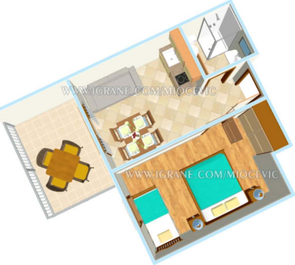 Complet echipate și apartamente moderne Miočević sunt situate într-o zonă liniștită din jocuri, la numai 20 de metri distanță de centru și la 2 minute de mers de plajă. Apartamentele sunt de brand nou, aer condiționat, Wi - Fi Zone, și au locuri de parcare în apropiere. Clădirea are o grădină mare, înconjurată de flori și verdeață. Pe timp de noapte este foarte liniștită, deoarece nu există facilități de catering în apropiere. Gazdele au timp svokom la dispoziție.