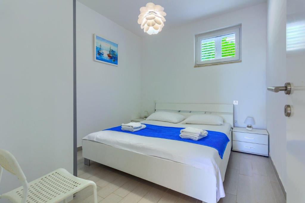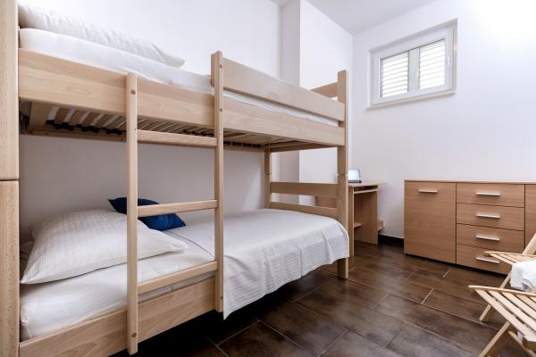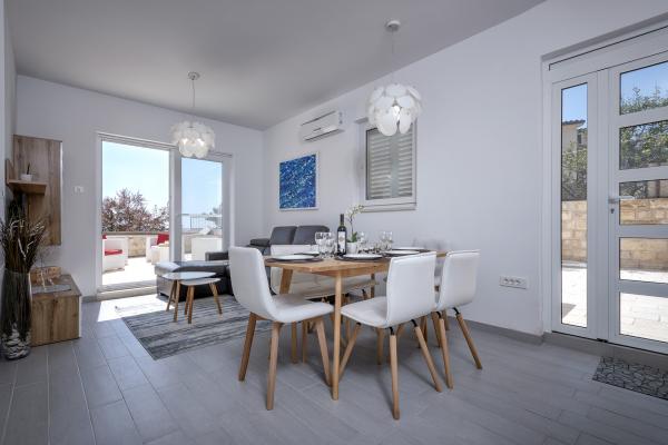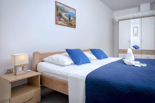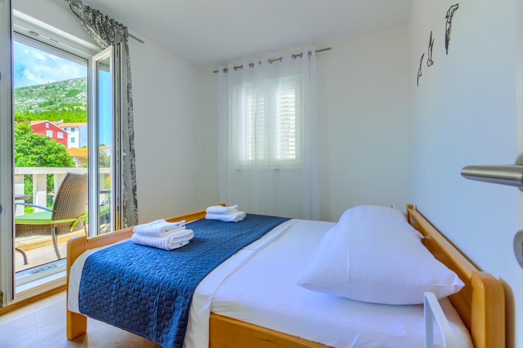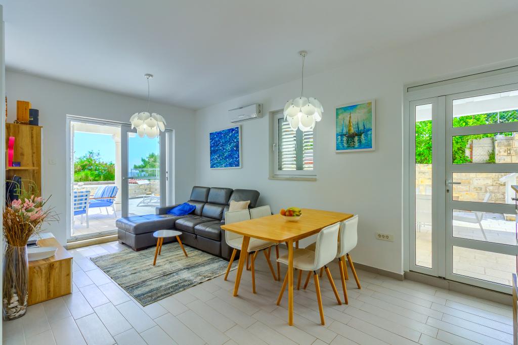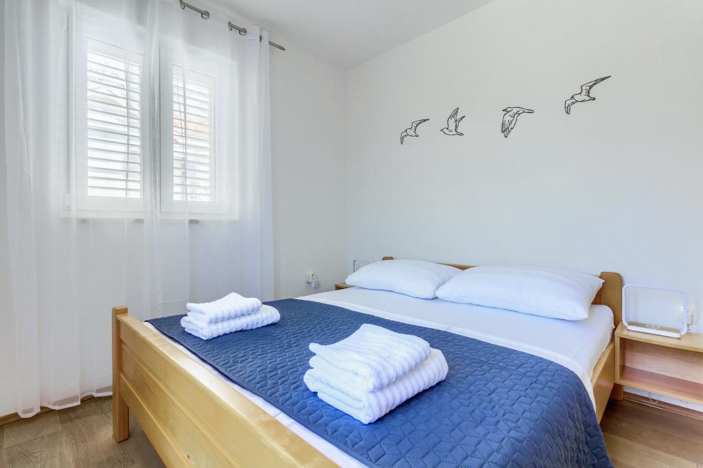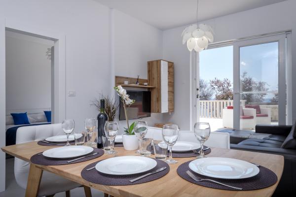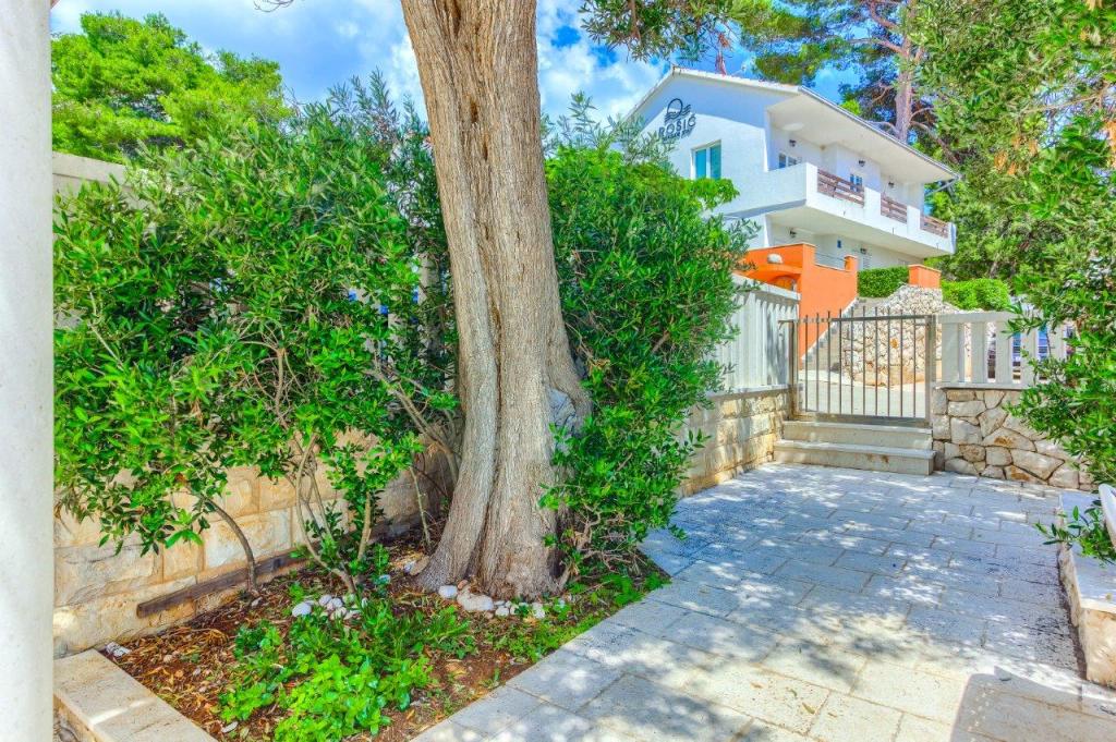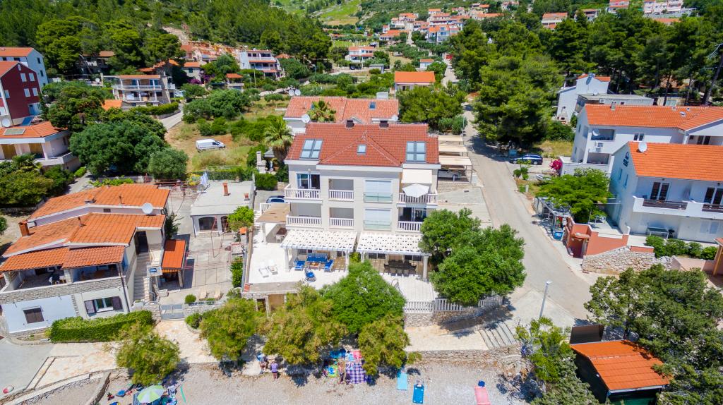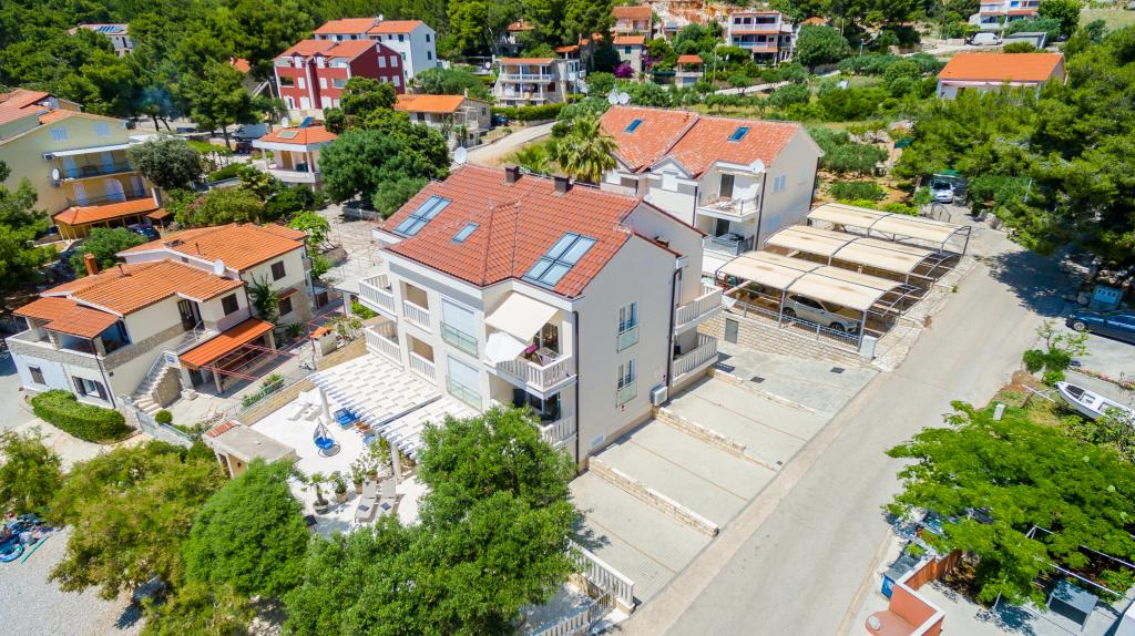 Apartamentele nou construite și echipate modern sunt situate chiar lângă plajă, în orașul liniștit Ivan Dolac. Apartamentele Unit 1 și Unit 6 sunt pentru 4 persoane, sunt compuse dintr-un dormitor cu pat dublu 160 x 200, o baie cu duș, o bucătărie și o sufragerie și un living cu SAT-TV și o canapea extensibilă, si o terasa cu o frumoasa vedere la plaja, mare si insule. Apartamentele P1 și P2 sunt pentru 8 persoane, sunt formate din 3 dormitoare și o canapea extensibilă în living, 2 băi, o bucătărie complet utilată cu mașină de spălat vase, o sufragerie și o masă pe terasa mare din față cu vedere. de la mare. Apartamentul P2 are o suprafață mai mare decât P1, deoarece are un dormitor întreg și o baie la etaj. Un restaurant și cafenele sunt la numai 20 de metri, iar un magazin la 100 de metri de apartament. Deși casa este situată chiar în centrul acestui mic oraș turistic, oferă liniște și intimitate completă, deoarece oaspeții sunt în mare parte familii cu copii mici care se bucură de plajele frumoase și de marea limpede.