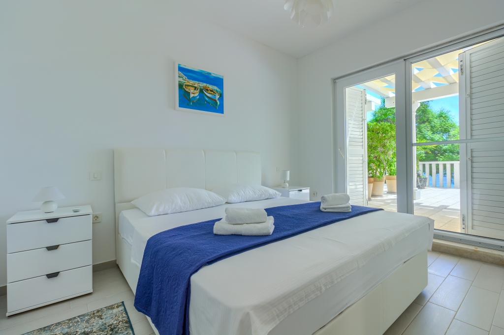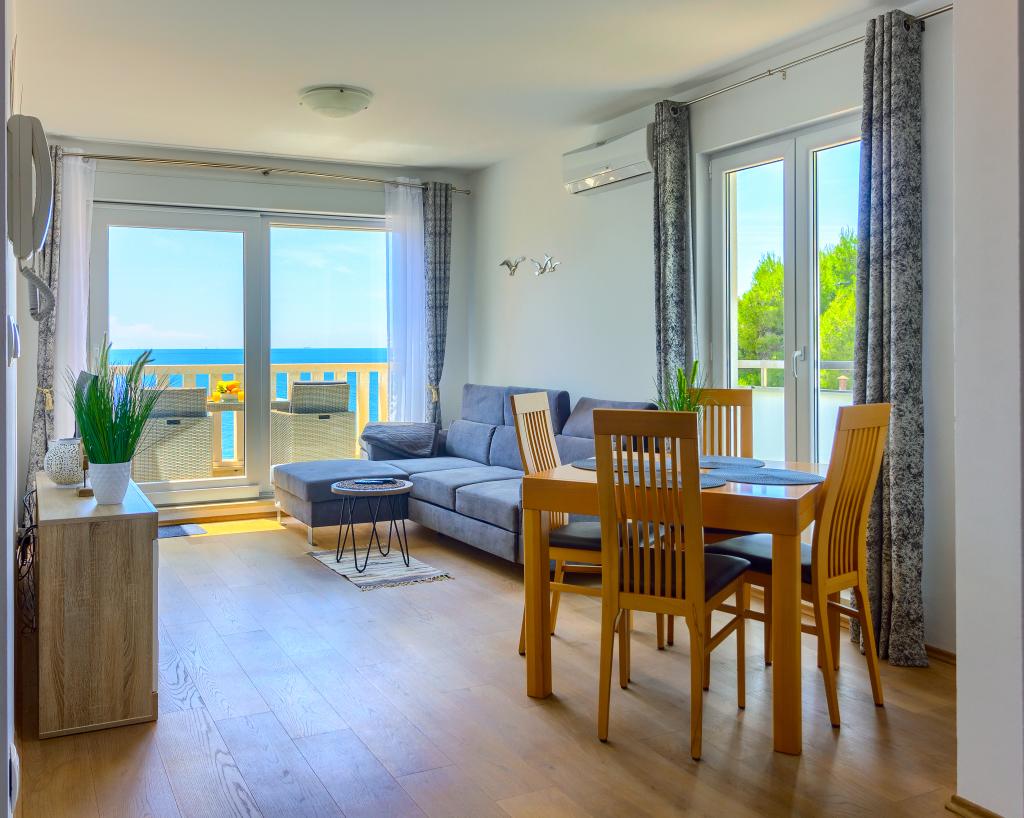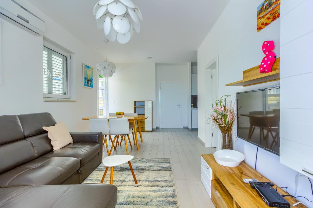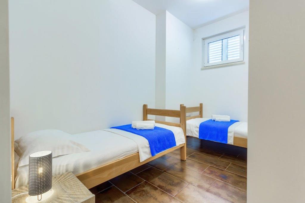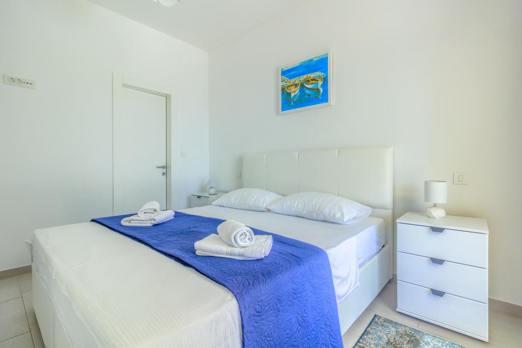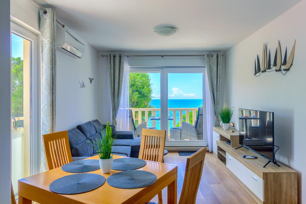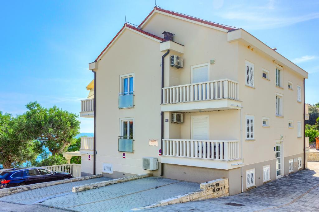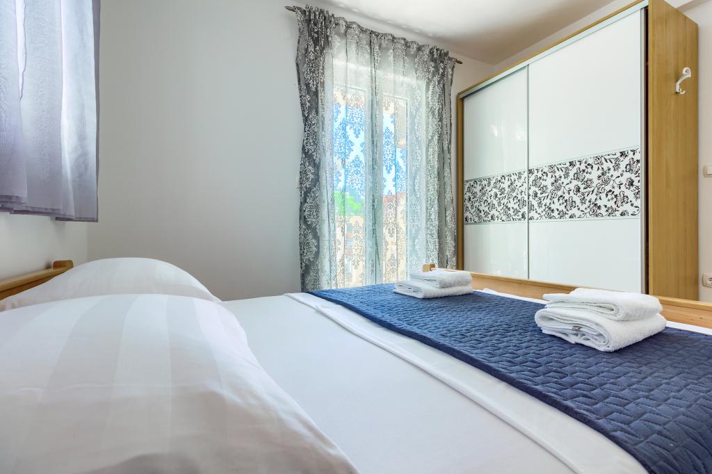 Apartamentele nou construite și echipate modern sunt situate chiar lângă plajă, în orașul liniștit Ivan Dolac. Apartamentele Unit 1 și Unit 6 sunt pentru 4 persoane, sunt compuse dintr-un dormitor cu pat dublu 160 x 200, o baie cu duș, o bucătărie și o sufragerie și un living cu SAT-TV și o canapea extensibilă, si o terasa cu o frumoasa vedere la plaja, mare si insule. Apartamentele P1 și P2 sunt pentru 8 persoane, sunt formate din 3 dormitoare și o canapea extensibilă în living, 2 băi, o bucătărie complet utilată cu mașină de spălat vase, o sufragerie și o masă pe terasa mare din față cu vedere. de la mare. Apartamentul P2 are o suprafață mai mare decât P1, deoarece are un dormitor întreg și o baie la etaj. Un restaurant și cafenele sunt la numai 20 de metri, iar un magazin la 100 de metri de apartament. Deși casa este situată chiar în centrul acestui mic oraș turistic, oferă liniște și intimitate completă, deoarece oaspeții sunt în mare parte familii cu copii mici care se bucură de plajele frumoase și de marea limpede.