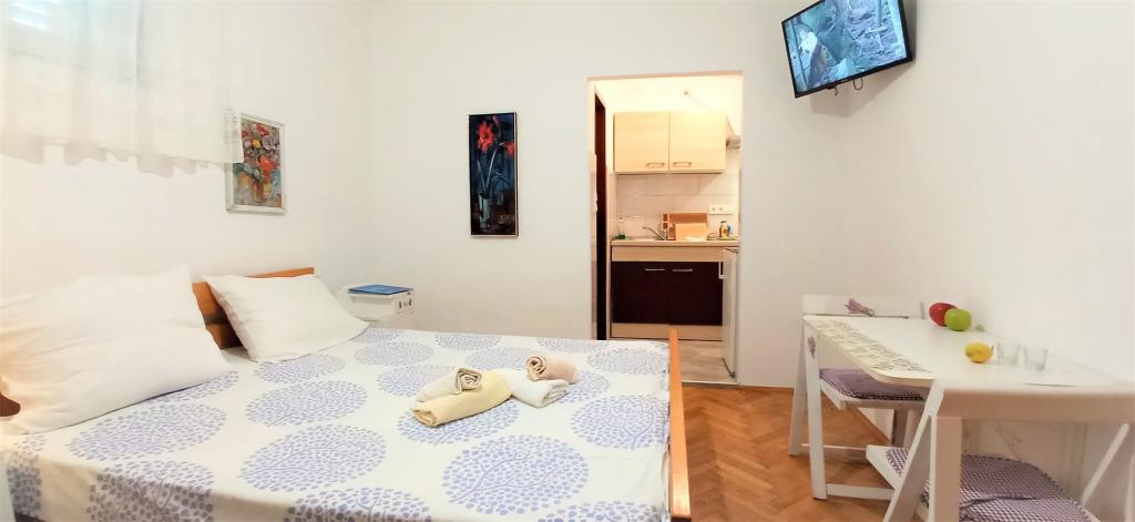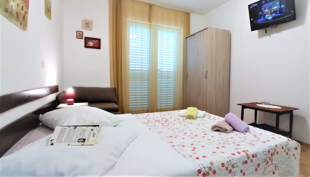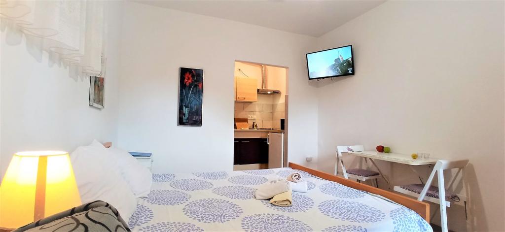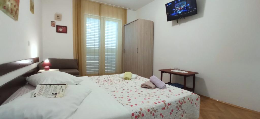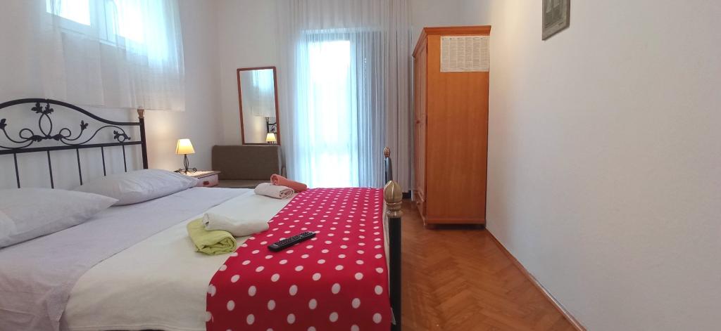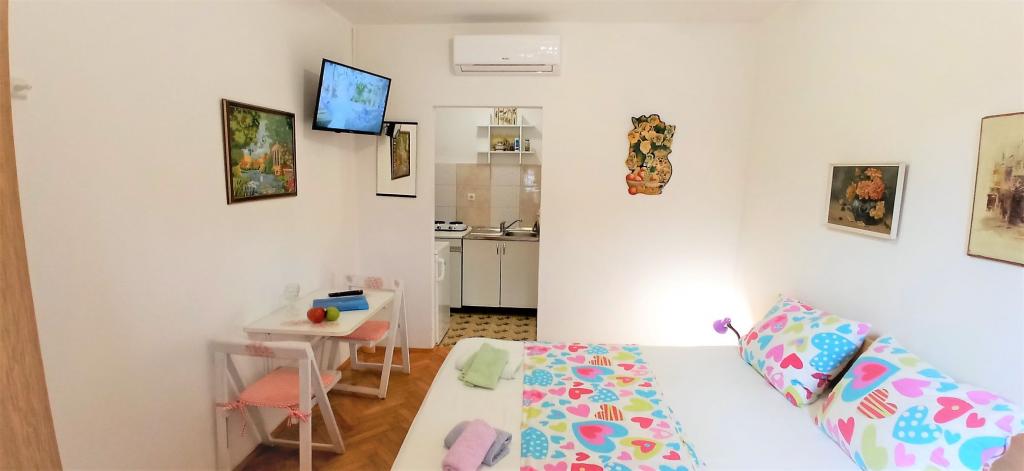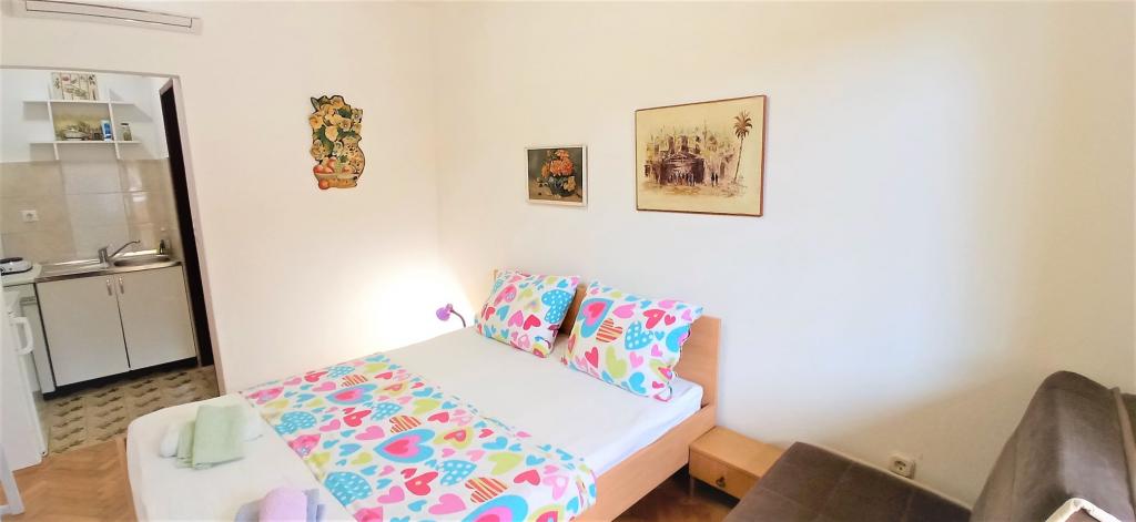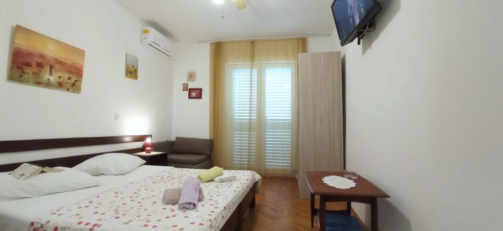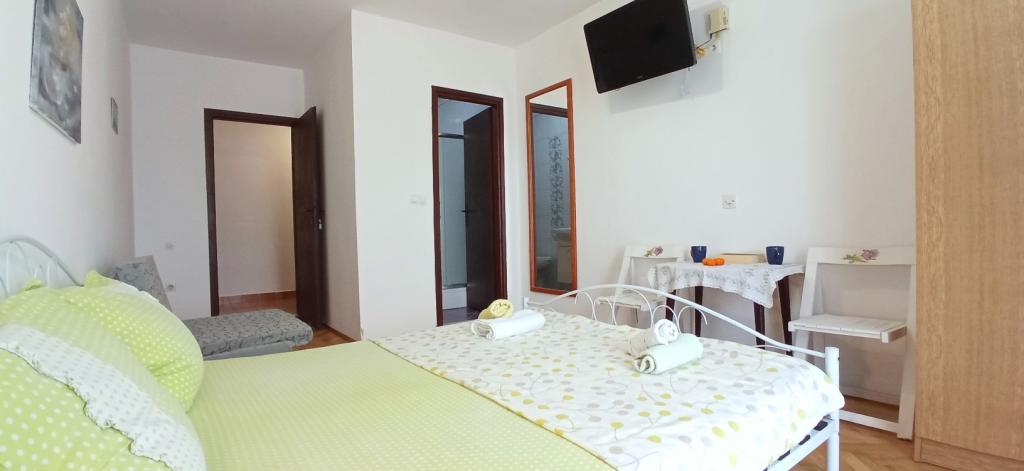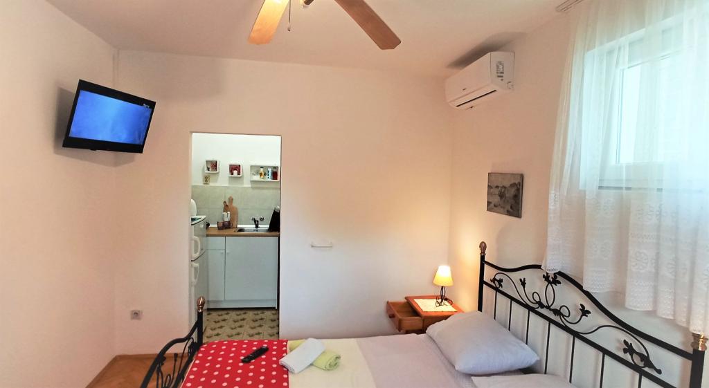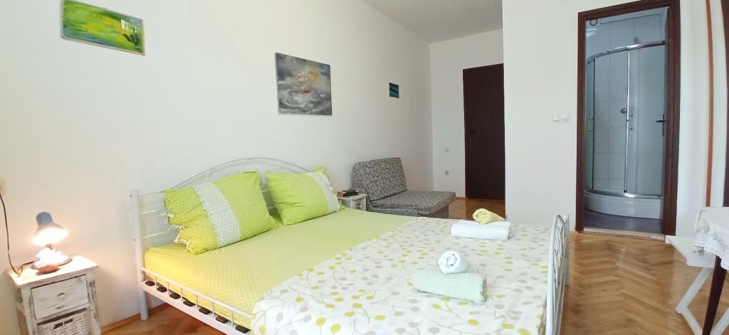 Casa este situată într-o zonă liniștită din Jelsa lângă o pădure de pini și la mare. Mare este de aproximativ 70 m, iar mai multe plaje este la doar câteva minute de acasă. In casa noastra va oferim: 3 apartamente studio. Fiecare apartament are un dormitor, baie și bucătărie, precum și o masă și scaune în fața apartamentului, lângă grădina. Un apartament de studio are o terasă mare. 2 camere. Fiecare are propria sa, WC, bucătărie și balcon cu masă și scaune și o vedere la mare. De asemenea, este posibil de a închiria ambele camere ca un apartament pentru o intrare comună, care este separat de celelalte apartamente. Apartament cu 1 dormitor cu un living, bucatarie, sala de mese, balcon cu vedere la mare și o terasă cu masă și scaune în fața apartamentului. In camera cu balcon și pat suplimentar, o canapea în camera de zi poate fi transformat într-un pat pentru două persoane.