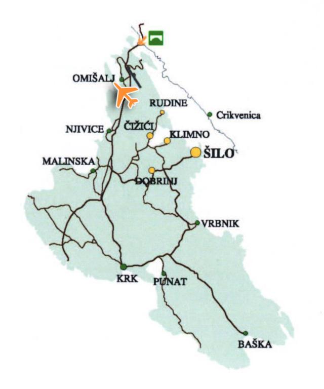 Plaja și campingul cu restaurant, magazin și bar pe plajă sunt la 250 m, iar un alt magazin, cafenea și 2 restaurante sunt la 600 m în centrul orașului, iar în golf există și o patiserie, o brutărie, cafenele și mai multe restaurante. Malinska este la 12 km și are toate facilitățile precum restaurante, baruri, farmacii, benzinărie, supermarketuri, discotecă, hoteluri, stație de autobuz, schi nautic. Aeroportul Rijeka este la 14 km.