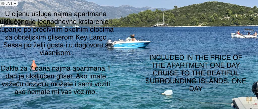 În prețul cazării sunt incluse următoarele: prețul serviciului de închiriere a apartamentelor include o croazieră de o zi și înot pe frumoasele insule din jur cu barca cu motor a familiei Key Largo Sessa, la cererea oaspetelui și de comun acord cu proprietarul. . Deci, pentru 7 zile de închiriere a unui apartament, 1 zi include o barcă cu motor. Daca ai permis valabil, poti conduce singur, daca nu ai, noi te vom conduce Apa Electricitate SUP Utilizare aer conditionat Folosire biciclete Utilizare colt copii cu tobogan si casa Tenis de masa Wi-fi Parcare gratuita Lenjerie de pat si prosoape Curatenie apartament Taxa turistica 1 sticla de ulei de masline extravirgin Sezlonguri moderne cu umbrela de soare Fara costuri suplimentare...