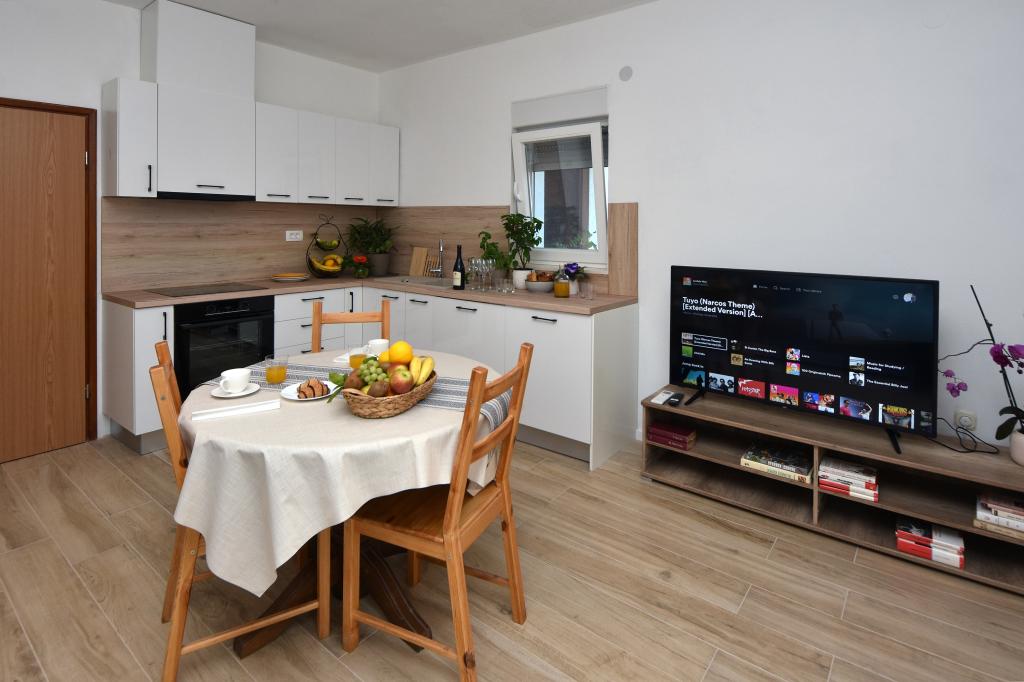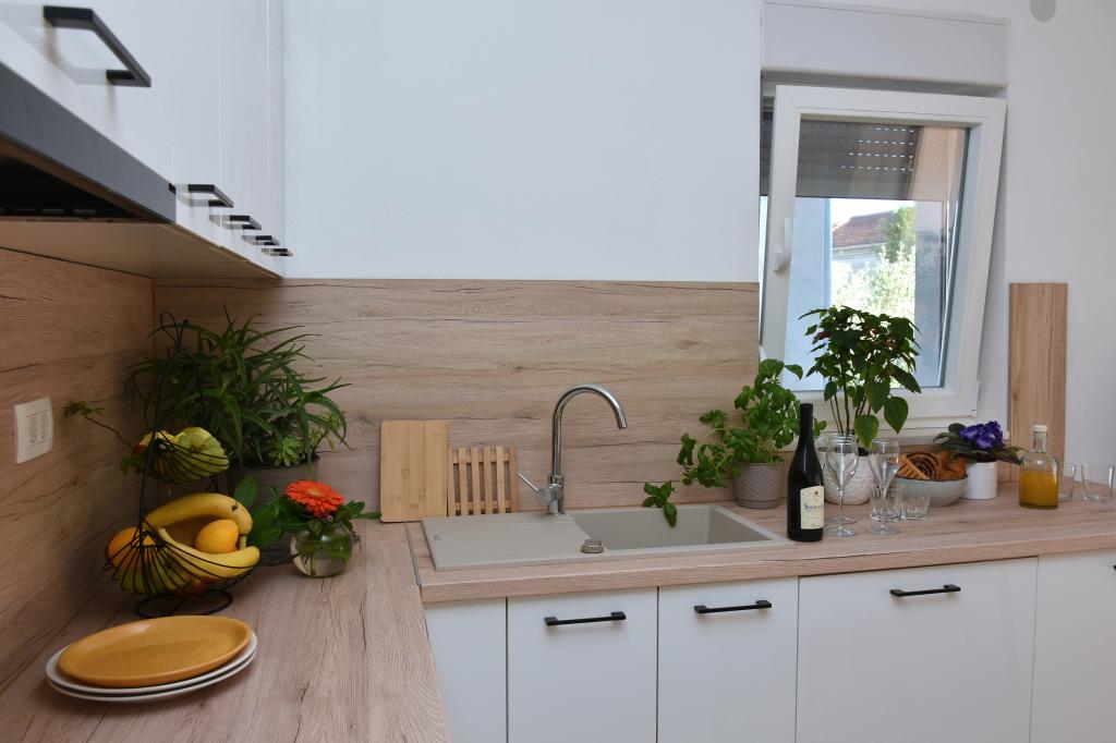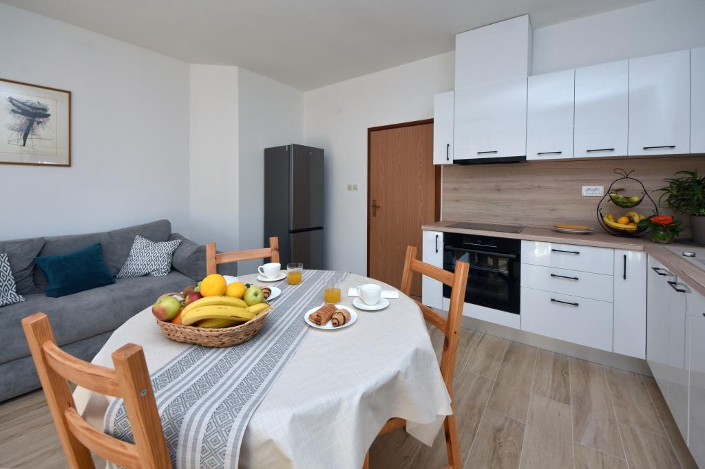 Apartamentul este situat in casa familiei, care este inconjurata de maslini, flori si ciripit de pasari. Daca iti doresti un colt linistit, acesta este locul perfect pentru a te odihni langa casa se afla o statie de autobuz, restaurante, o farmacie, un loc de joaca, iar plaja este la 700 de metri. Este nevoie de 2-3 minute până la plajă cu mașina și aproximativ 10 minute de mers pe jos.