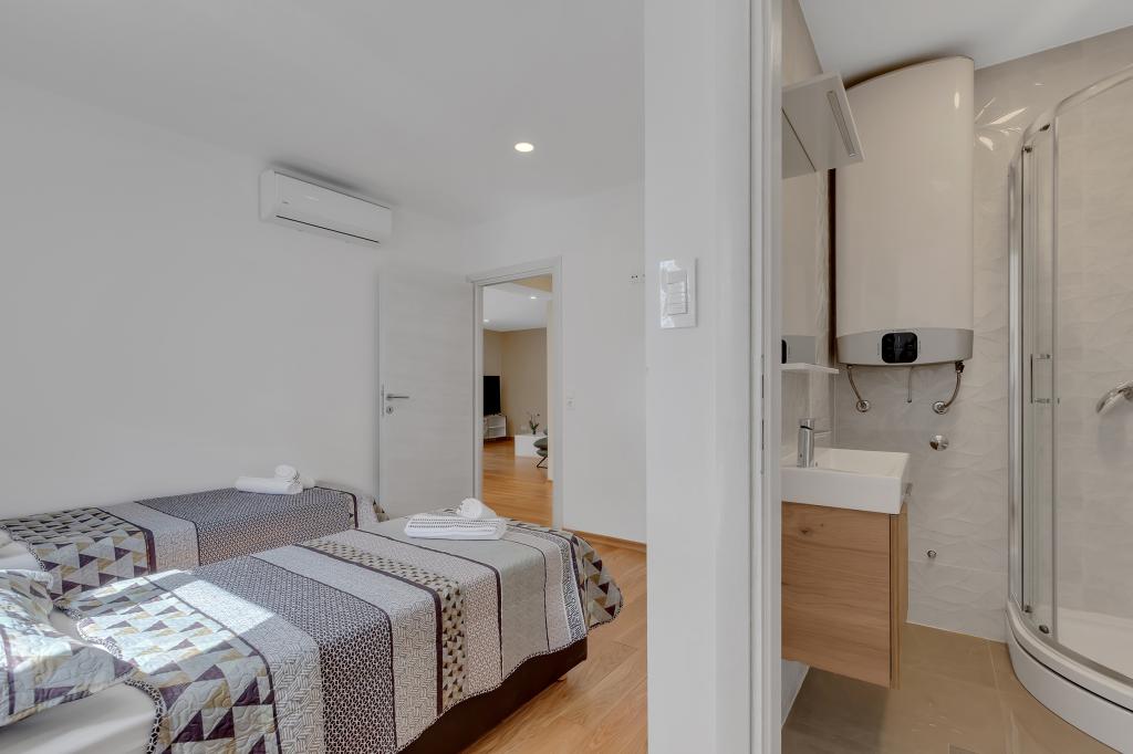Apartament/apartament complet utilat cu doua camere (dublu, pat 180x200, iar celalalt cu 2x paturi separate care se pot conecta daca se doreste), 2 bai, living mare cu bucatarie (impreuna 40m2) Apartamentul are tot ce ai nevoie pentru o perioada lunga de timp. și sejur confortabil și este situat în centrul orașului Makarska
