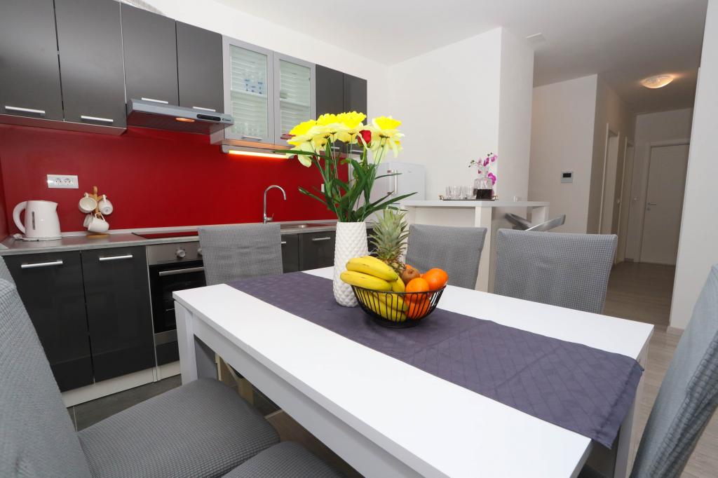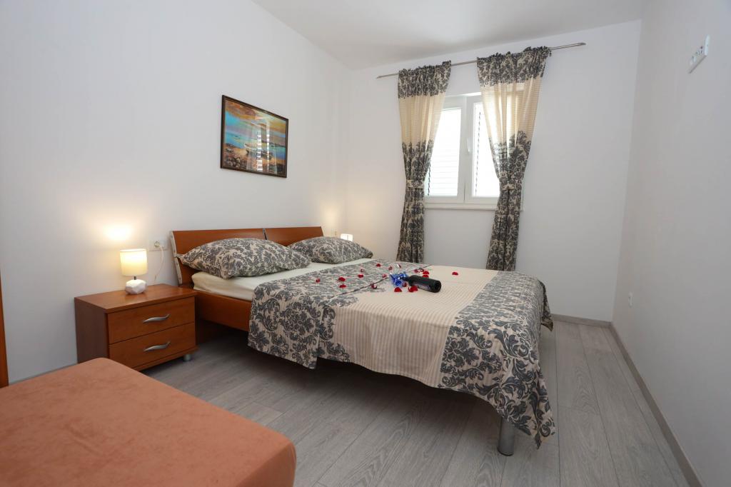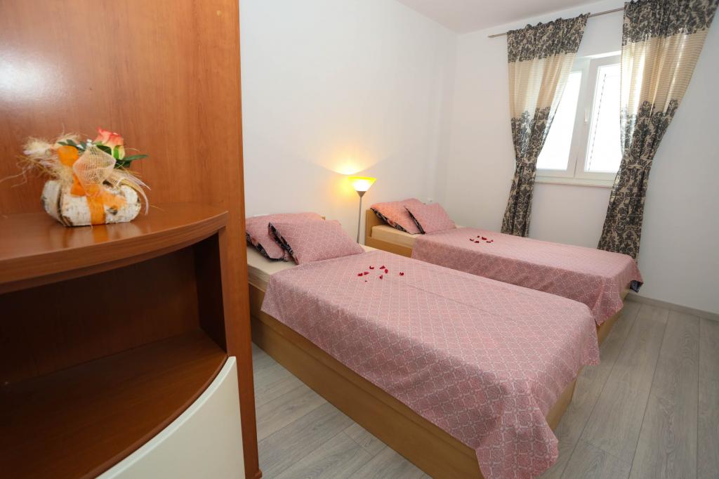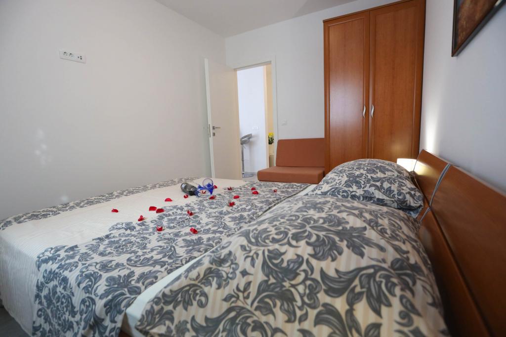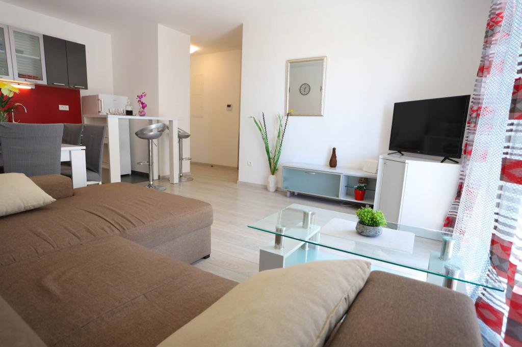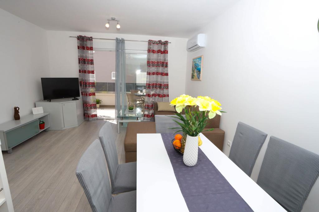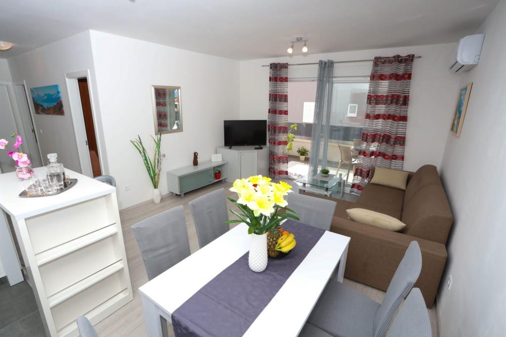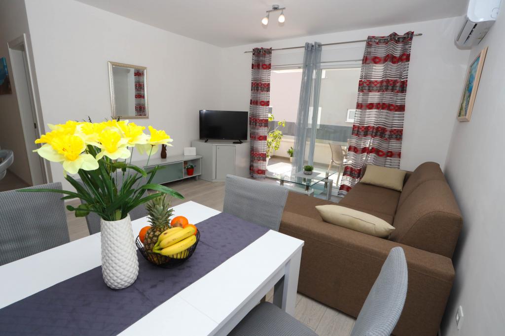 Apartament modern utilat, la primul etaj al unui bloc rezidențial nou, cu lift. Apartamentul are tot ce aveți nevoie pentru o ședere plăcută în vacanță. Apartamentul Petra este format dintr-o sufragerie cu bucătărie utilată, un living cu o canapea extensibilă care servește drept pat suplimentar, o baie și o toaletă mică și două dormitoare. O cameră are un pat dublu, iar cealaltă are două paturi care pot fi separate, dacă este necesar. Proprietatea este situată la 5 minute de mers pe jos de centru sau de cea mai apropiată plajă. În apropiere se află un magazin și un teren de sport pentru recreere.
