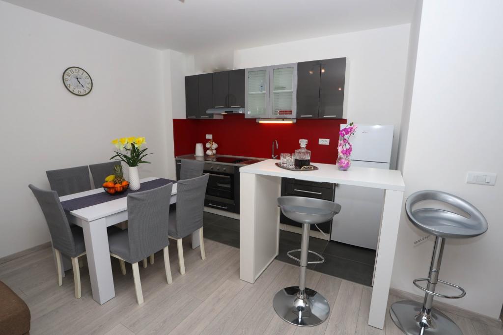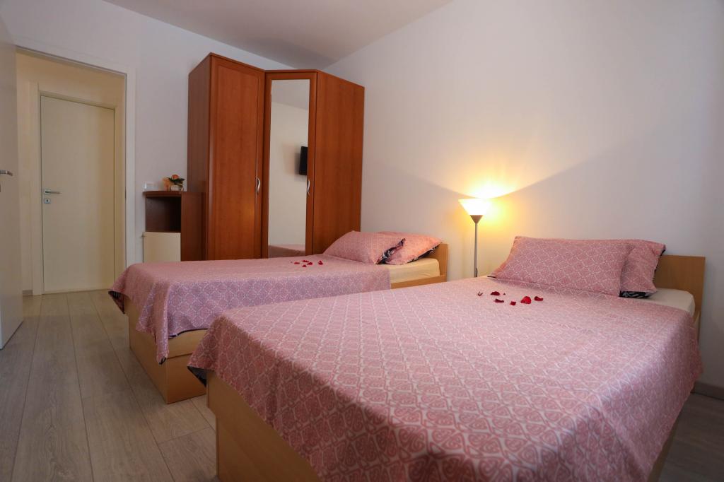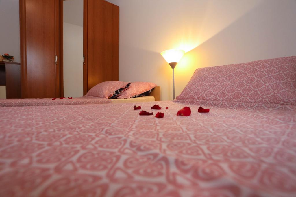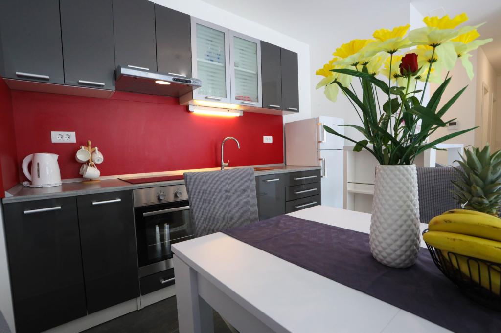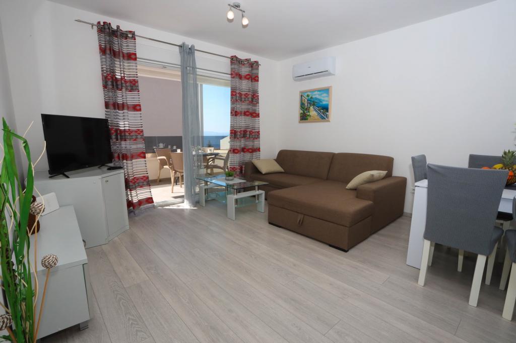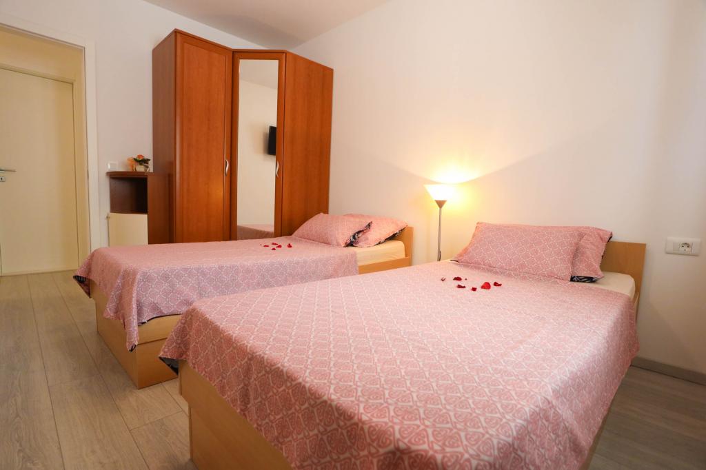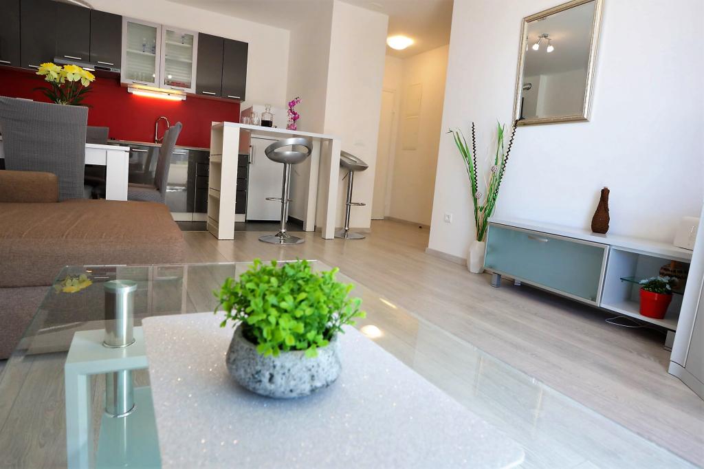 Apartament modern utilat, la primul etaj al unui bloc rezidențial nou, cu lift. Apartamentul are tot ce aveți nevoie pentru o ședere plăcută în vacanță. Apartamentul Petra este format dintr-o sufragerie cu bucătărie utilată, un living cu o canapea extensibilă care servește drept pat suplimentar, o baie și o toaletă mică și două dormitoare. O cameră are un pat dublu, iar cealaltă are două paturi care pot fi separate, dacă este necesar. Proprietatea este situată la 5 minute de mers pe jos de centru sau de cea mai apropiată plajă. În apropiere se află un magazin și un teren de sport pentru recreere.