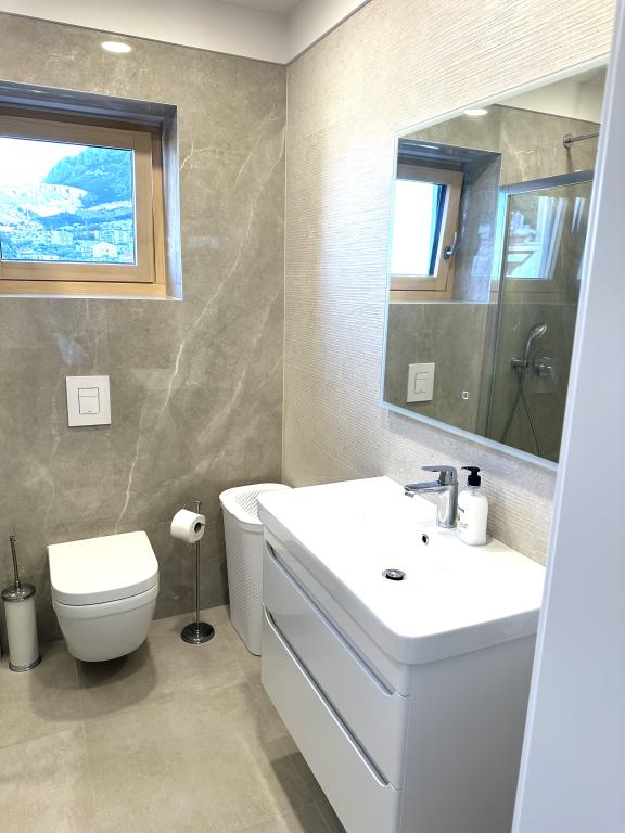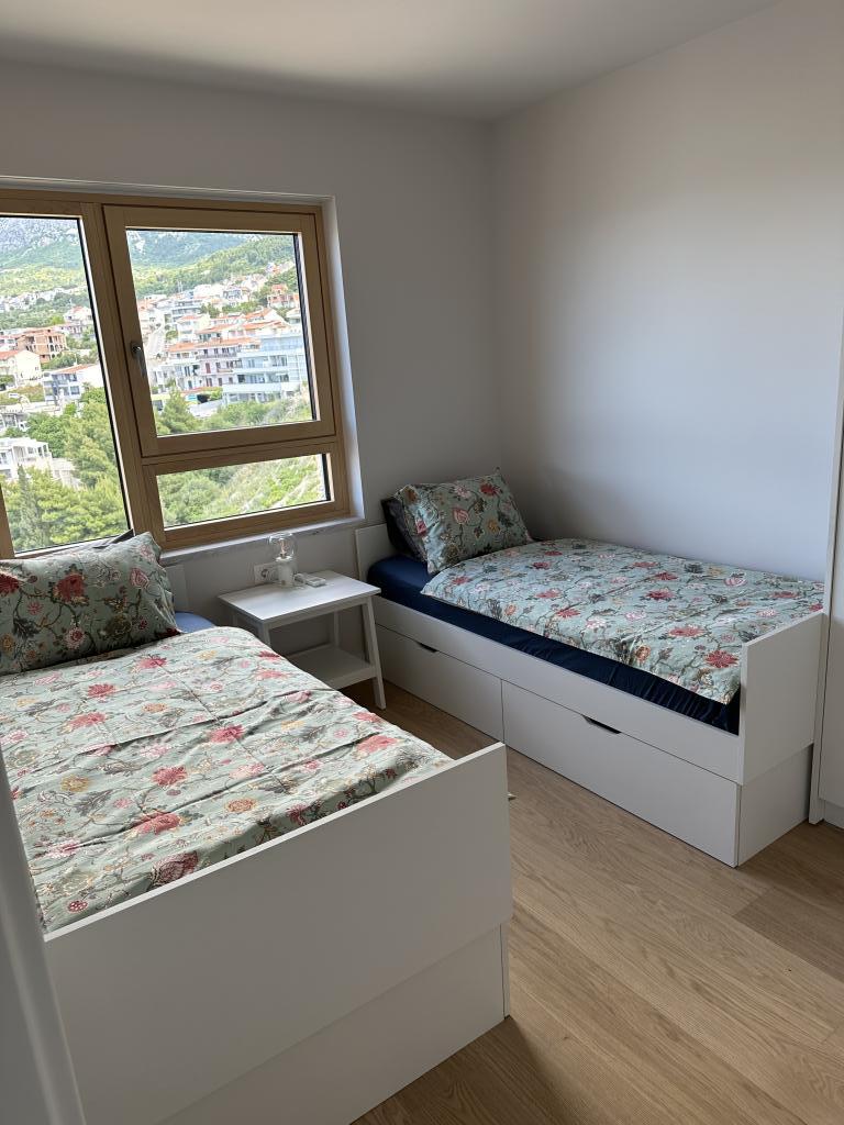 Apartament recent renovat în centrul orașului Makarska. Clădirea a fost construită conform celor mai înalte standarde, mobilată luxos, la fel ca apartamentul în sine! Parcare proprie disponibilă, parcare exterioară nr. 6 pentru mașini alimentate cu GPL și două locuri de parcare la etajul -2; nr. 1 și 2. Apartamentul este situat la etajul 3. Este orientat spre sud-vest. Se compune dintr-o bucătărie cu sufragerie și living într-un model open space. Bucătăria este complet utilată, astfel încât să vă puteți bucura de pregătirea meselor preferate chiar și în timpul vacanței anuale. Baie spațioasă cu cabină de duș și mașină de spălat. Două dormitoare! Dormitorul principal are un pat de 160/200, în timp ce celălalt are două paturi de 90/200. Apartamentul este complet echipat cu lenjerie de pat, prosoape, prosoape de bucătărie și prosoape de hârtie. Săpun lichid și detergent pentru spălatul hainelor, hârtie igienică și detergent pentru vase și tablete pentru mașina de spălat vase. O priveliște frumoasă de pe terasa acoperită se extinde asupra orașului Makarska și a insulelor Brac și Hvar.