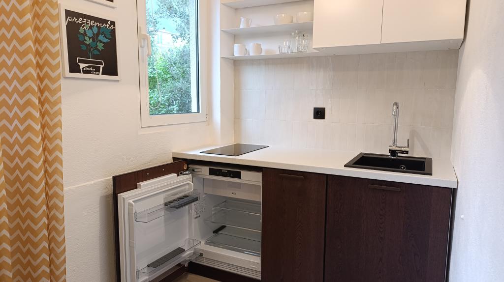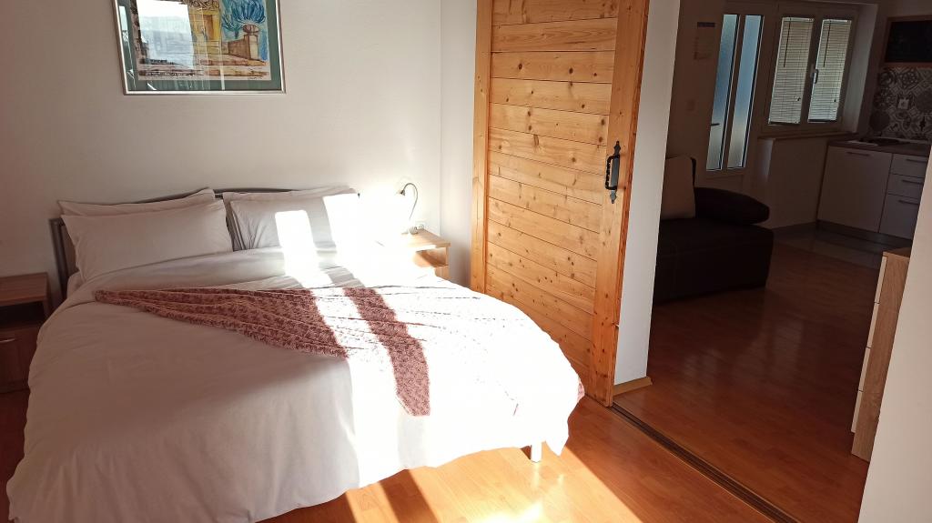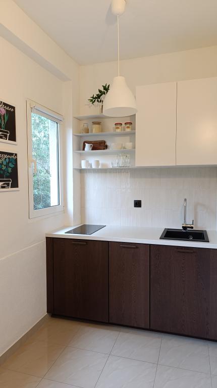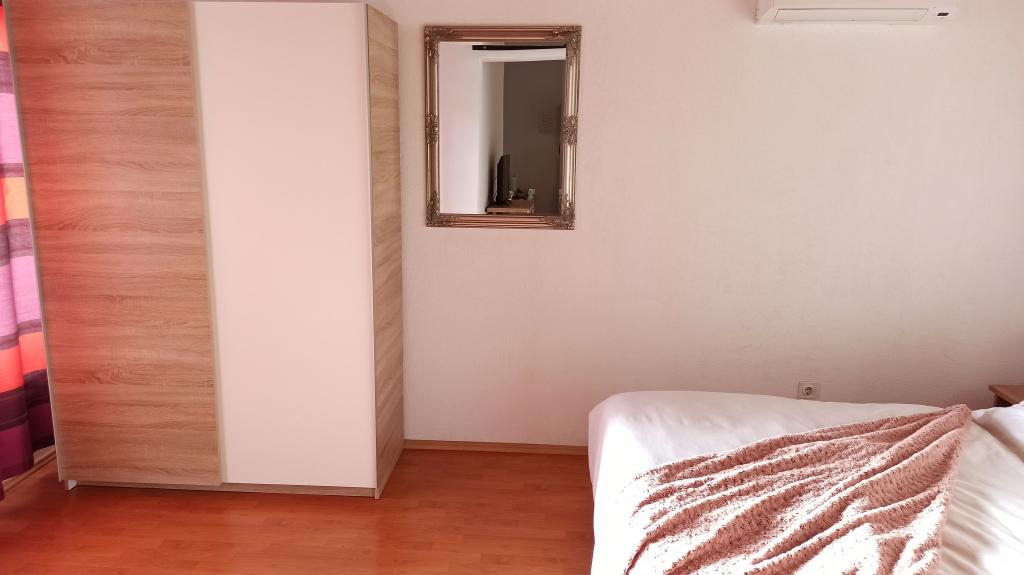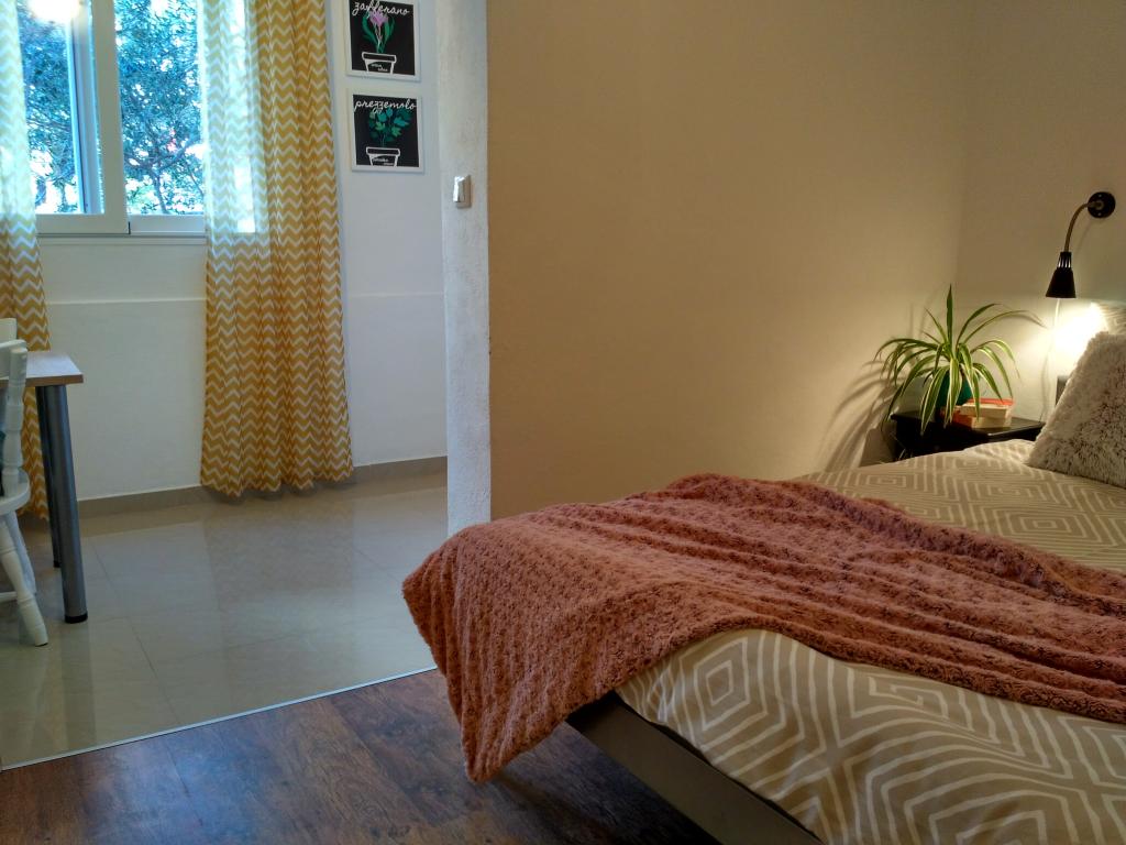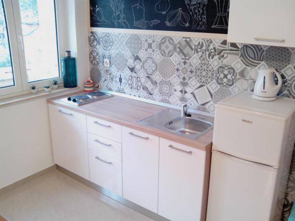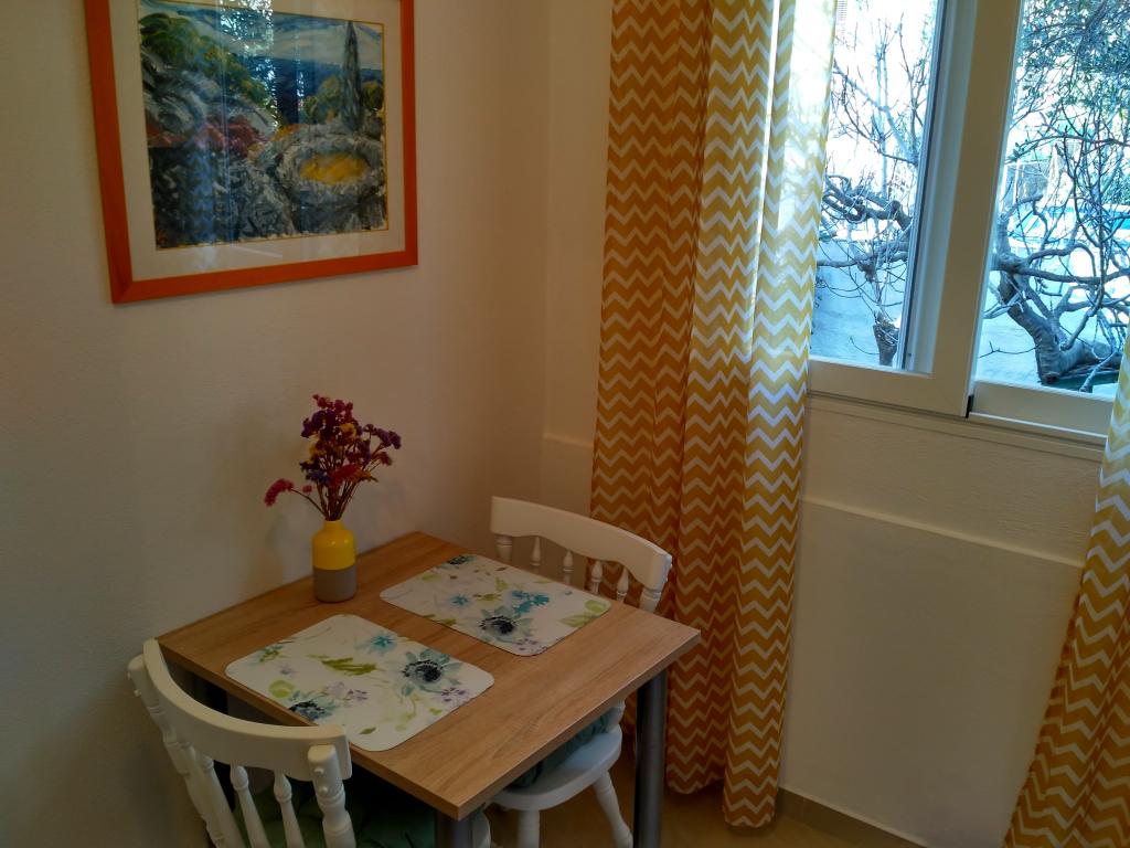 Apartamentul este modest, dar are tot ce ai nevoie în vacanță. Există chiar și un fier de călcat, spre marea încântare a soțului meu, haha. Poți găti cu ușurință cina în apartament, poți spăla rufele de mână (sunt frânghii de rufe afară, la fereastră). Cartierul este liniștit și pașnic, cu vedere la doi copaci frumoși: un smochin și un măslin, și la muntele dincolo. Kruno, gazda noastră, este foarte prietenos și serviabil. Ne-a întâmpinat cu un zâmbet și ne-a luat rămas bun cu același zâmbet. Mulțumim, Kruno, pentru o ședere minunată!