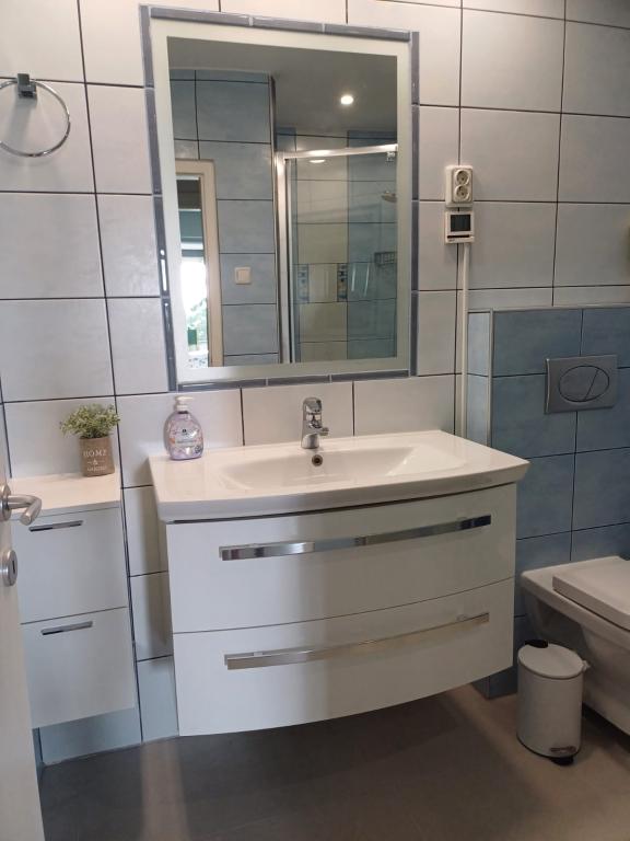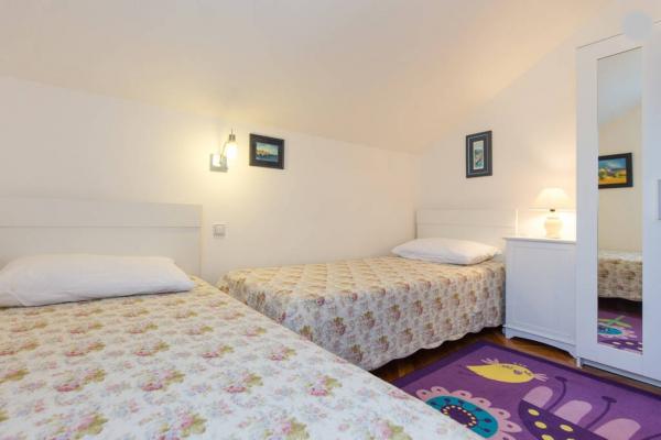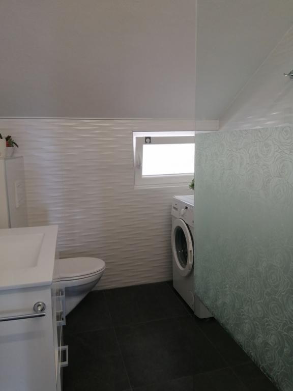 Apartament excelent, spațios, modern, bine proiectat, foarte bine echipat, foarte curat și bine întreținut la etaj, cu o terasă imensă cu vedere la mare. Wifi puternic și stabil, aer condiționat funcțional în toate camerele, multă apă caldă. Bucătărie foarte bine echipată, cu aragaz pe gaz și cuptor electric sofisticat, frigider mare cu congelator imens. Pat confortabil și fără scârțâit. Există doar două apartamente în casă, gazdele locuiesc la subsol. Casa este situată într-o grădină mare și bine întreținută, pinii uriași oferă umbră naturală. Strada este liniștită și bine întreținută, nu există trafic, deoarece este o fundătură. Puteți parca în grădină. Marea este la 5 minute de mers pe jos de casă, pietriș și adâncindu-se încet, nu este periculoasă pentru copiii mici, cca. La 10 minute de plajă în direcția opusă (ideală pentru copii mici), unde se pot închiria șezlonguri și umbrele de soare, dar copacii oferă și umbră. Dușuri în mai multe locuri de pe plajă. Există mai multe restaurante în zonă, portul și promenada sunt la cca. 30 de minute de mers pe jos de casă. Am făcut cumpărăturile mari în Lidl din Krk, care este de cca. 12 km. Orașul merită vizitat. Este un program bun pentru a face o excursie cu barca la insula Cres. Barca mică pleacă din portul Malinska și face escală în orașul Beli de pe insulă. Orașul este situat în zona IV. A fost numit după Bela, conform legendei. Astăzi sunt abia locuite, dar merită aruncate o privire pentru că priveliștea este foarte confortabilă și frumoasă. Mira și Vladimir sunt gazde foarte amabile și atente cu care puteți comunica în germană, dar și în engleză. Vladimir este un maestru al coacerii cu cărbune, a copt pește grozav pentru noi, iar tortul Mira a fost, de asemenea, foarte delicios. Suntem siguri că ne vom întoarce!