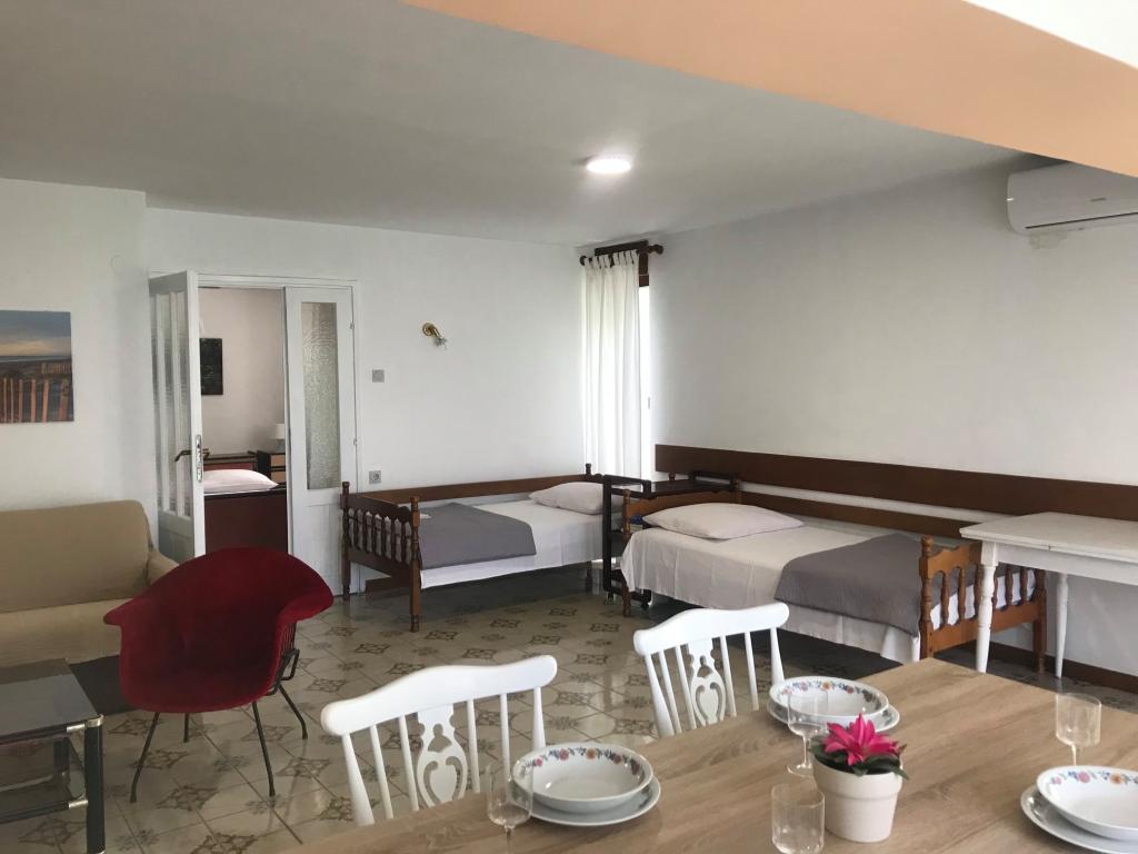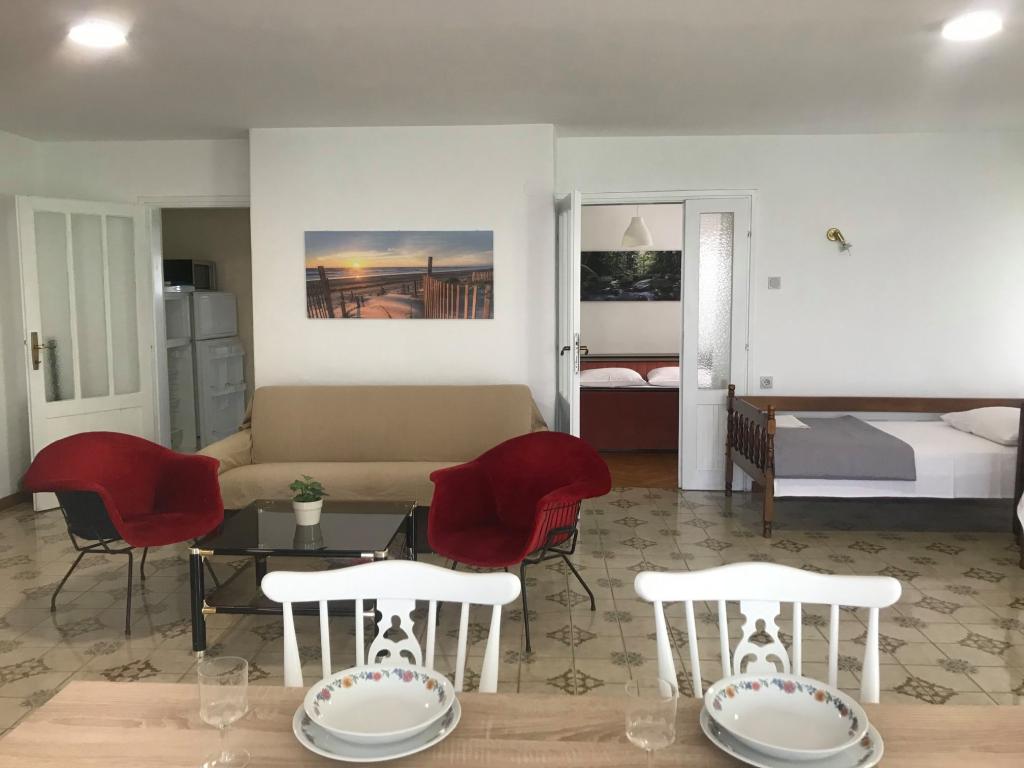 Taxa de rezidenta este inclusa in pret. Document de confirmare a rezervării la rezervareApartamentul 2+2 (55 m2) este situat la parter și este format dintr-un dormitor cu pat dublu, în timp ce două paturi suplimentare sunt situate în living (două paturi cu saltele). Bucătăria este utilată cu vase, frigider cu congelator, cuptor cu microunde, aragaz electric cu cuptor, fierbător și aparat de cafea. Apartamentul are o terasă în față și în spate. Animalele de companie sunt binevenite contra unui cost suplimentar de 5 € pe zi per animal de companie. ------------------------------------------------------------------ Apartamentul 4+2 (85 m2) este situat la primul etaj și este format din 2 dormitoare cu paturi duble, în timp ce 2 paturi suplimentare sunt situate în living. Apartamentul are o baie (duș/toaletă) și o toaletă separată. Bucătăria este utilată cu vase, frigider dublu cu congelator, cuptor cu microunde, aragaz electric cu cuptor, fierbător și aparat de cafea cu filtru. Apartamentul are o terasă mare în față, cu vedere la curte și un balcon cu vedere la grădină.