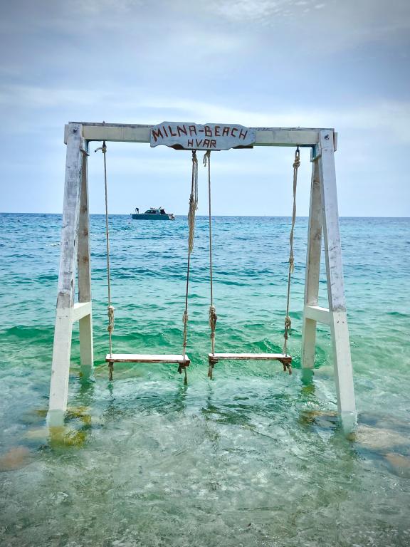 Apartamentele duble și cvadruple, precum și un apartament cu o terasă mare, sunt situate într-o zonă liniștită din Milna. Este situat la 5 minute de centru si prima plaja. Potrivit pentru familii cu copii. Apropierea orașului Hvar (3 km) este potrivită și pentru tineri, unde în timpul zilei se bucură de beneficiile orășelului Milna și ale golfurilor ascunse pentru înot, iar noaptea orașul Hvar le oferă divertisment nocturn de neuitat. .
